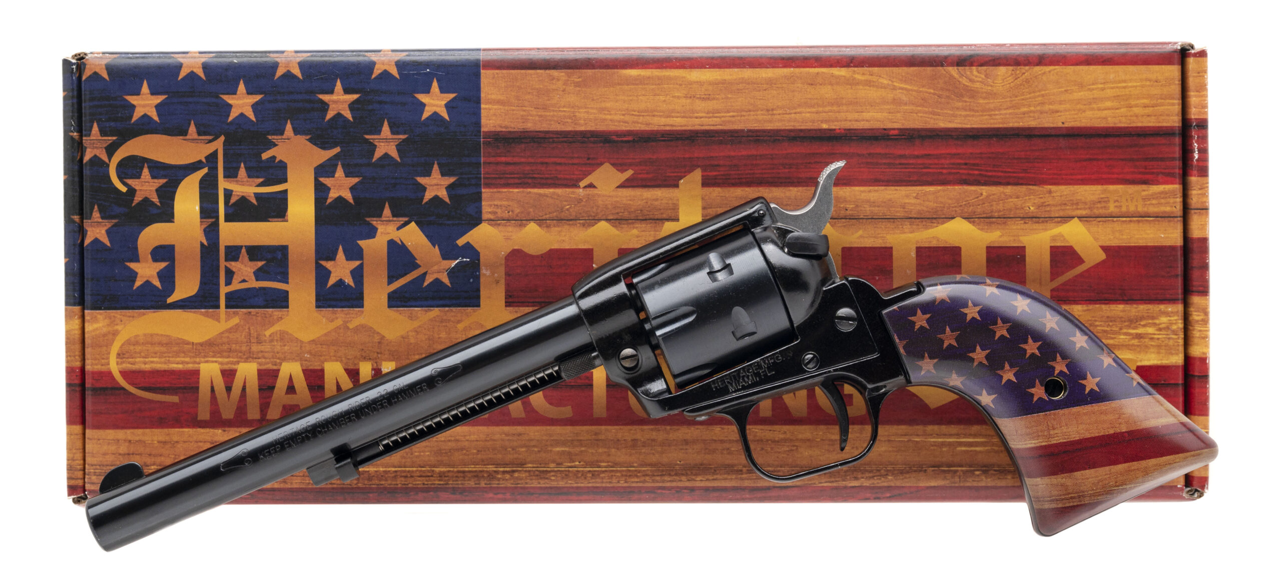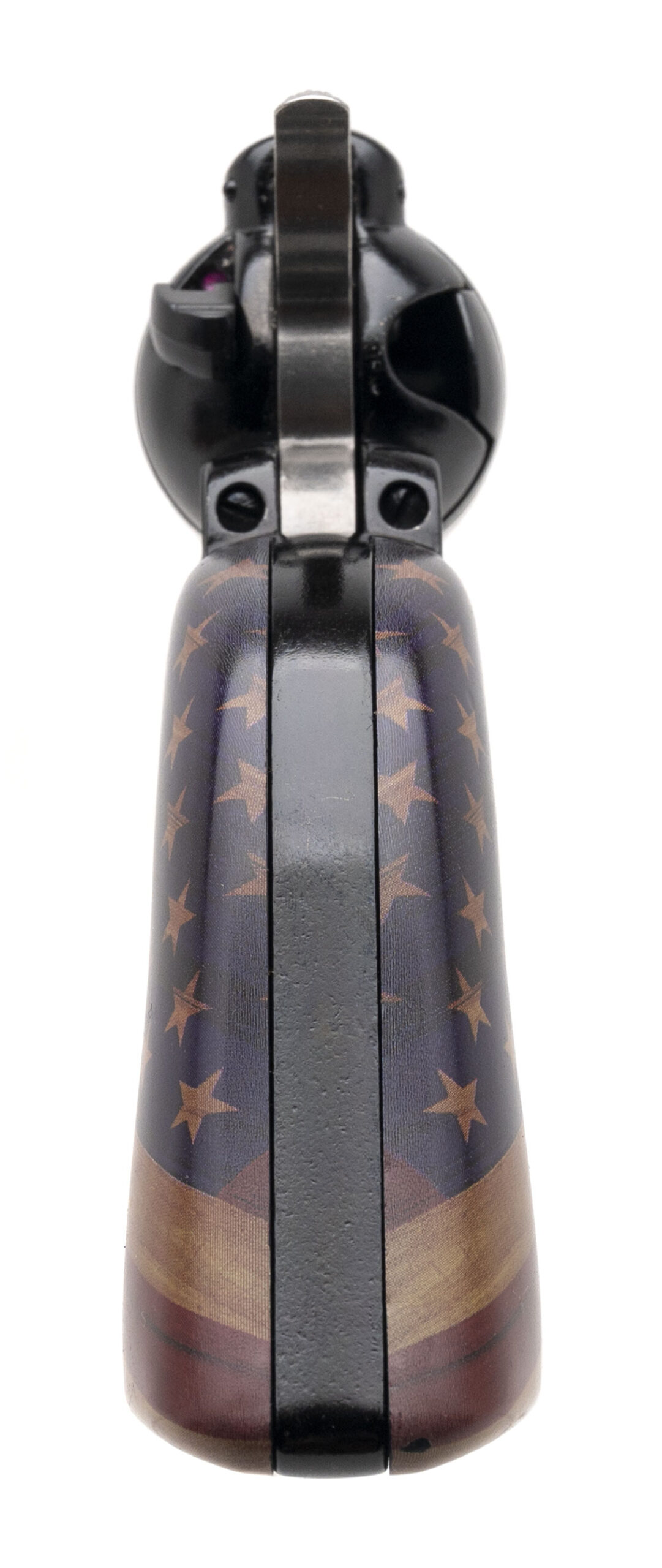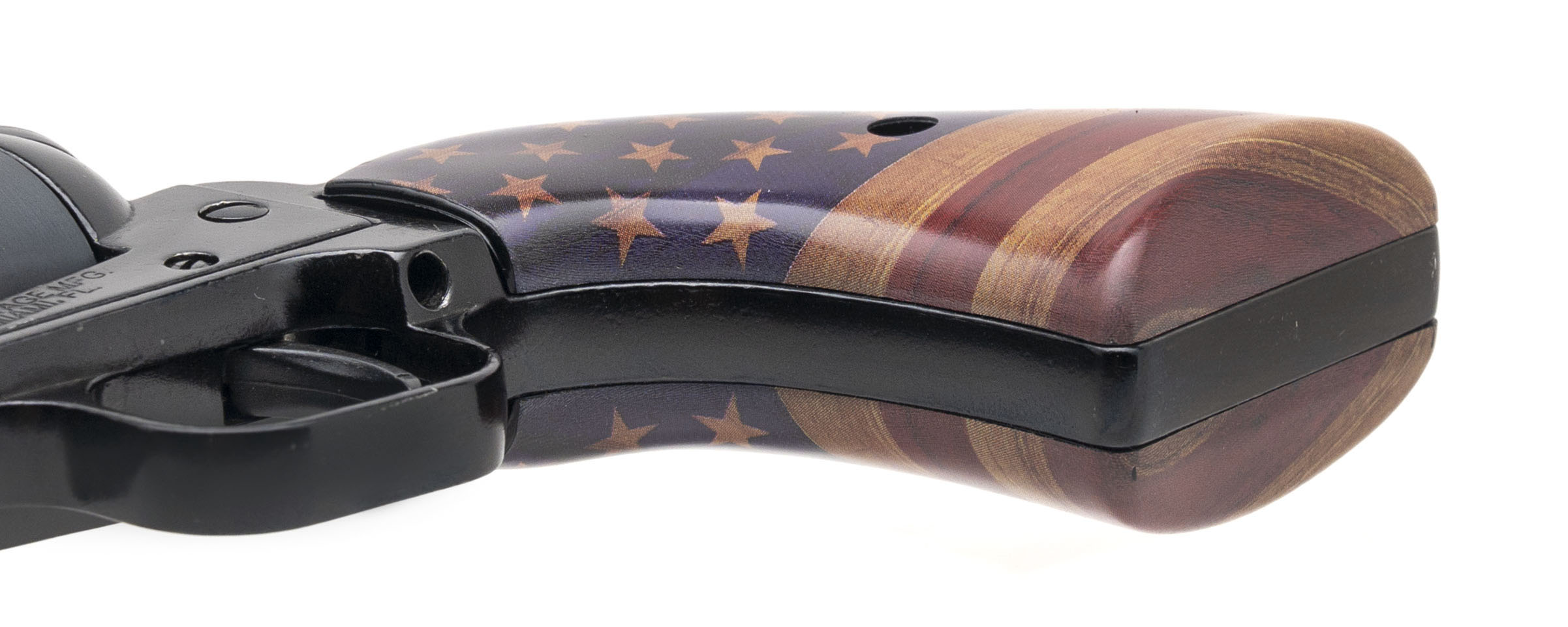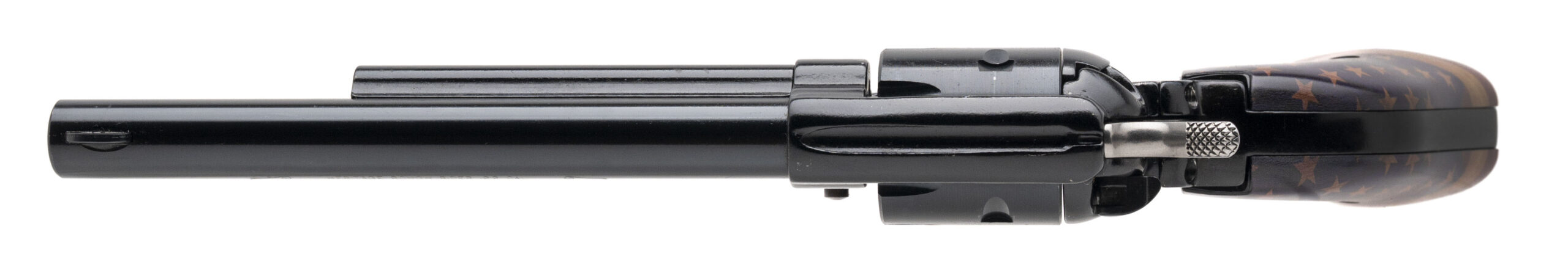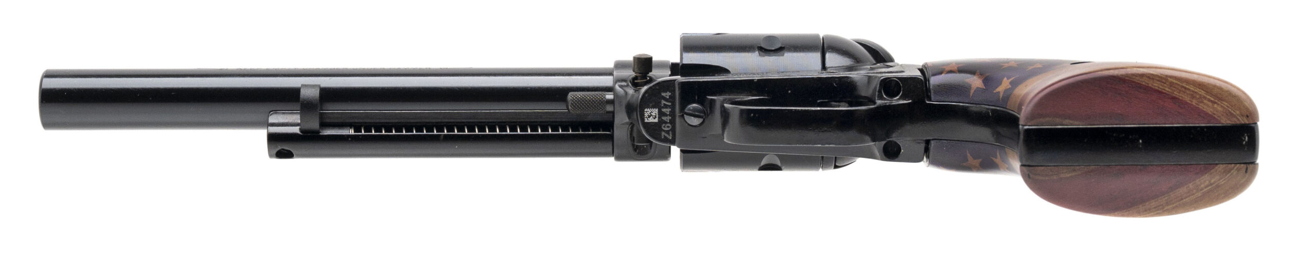 SN: Z64474. Modern production, .22LR with a 6.5" barrel. Bore is very good. Alloy Framed Single-action only rimfire revolver with a 6rd cylinder, bladed front sight, blued finish, and U.S. flag grips. Finish shows some wear with minor marks throughout. Includes original box. Overall condition is very good.