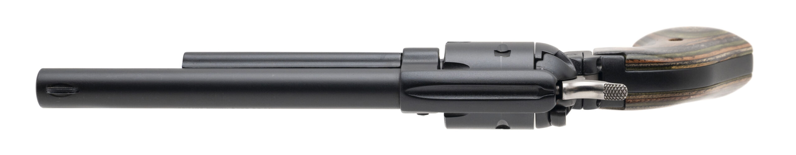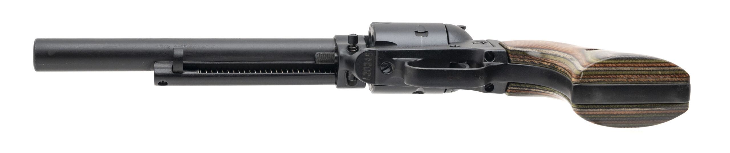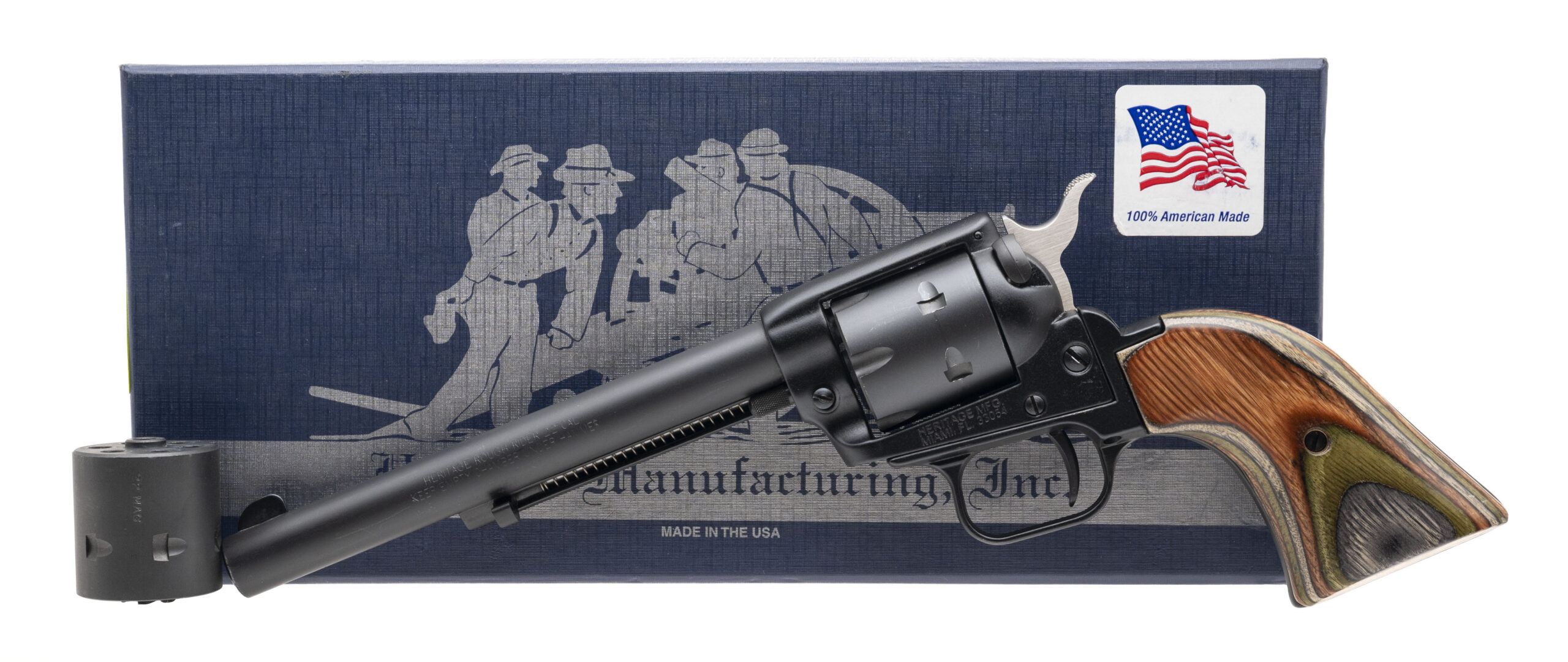 SN: 130346. Modern production, .22LR with a 6.5" barrel. Bore is very good. Single-action only rimfire revolver with a bladed front sight, 6rd cylinder, black satin finish, and laminate wood grips. Finish shows light handling marks. Overall condition is very good. Includes an additional 6rd .22 WMR cylinder which shows light handling marks, and original box.