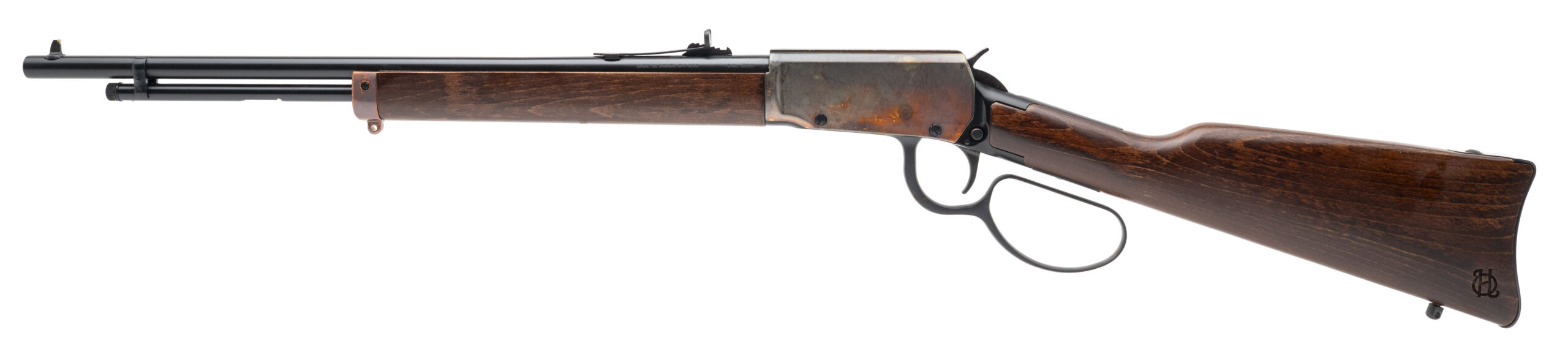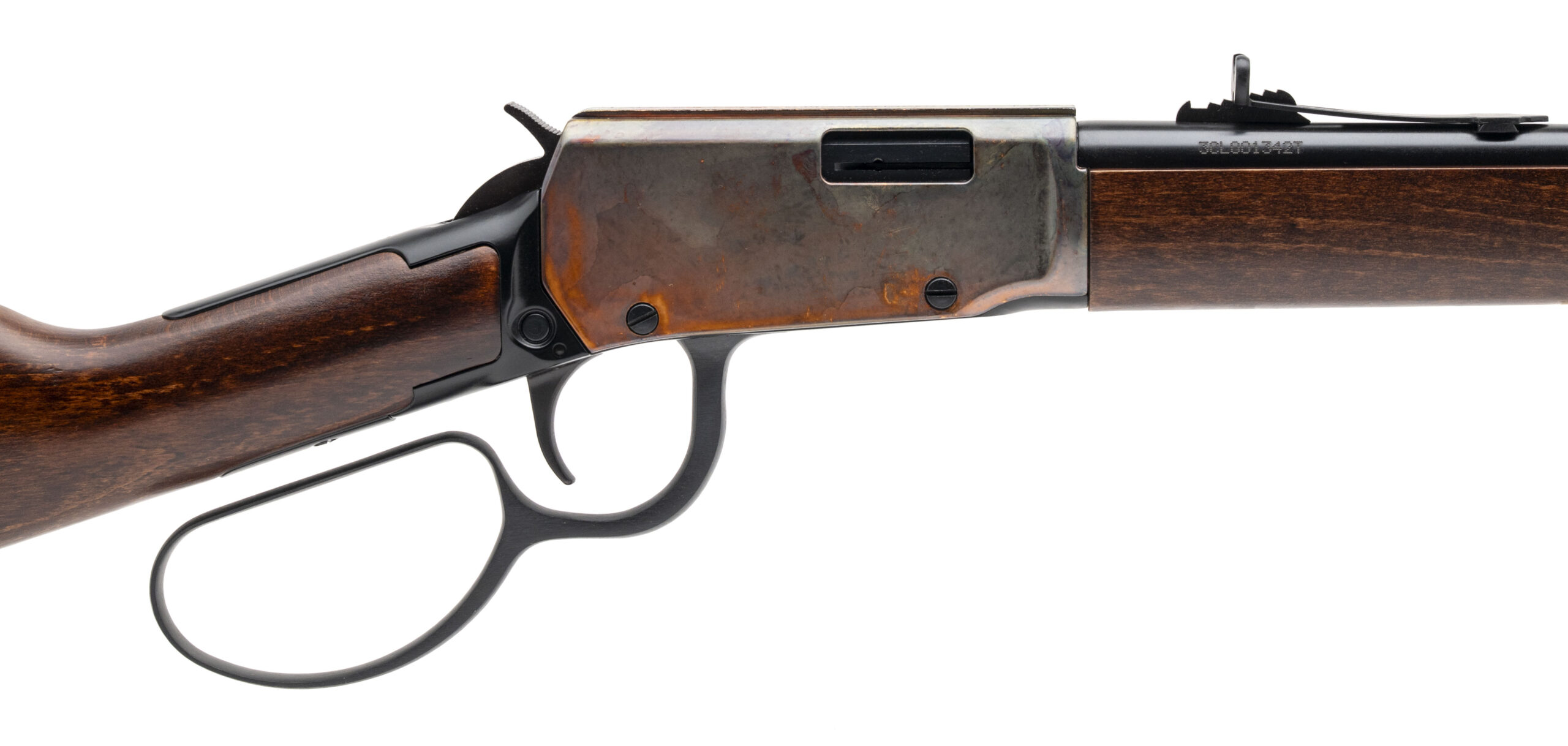 SN: 3CL001342T. Modern production, .22LR with a 20" barrel. Bore is very good. Brazilian made lever-action rifle a beaded front sight, adjustable semi-buckhorn rear sight, large loop lever, color case hardened receiver, and wood stock & forend. Finish & stock show minor handling marks. Overall condition is very good.