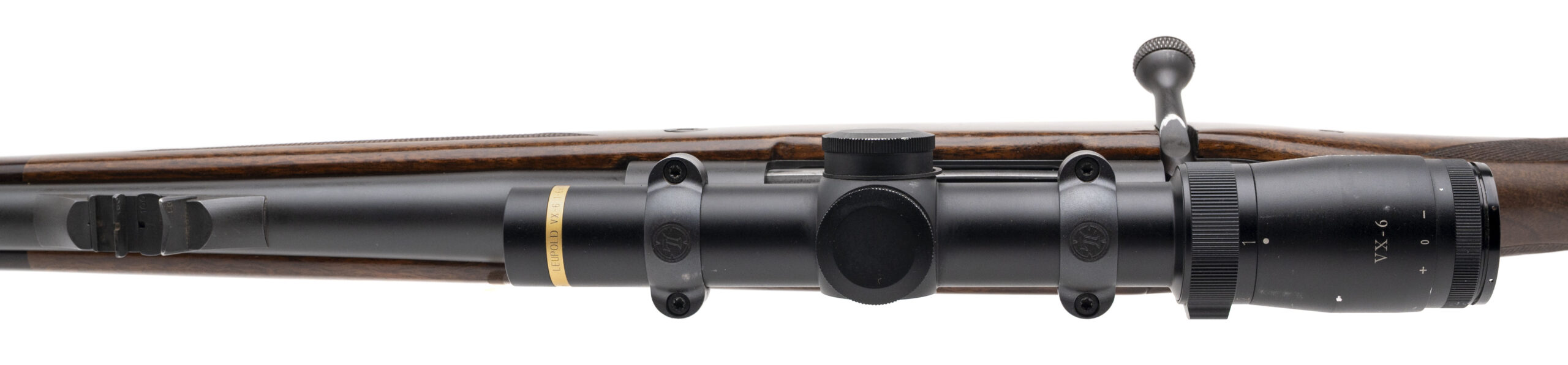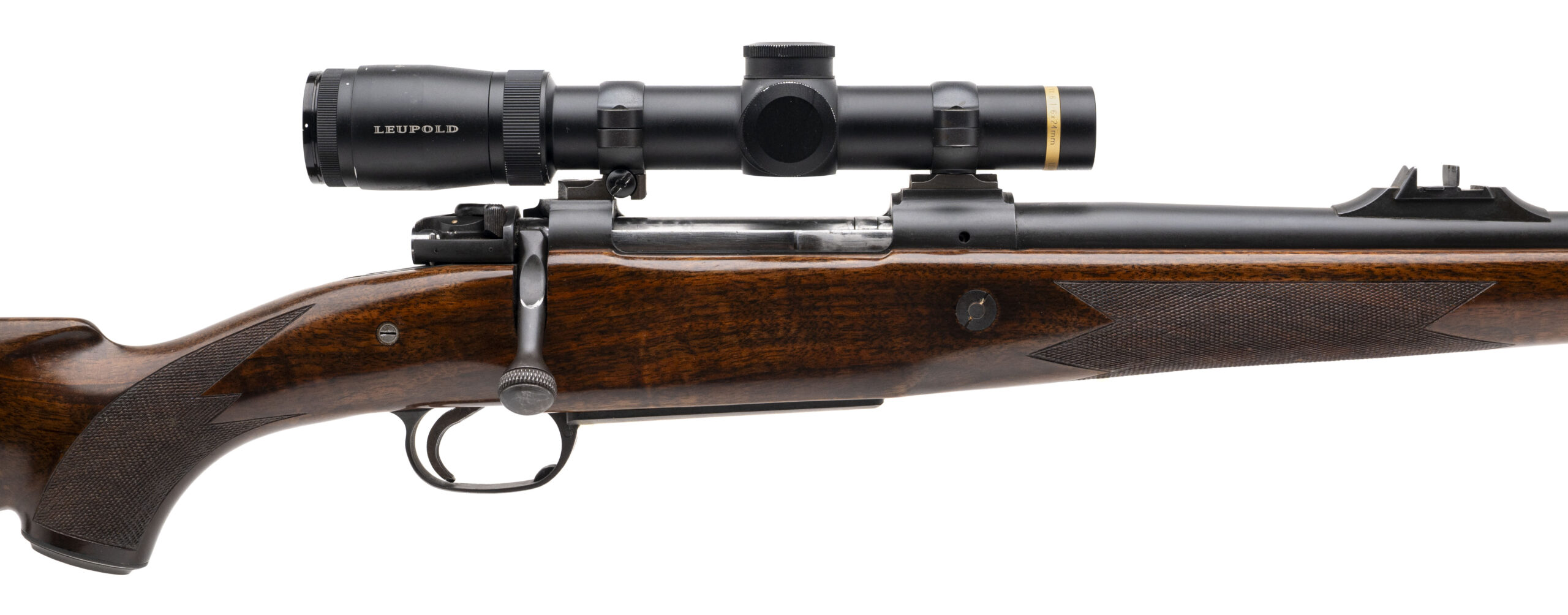 SN: 10225, modern production made in Germany. Big bore bolt action safari rifle chambered in 375 H&H Magnum with a 24” barrel, ramped front sight with island express rear sight and barrel band sling swivel. Double square bridge magnum action, control round feed with full length claw extractor and 3 position safety and a hinged bottom metal. Checkered walnut stock with a 14" LOP, rosewood forend tip, 2 cross bolts, trap door grip cap, and red rubber recoil pad. Comes with Leupold VX-6 1-6 scope. Some light wear noted but overall in very good condition.
