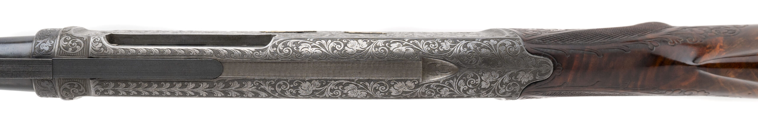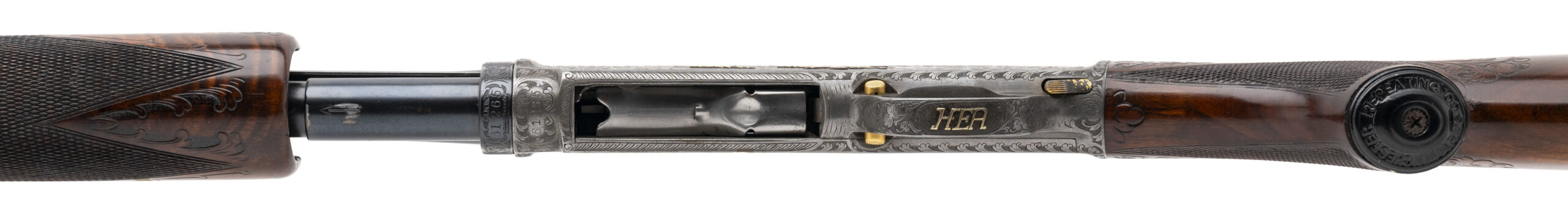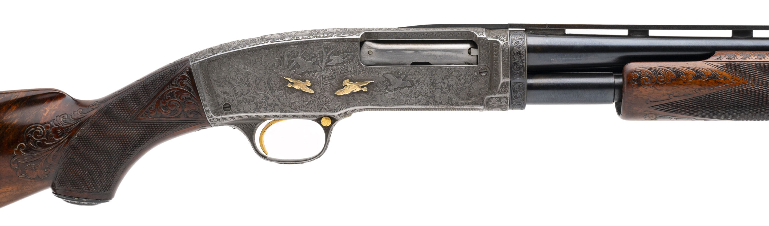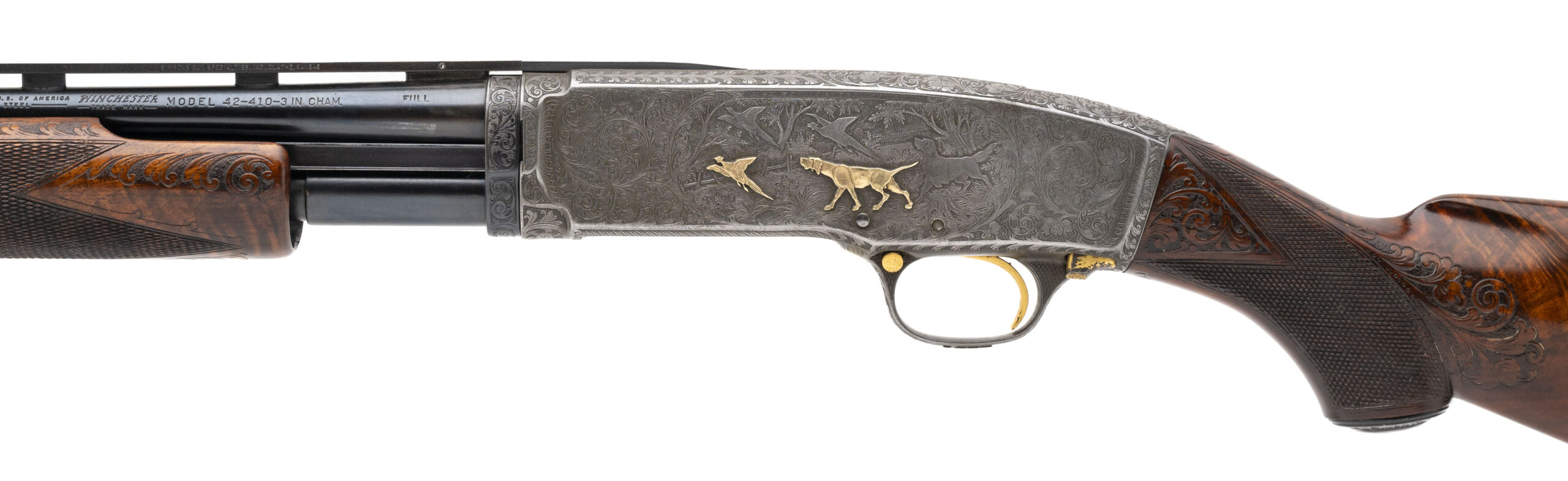 SN: 61265, made in 1947 by Winchester and later engraved and upgraded by H&H Zehner of Frankfurt. 410 pump action shotgun with a 26” barrel, 3” chamber and fixed full choke and added Simmons vent rib with white front and middle bead. The action has been fully engraved with fine scroll and game scenes on both side with a deep relief gold inlay dog with flushing pheasant on one side, 2 pheasant on the other and the initials HEA on the trigger guard which stand out nicely from the coin finish receiver. The trigger, safety and slide release are gold plated and the Receiver extension on the barrel is scroll engraved to match. Custom stock and forearm hand made from highly figured American walnut using the original butt plate and grip cap with intricate scroll carving to accent and border the hand cut checkering on both the stock and forearm. LOP is 14” with a drop of 1 5/8” to 2 3/8” and a total weight of 6 lbs 6 oz.
