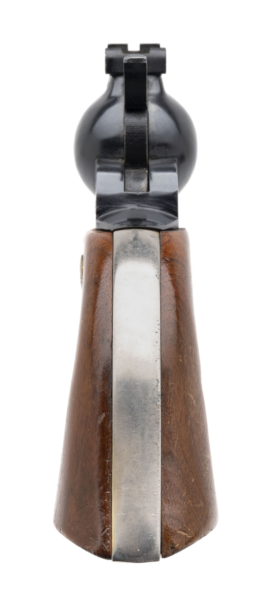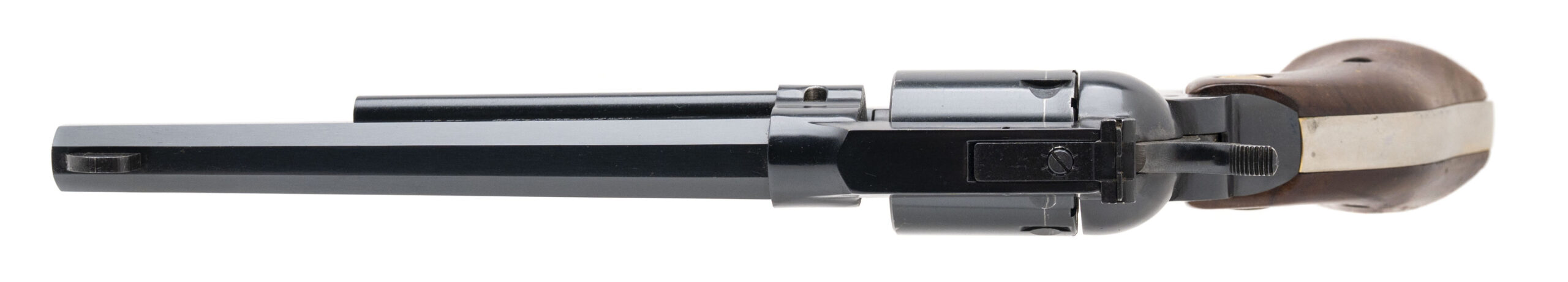SN: M053013. 1980s vintage, .22 Cal. with a 7" octagon barrel. Bore is excellent. Single-action rimfire revolver with bladed front sight, adjustable rear sight, blued finish, and wood medallion grips. Finish and Grips show minor wear with minor handling marks throughout. Overall condition is very good.