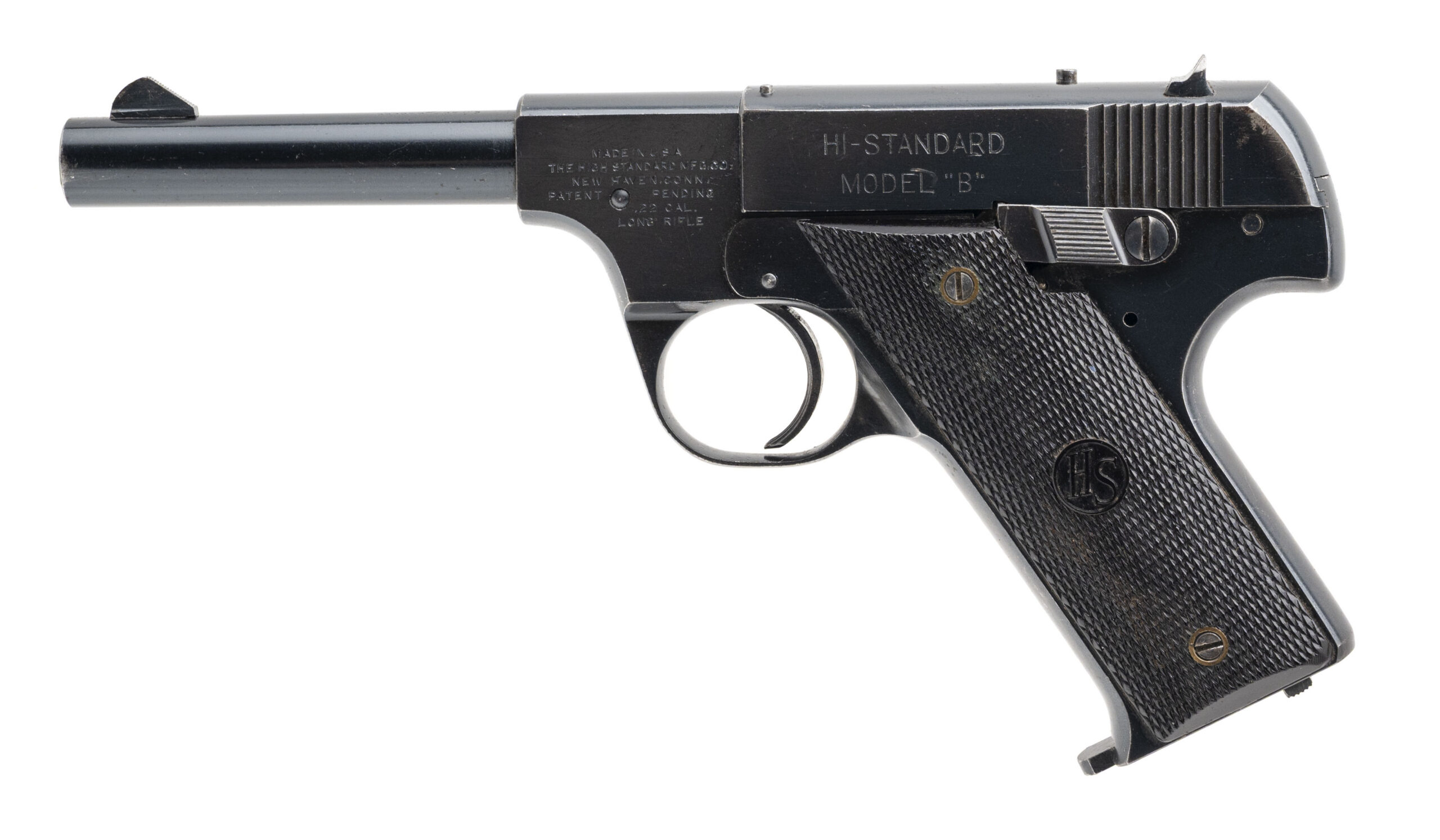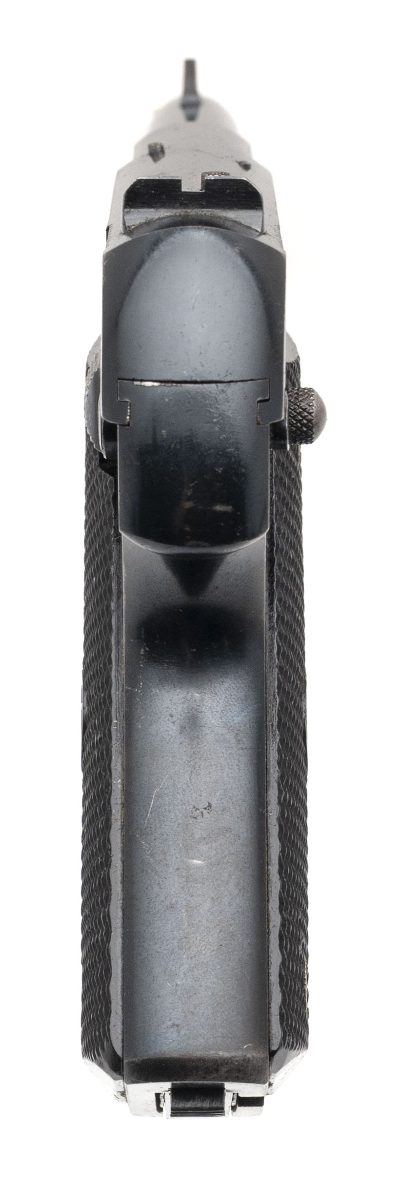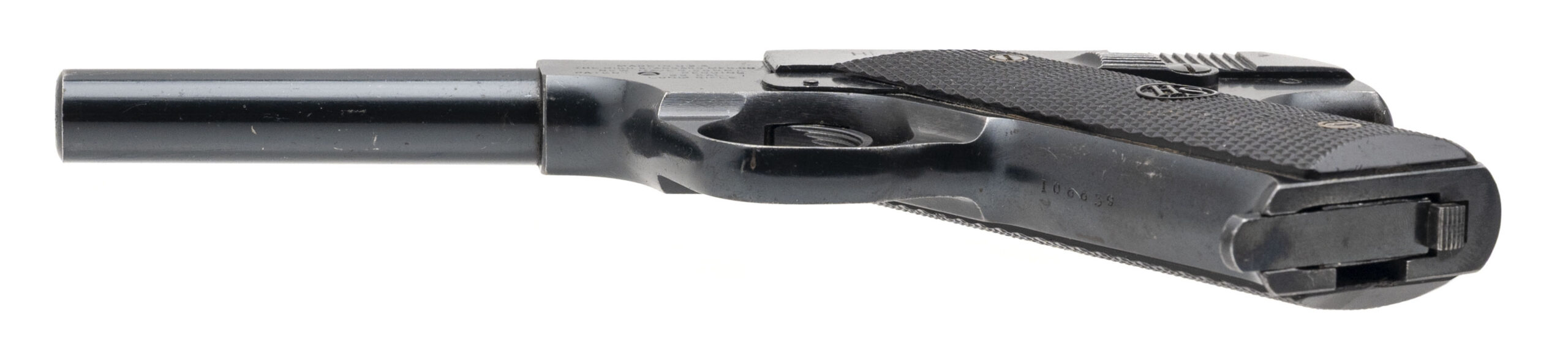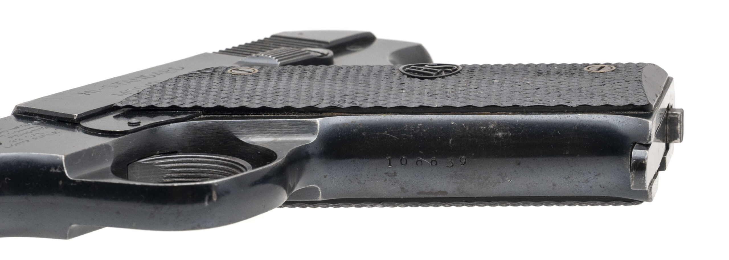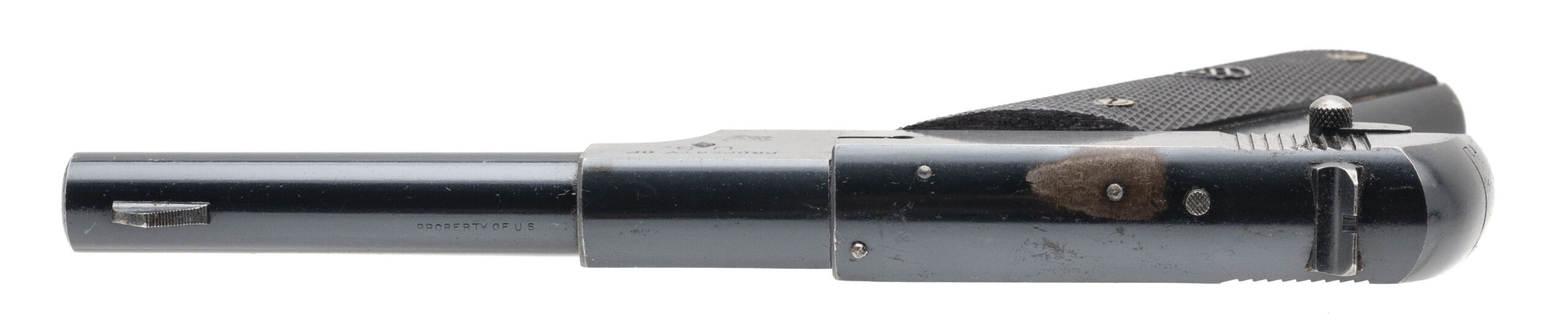 SN: 106639. Semi-automatic US Military training pistol made by High Standard c. 1943. 4½" barrel chambered for .22LR. Very good condition overall with typical handling marks for a trainer pistol, and a patch of cleaned scale on the rear left corner of the slide. Slide is also missing a patch of blue around the firing pin retaining pin. About 95% of original blue remaining. Matching slide serial. Frame is marked "PROPERTY OF U.S." with a partial crossed cannons stamp beneath it. Barrel is also marked "PRORPERTY OF U.S." Checkered black "HS" monogram grips are great with a few small handling marks. Bore is excellent.