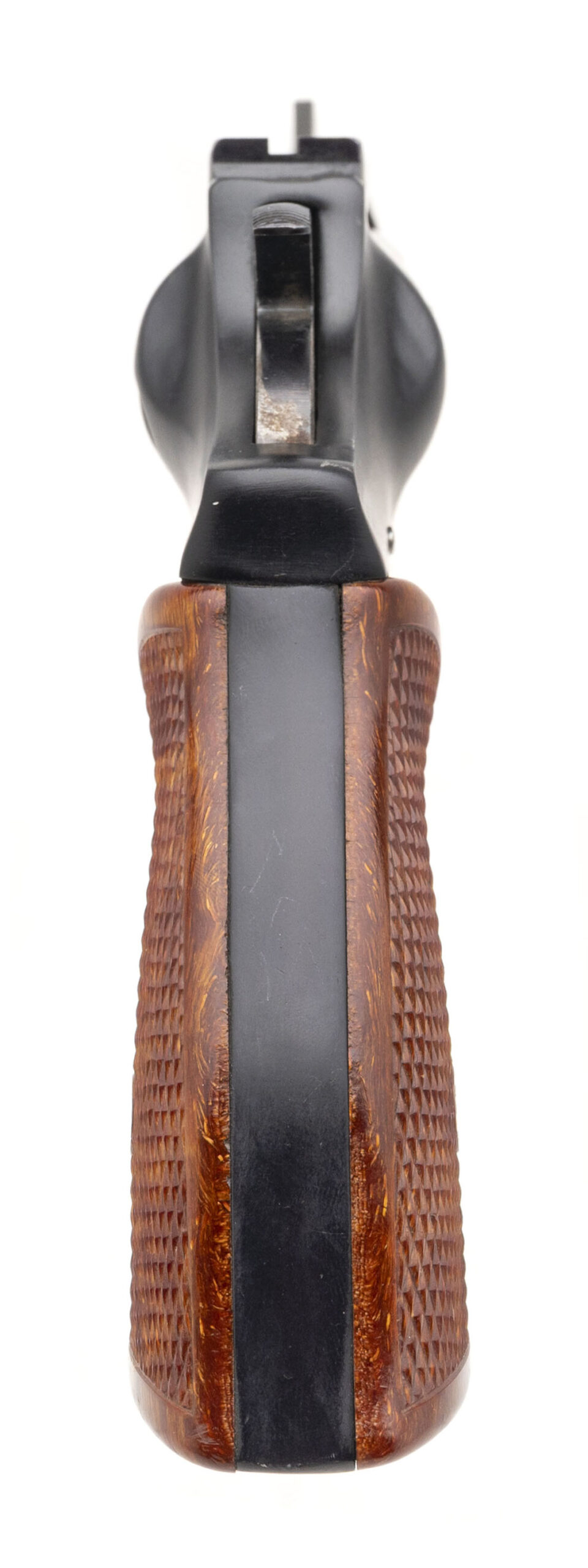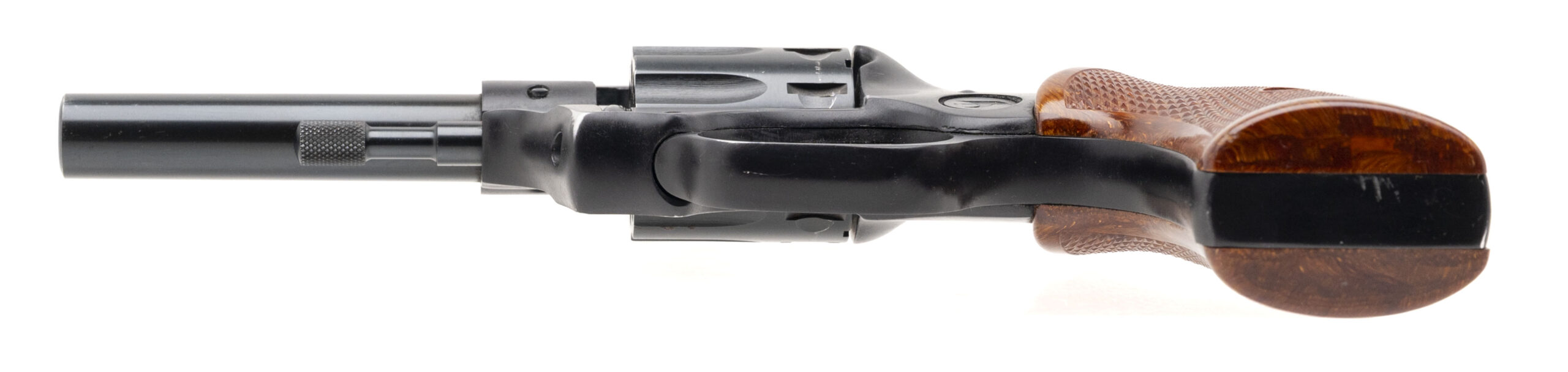SN: 2140688. 1970s vintage, .22 Cal. with a 4" barrel. Bore is very good. Alloy frame double-action rimfire revolver with a 9rd cylinder, blued finish, and checkered wood grips. Finish & grips show minor marks. Overall condition is very good.