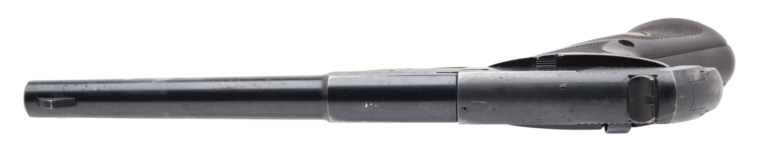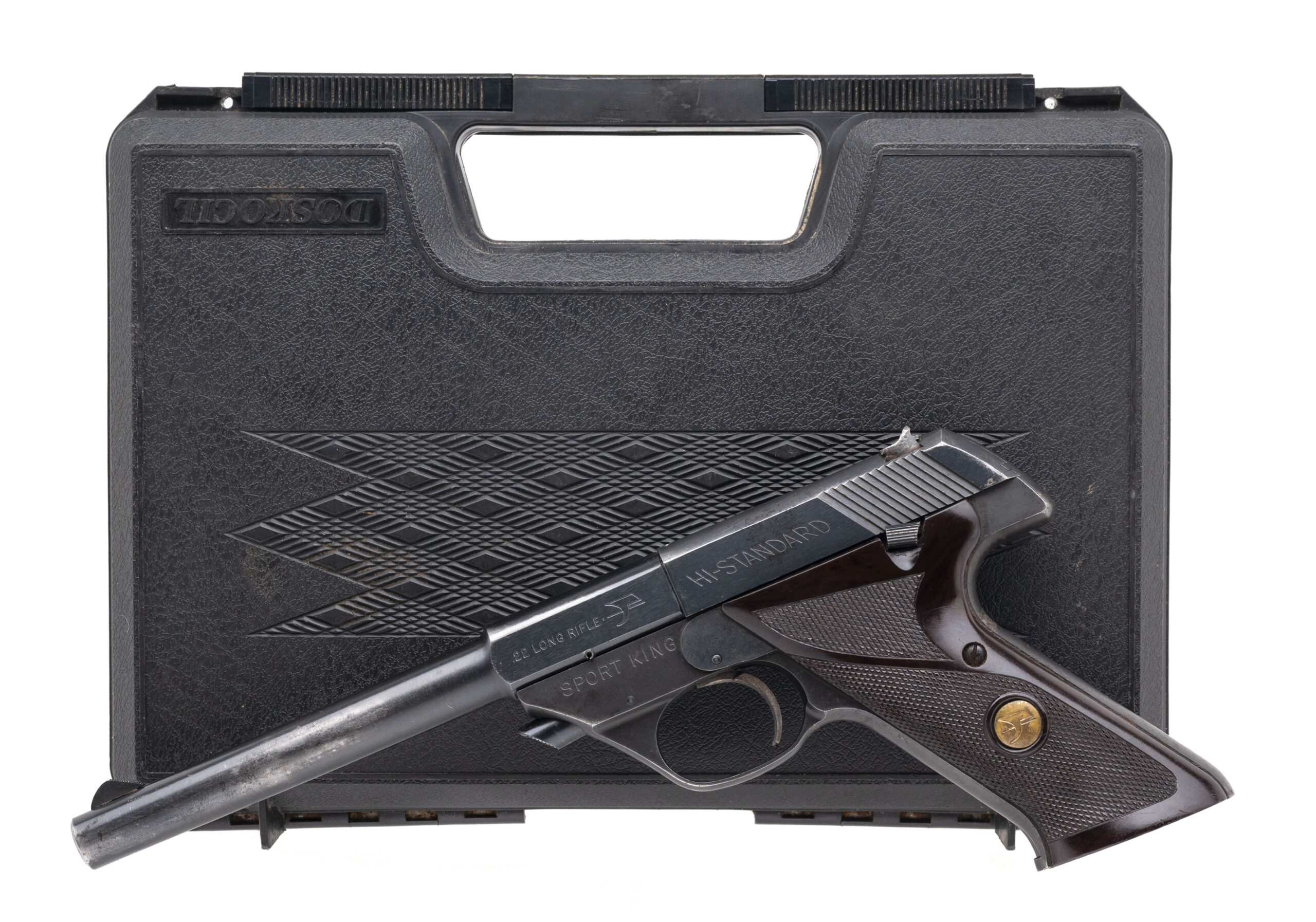 SN: 2080359. Made in 1968, .22LR with a 6.75" barrel. Bore is very good. Semi-auto rimfire pistol with manual thumb-safety, blued finish, and brown checkered medallion plastic grips. Metal shows minor marks and wear but with most of the finish present. Includes an additional 5.5" parkerized target barrel w/scope mount rail, and Doskocil pistol case. Overall condition is very good.