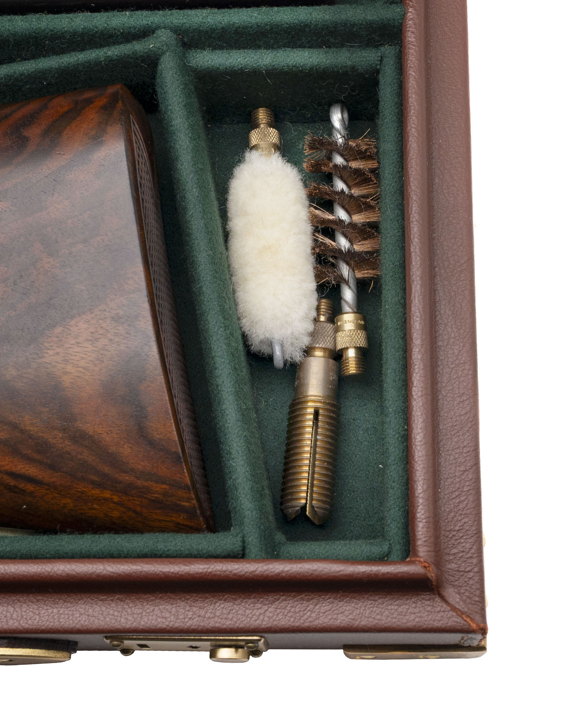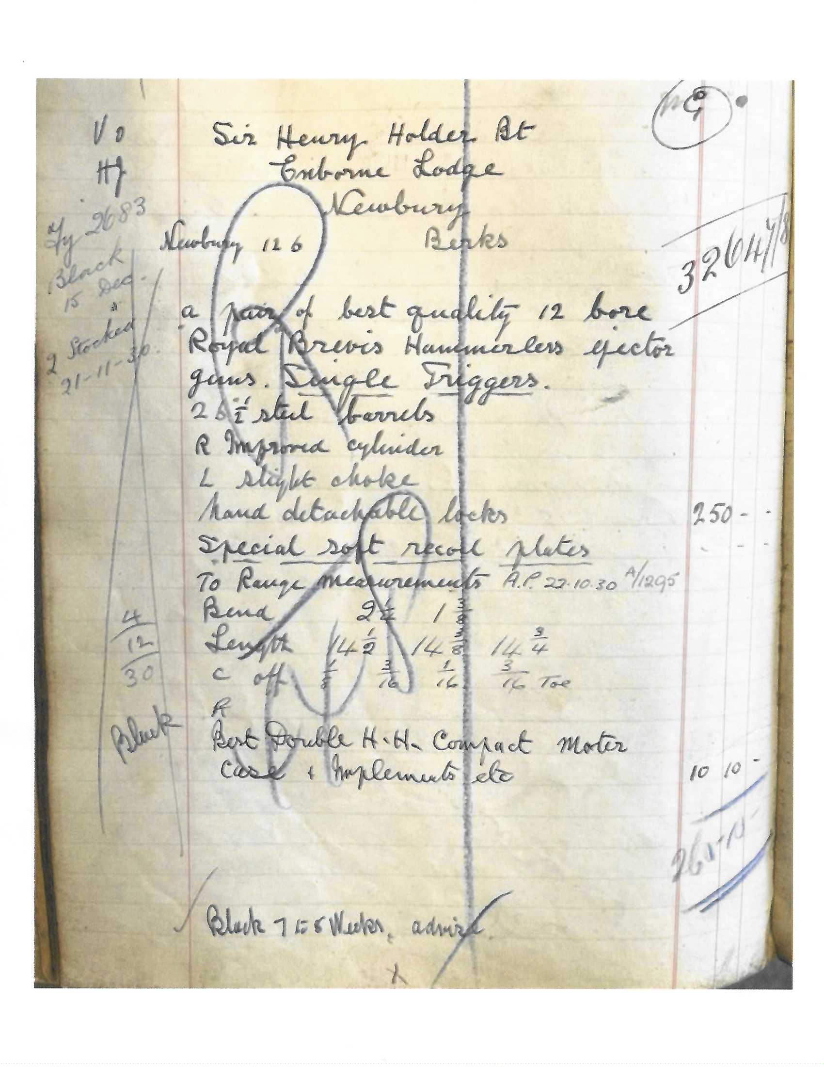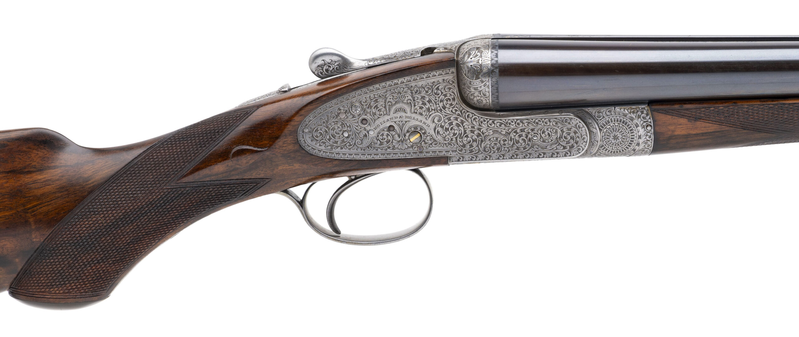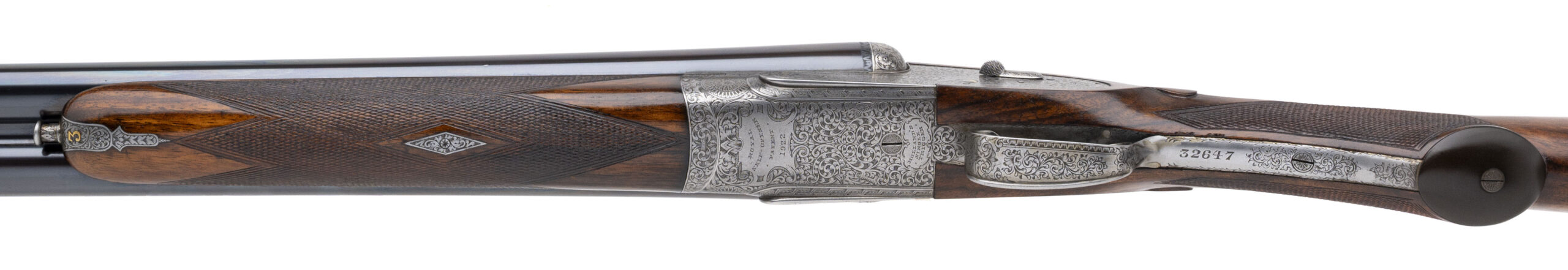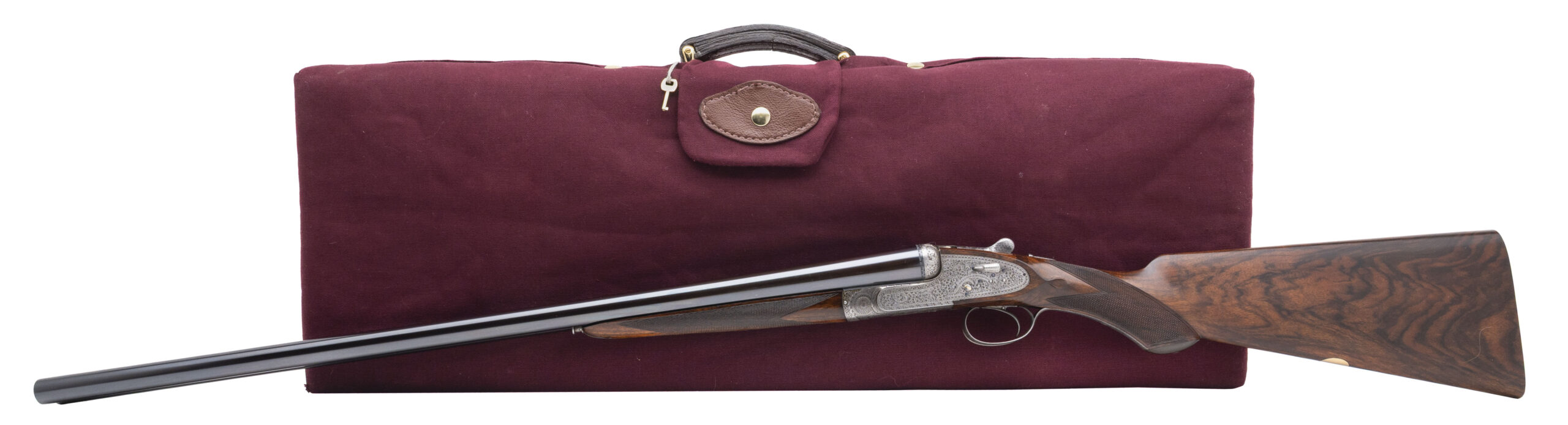 Sn: 32647 made in London circa 1931. Beautiful London best gun, one out of a set of at least 3. 12 gauge side by side with 27” chopper lump barrels, 2 ¾” chambers and fixed chokes measuring .009/.018 (IC/MOD). Self opening side lock with a single non-selective trigger, ejectors, cocking indicators, automatic safety and detachable lock plates. Gorgeous circasian walnut furniture, splinter forearm and prince of whales stock with a 15 ¼” LOP to the solid checkered butt and a drop of 1 3/8” to 2 ¼” featuring a horn grip cap and blank gold oval. High polish deep blue or “blackened” barrel and the action is fully covered in best quality traditional British rose and scroll hand engraving. Overall a fantastic English double built to the highest quality. Comes with Holland & Holland leather luggage case with canvas cover.