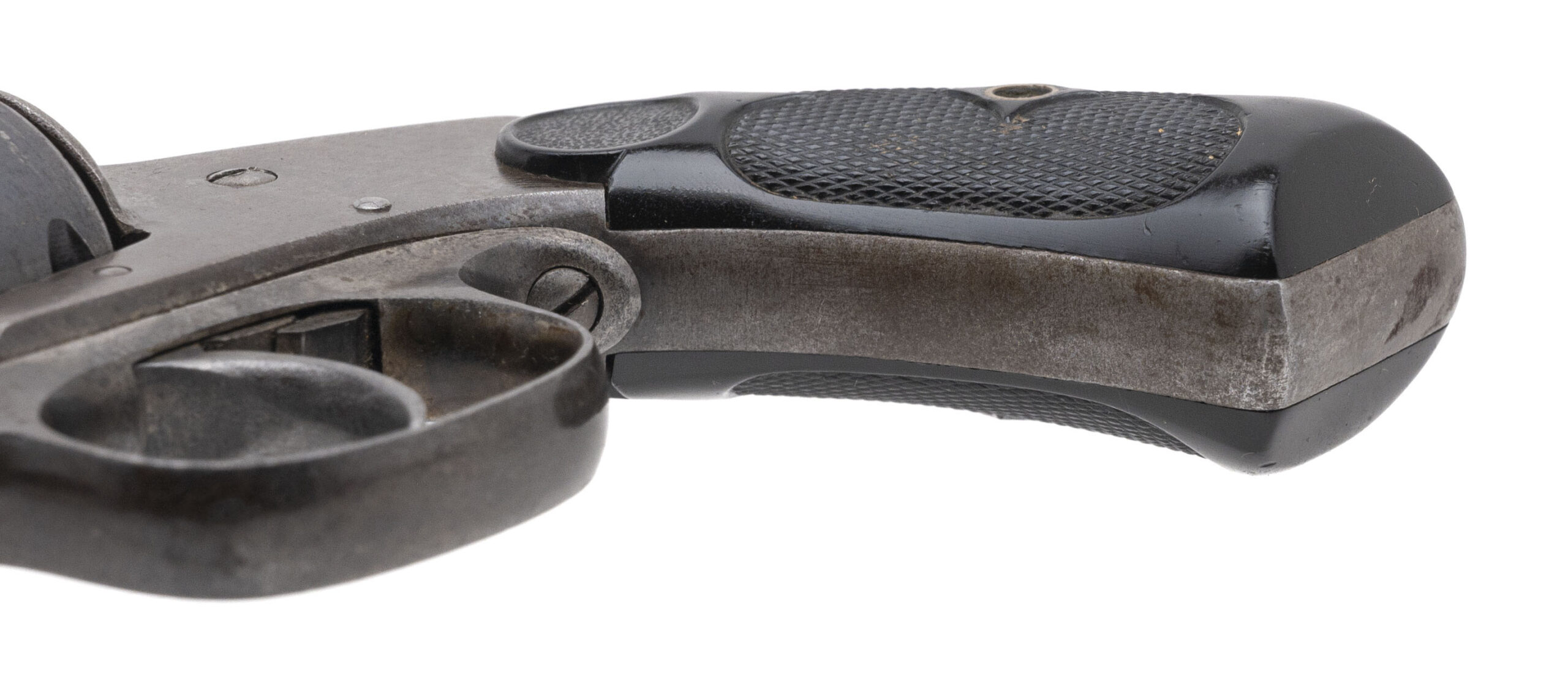 Serial No. 4213, circa pre-1898, .38 caliber, 3” octagonal barrel. Bore is good with strong rifling visible. Barrel and cylinder retain majority of its blue finish with wear noted along the edges. Traces of case coloring are visible on the frame. Grips are good with light wear noted. Action indexes and functions correctly with a tight lock up.