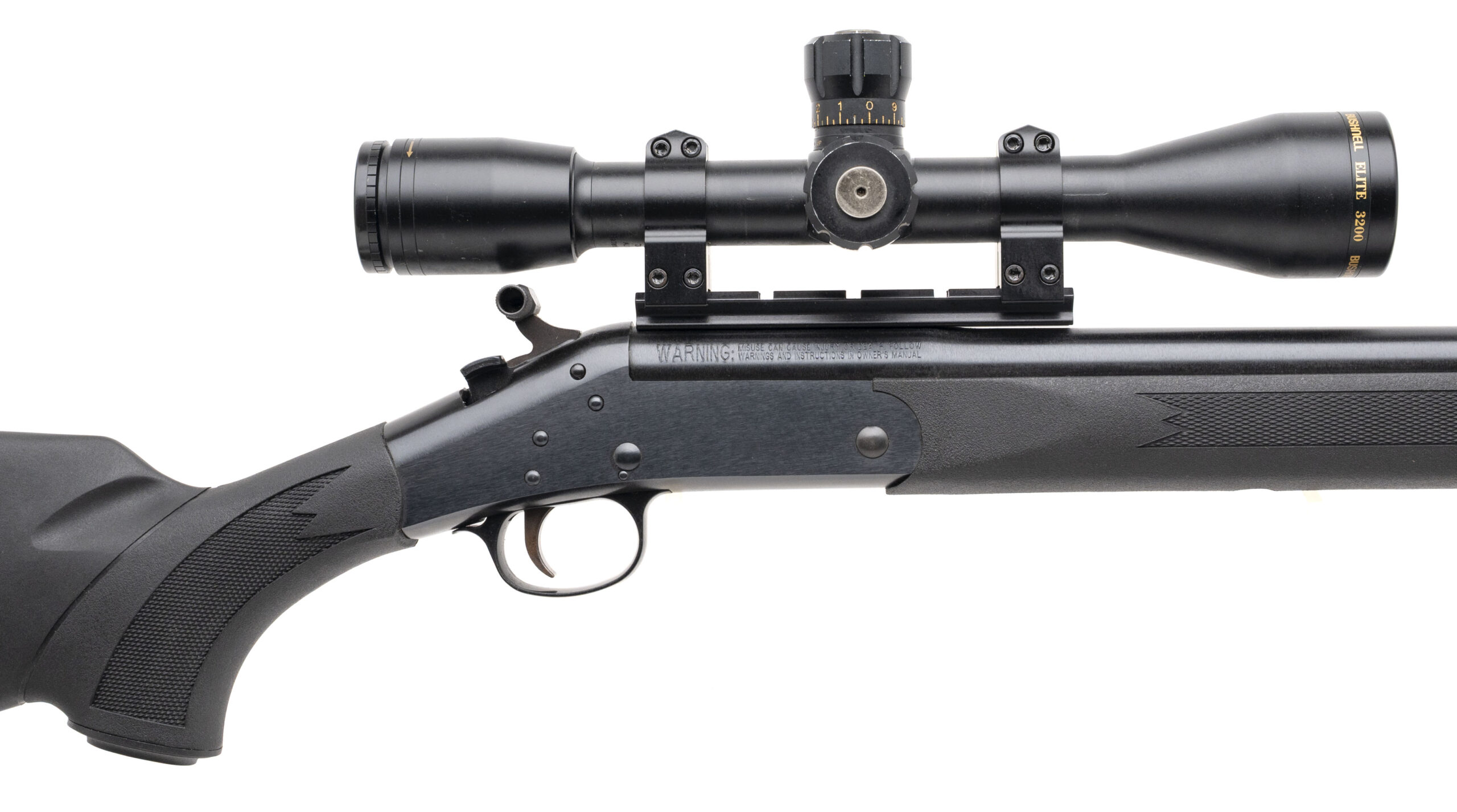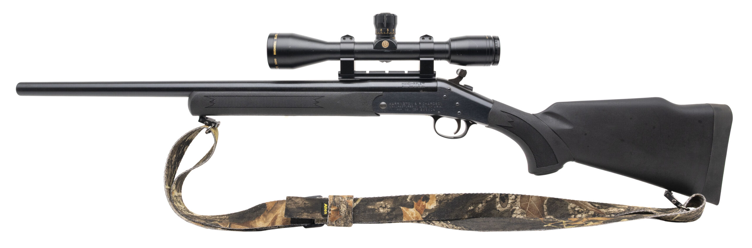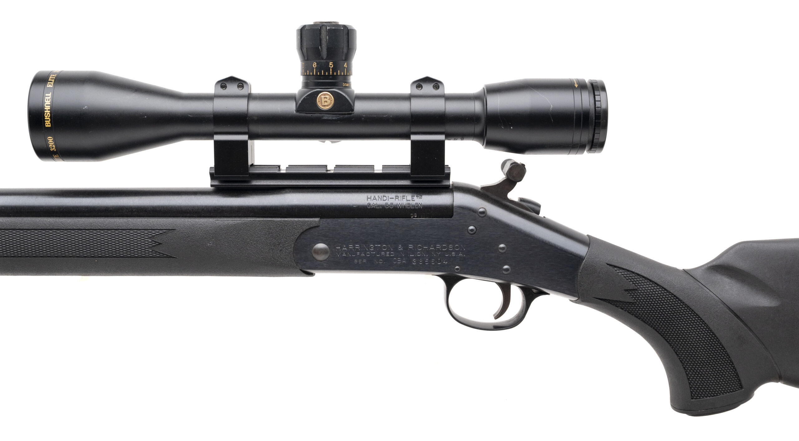 SN: CBA385604. Modern production, .35 Whelen with a 22" barrel. Bore is excellent. Single shot rifle with a Bushnell Elite 3200 scope, blued finish, and black checkered synthetic stock & forend. Finish shows light field wear, most notably towards the receiver. Includes sling. Overall condition is near excellent