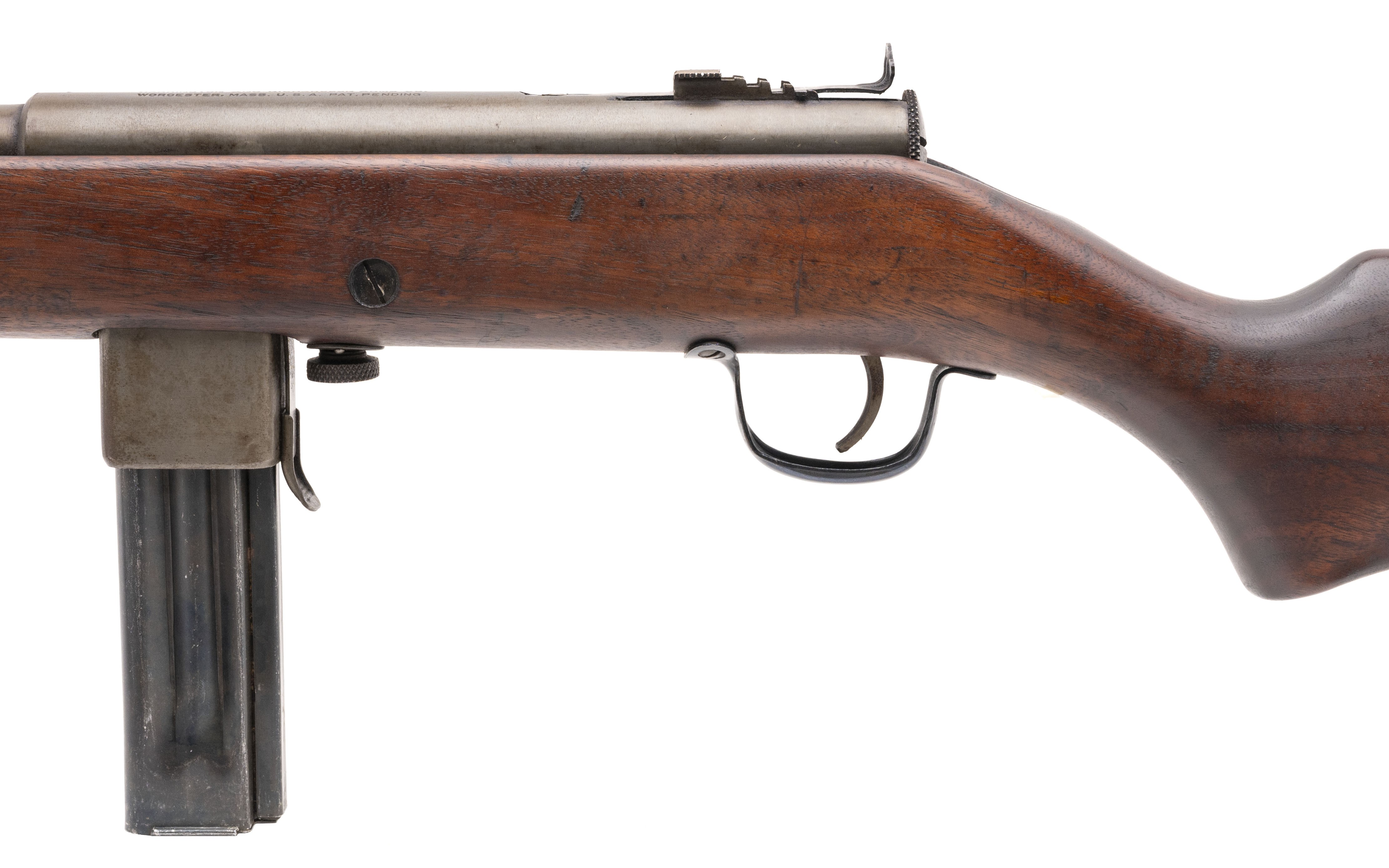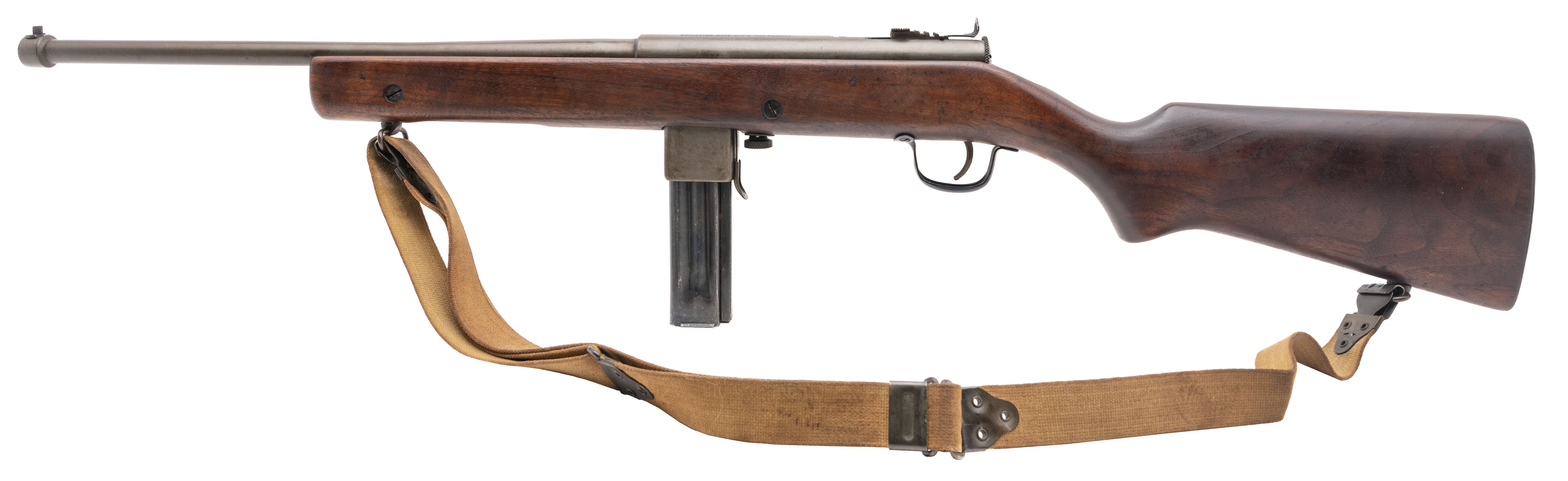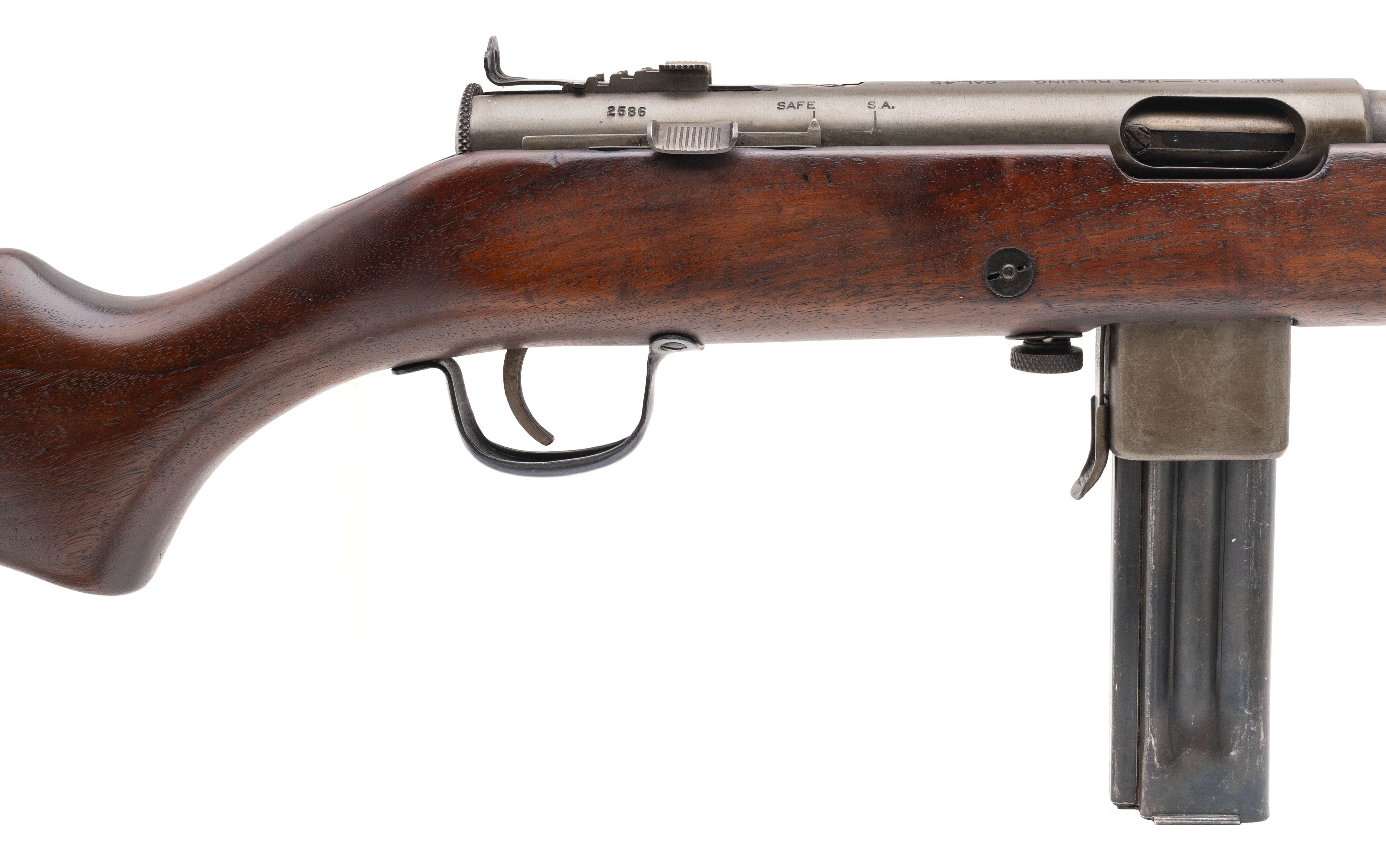 SN: 2586. Made in 1943 with an 18.25-inch barrel chambered for the .45 ACP cartridge. Overall condition is excellent with a bright bore & factory original dull phosphate finish across the metal parts. The stock is in excellent condition with no dings, dents or scratches. Comes with a Kerr "No-Buckl" sling & a 12-round magazine. Consignment