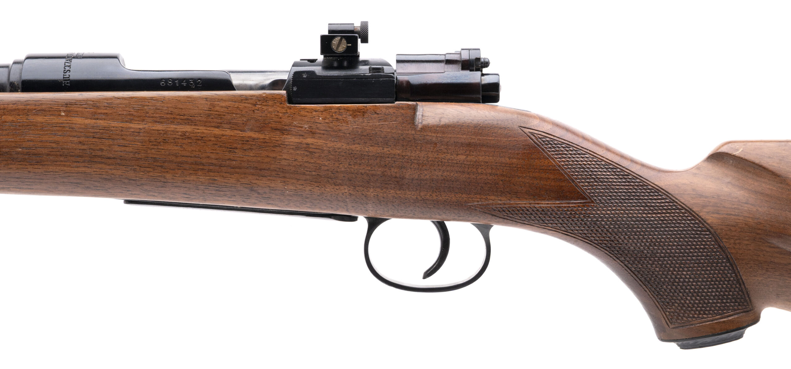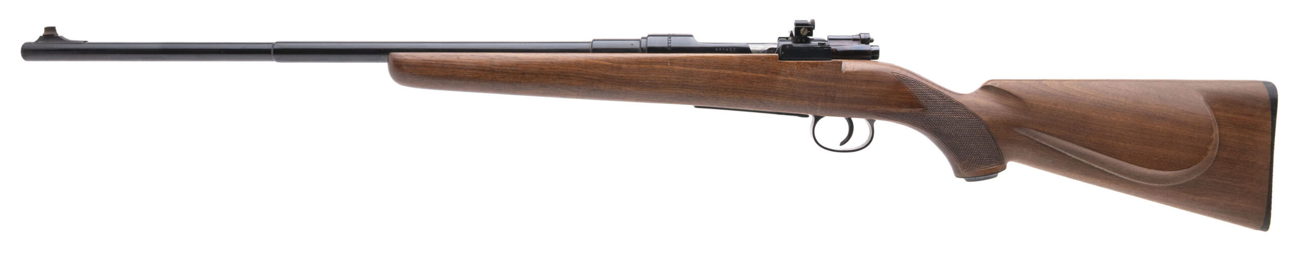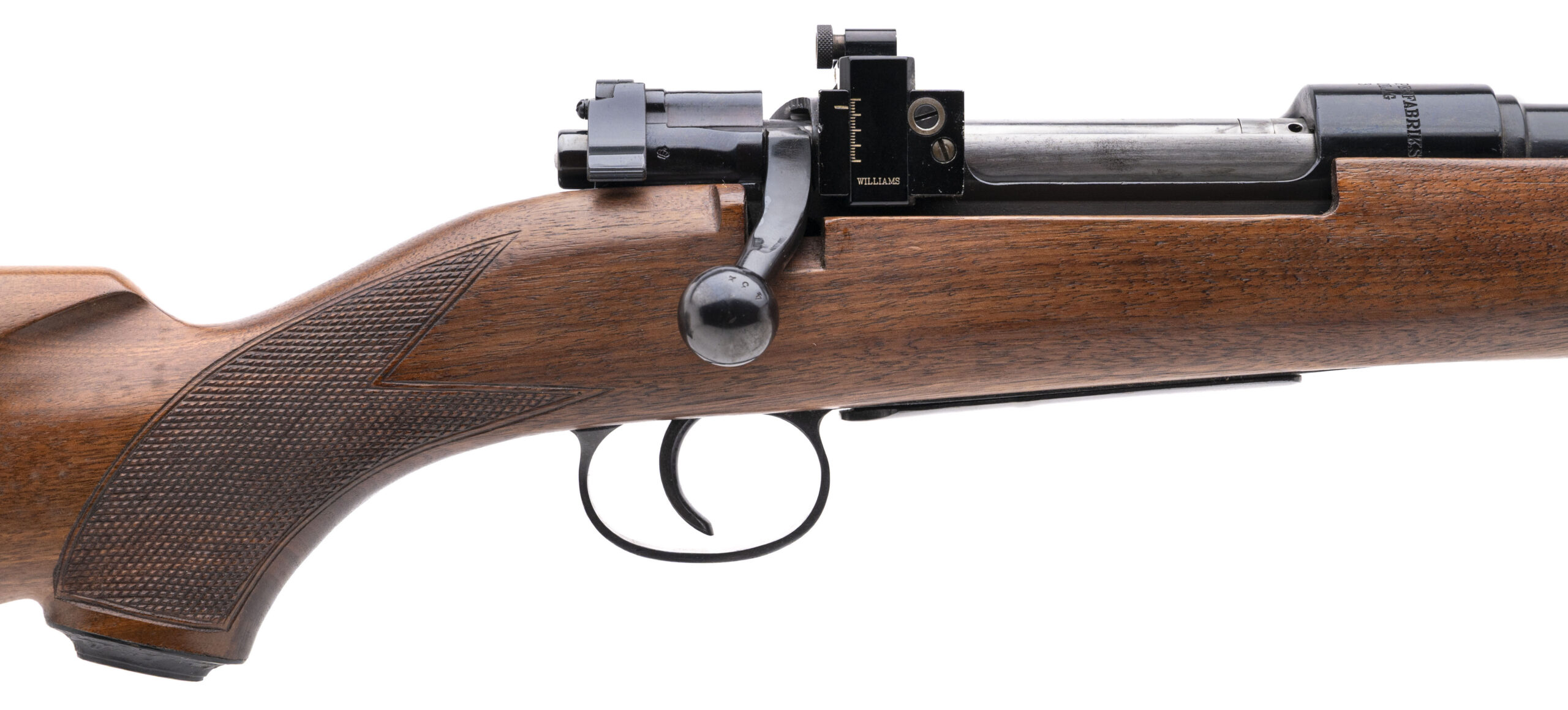 SN: 681432 sporterized WW2 Swedish Mauser chambered in 6.5x55 with a 22" round barrel, ramped front sight, Williams rear peep sight in a checkered walnut Bishop stock. Some light handling marks, overall in very good condition with an excellent bore.