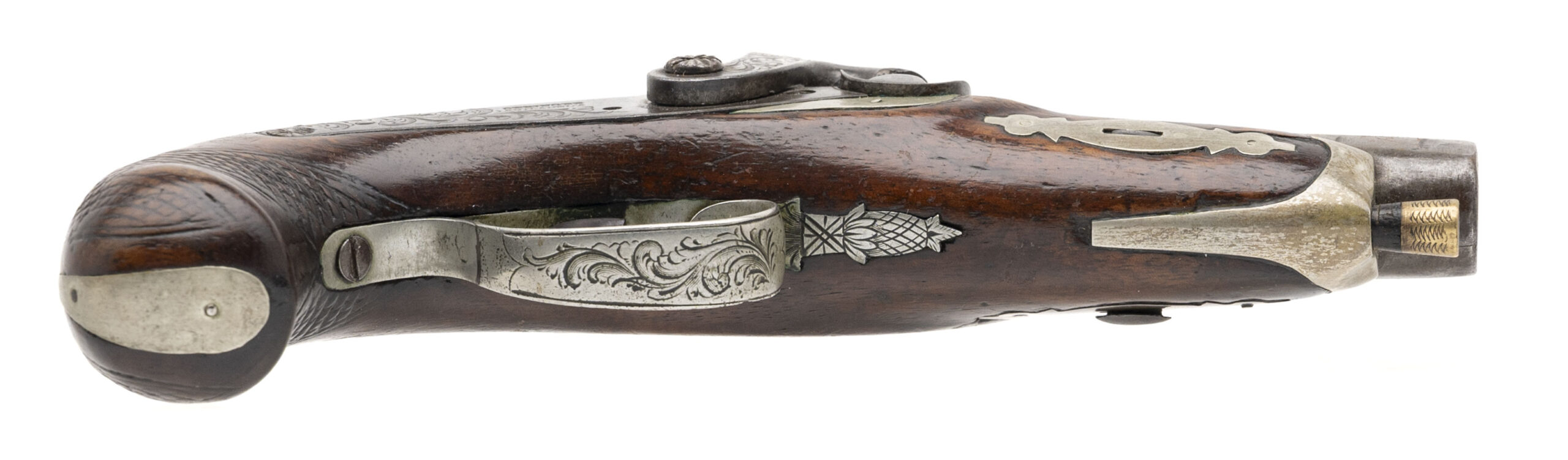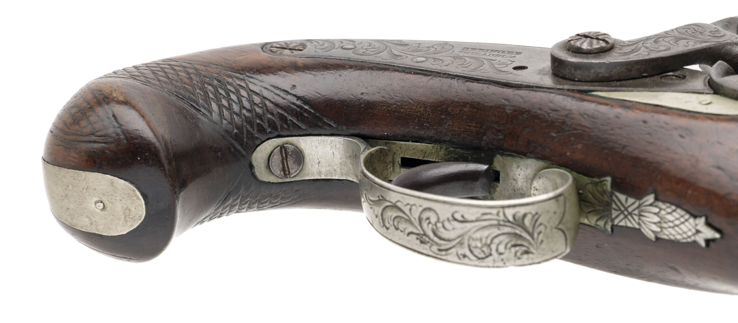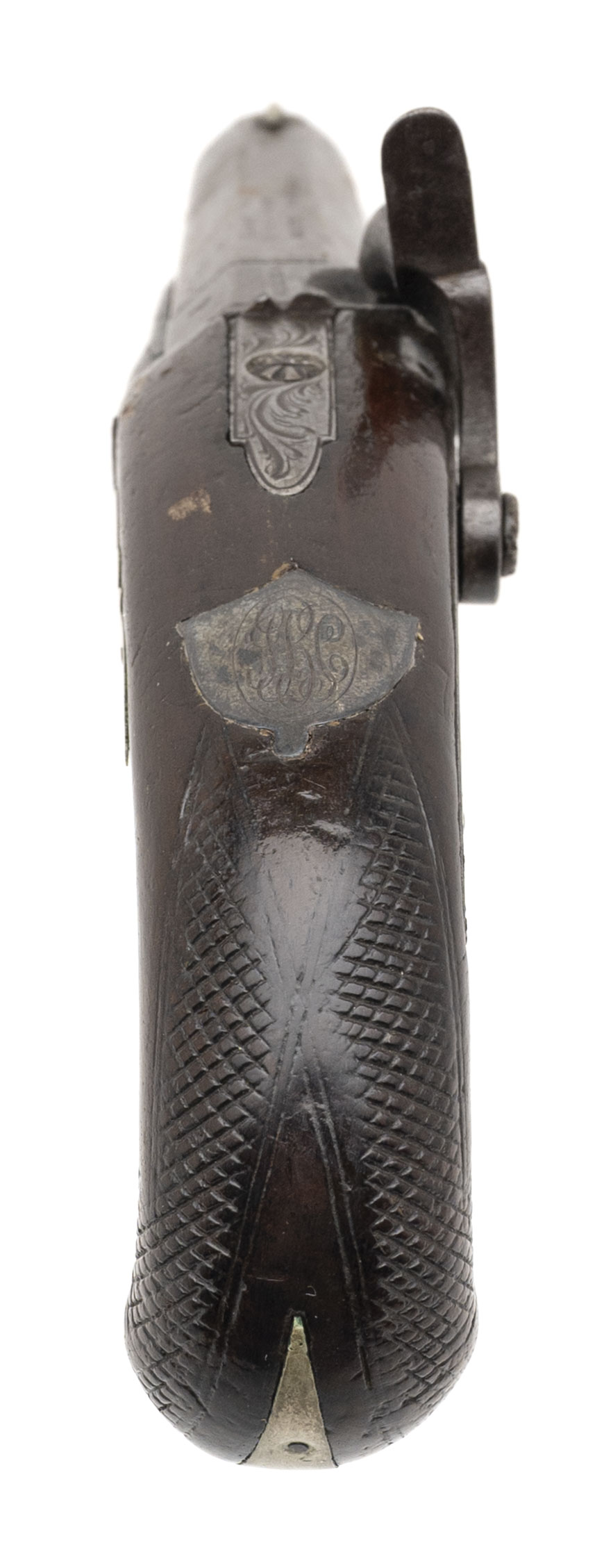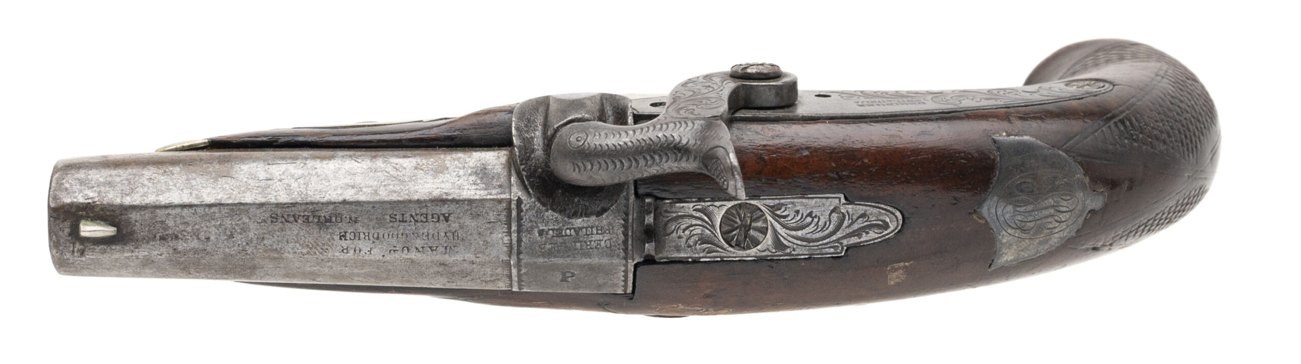 NSN. Made circa 1850s. 41 caliber with a 3” barrel. The barrel has a light gray [patina throughout, but remains sharp with all the markings visible. The top of the barrel is marked is marked “Made For/ Hyde & Goodrich/ AGENTS N. Orleans” The stock is very good with the checkering present showing normal handling use. The lock, upper tang and trigger guard are all engraved. There is a silver escutcheon with initials nicely engraved. Hyde and Goodrich was a dealer for Henry Derringer in New Orleans. They sold many things in addition to firearms. Very neat Southern marked Derringer.!