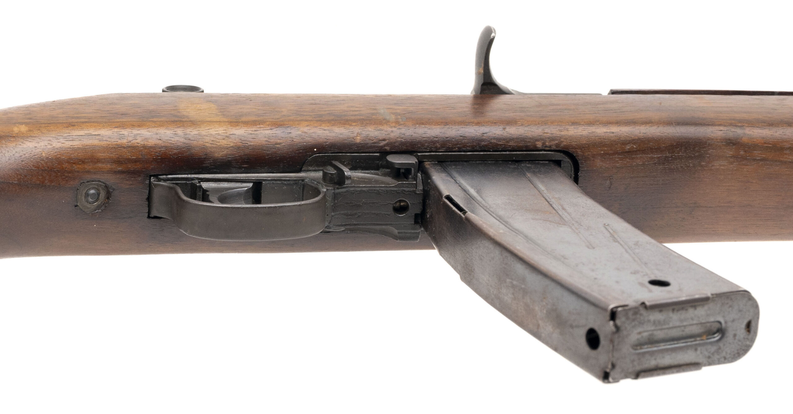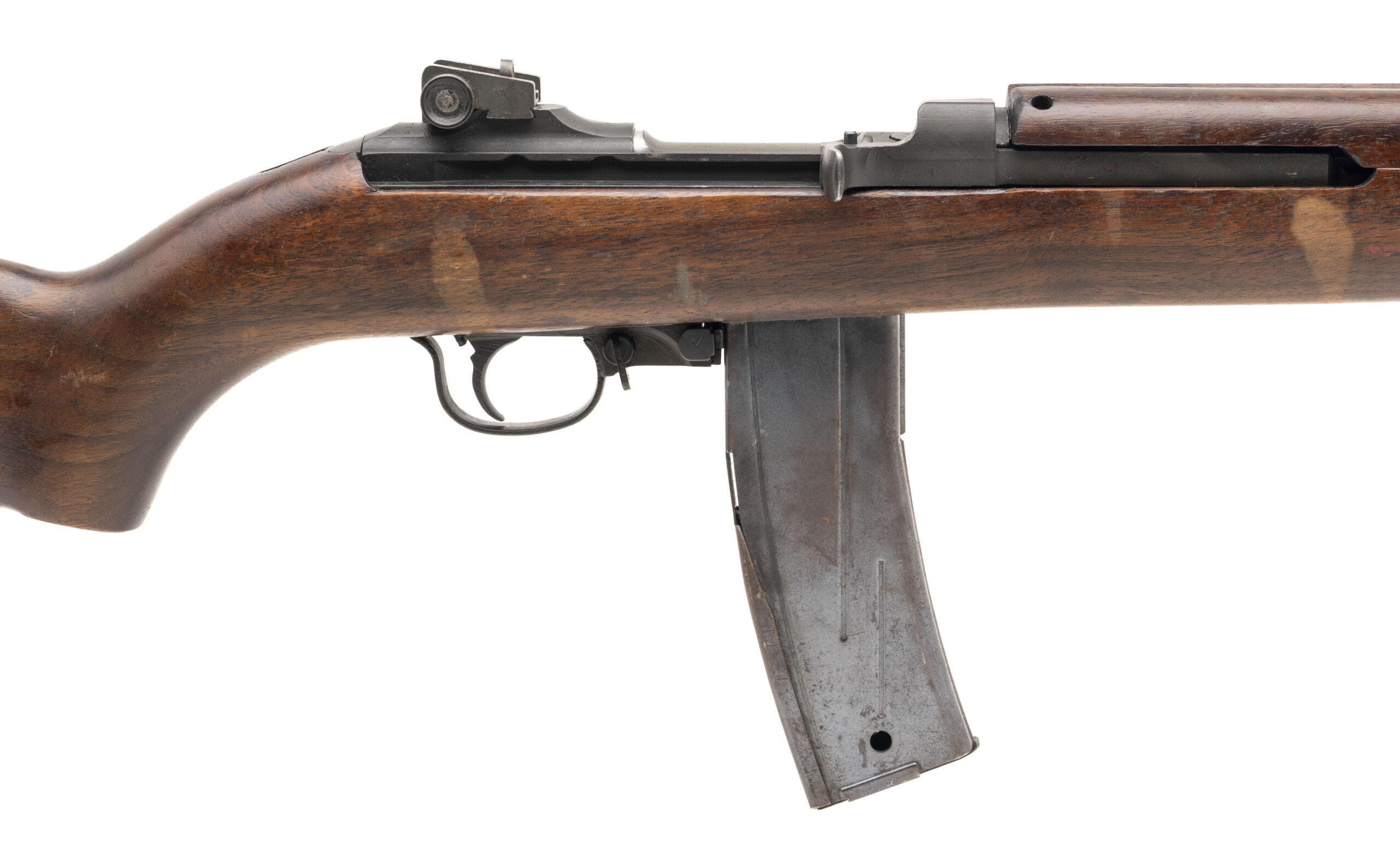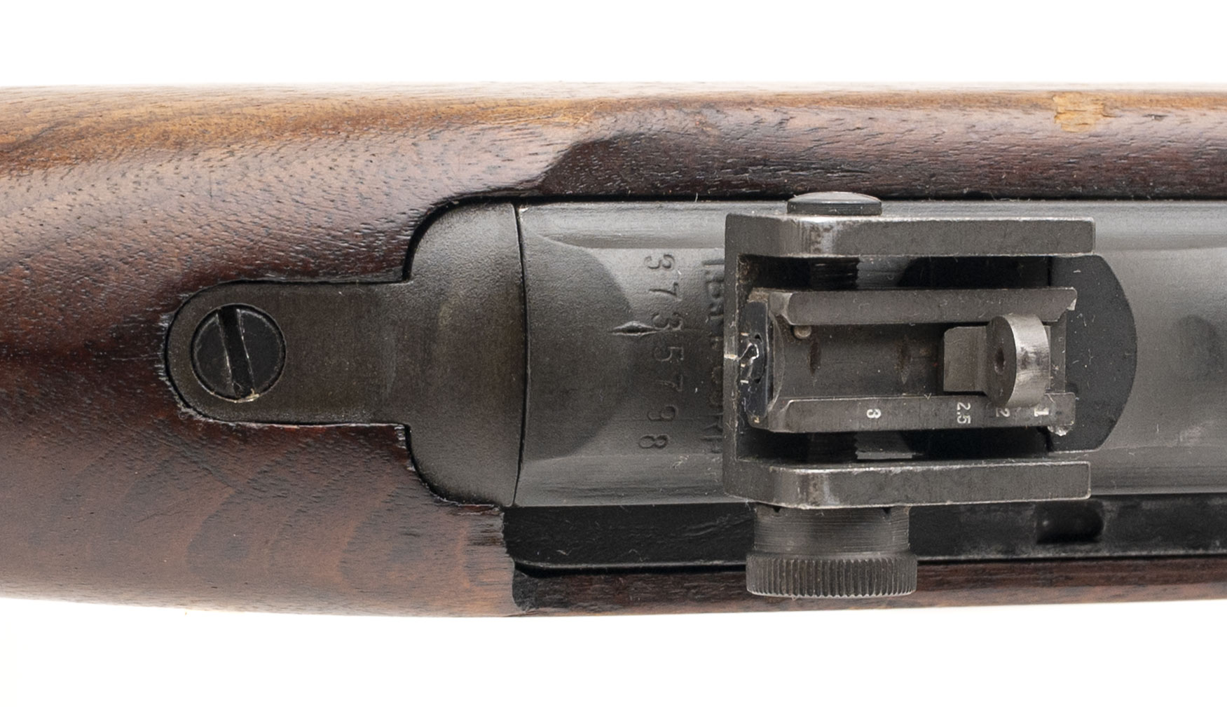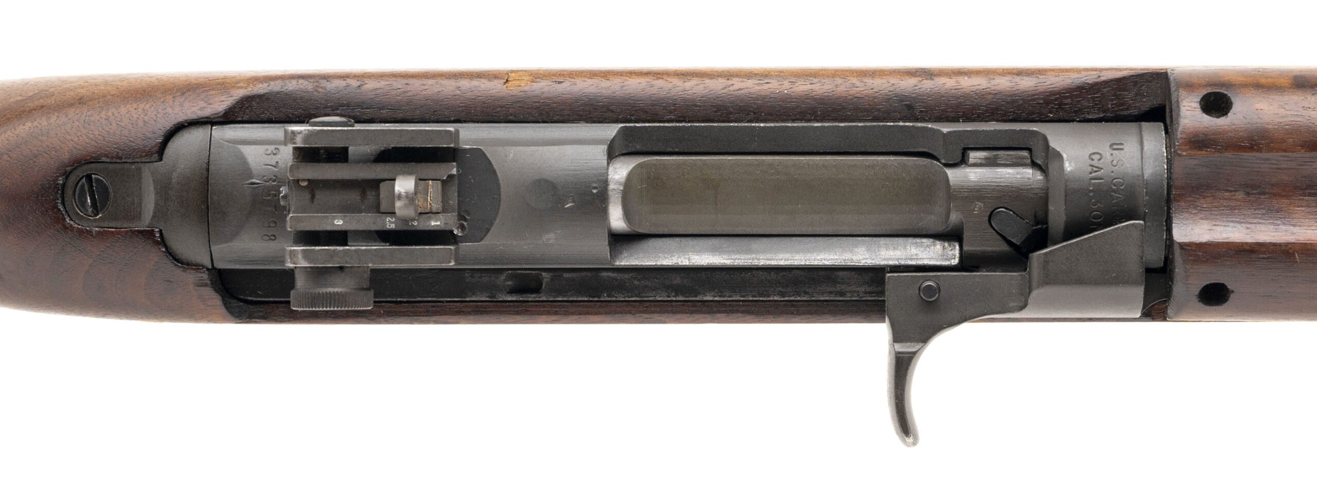Serial number 3735798. Made in 1943 with a 18-inch Inland Division of GM barrel that has a bright bore with strong visible rifling. Although this gun was made during World War II, it went through a post-war arsenal level service life extension rebuild program that resulted in it being equipped with a milled adjustable rear sight assembly, a flip safety & a Type 3 bayonet lug barrel band. It is also equipped with a 2-rivet handguard & a World War II-production low wood oval cut stock that was made by the Trimble Nursery & Furniture Co. for National Postal Meter. A Springfield Armory post-war rebuild cartouche can be observed on the left side just above the trigger. Condition overall is very good with original factory phosphate finish across the metallic parts but some discoloration is noted on the wood. Comes with a USGI 30-round detachable box magazine.