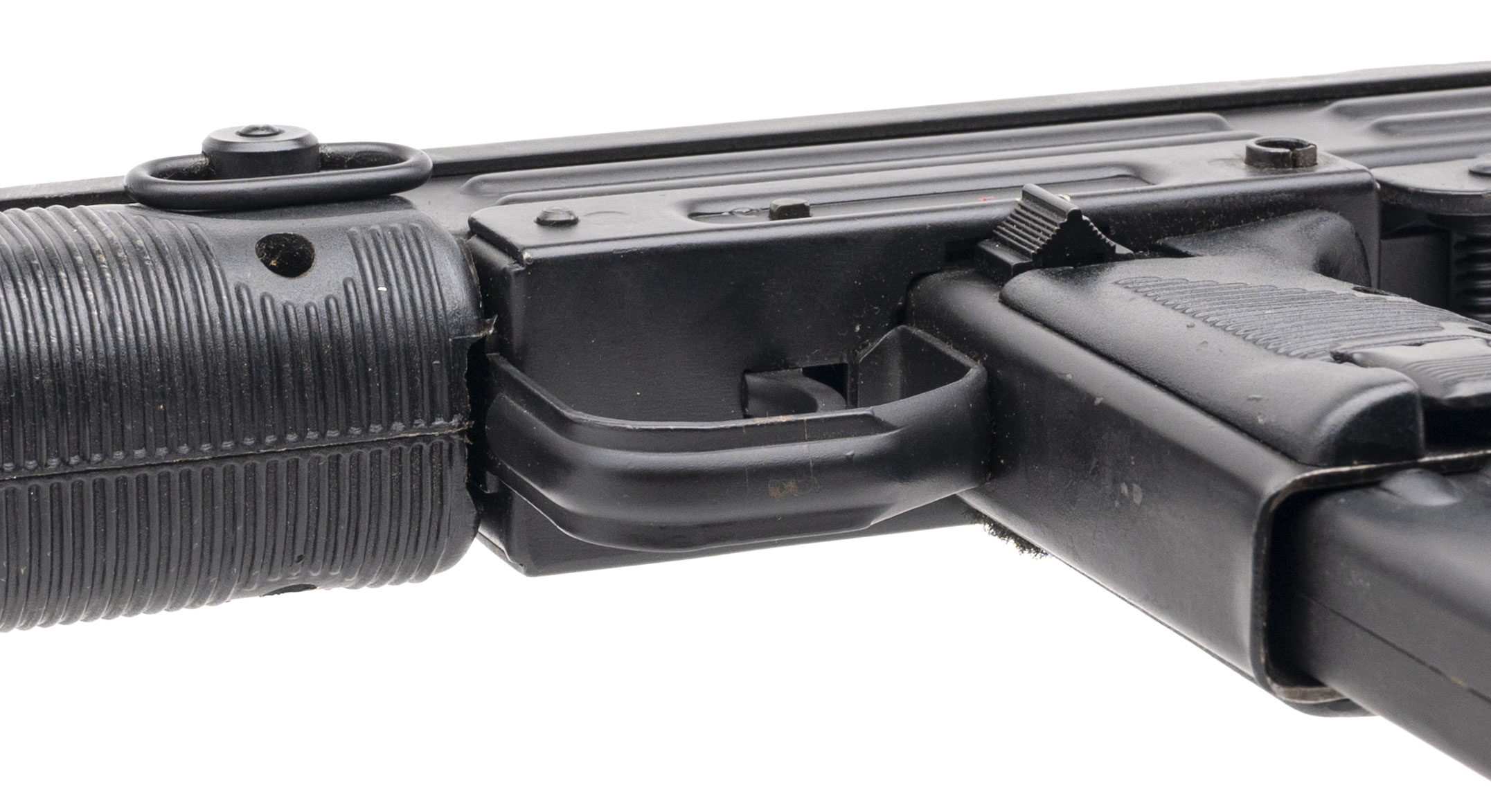 SN: SA69591. 1980s vintage, 9mm with a 16" barrel. Bore is excellent. Pre-ban Israeli mad Pistol Caliber Carbine imported by Action Arms with a collapsible stock, bayonet lug, and matte black finish. Finish shows minor handling marks. Includes an additional 25rd & 32 rd magazine, faux barrel, sling, and original case. Overall condition is very good.
