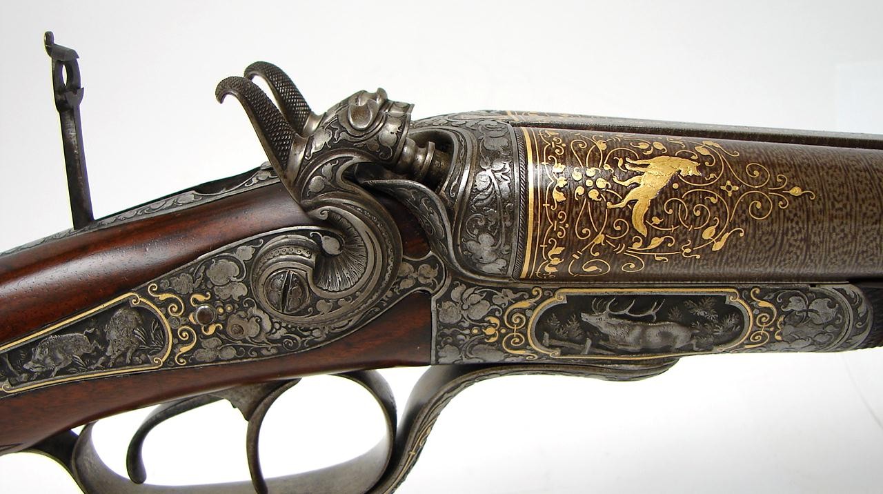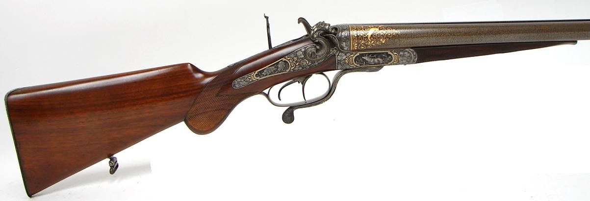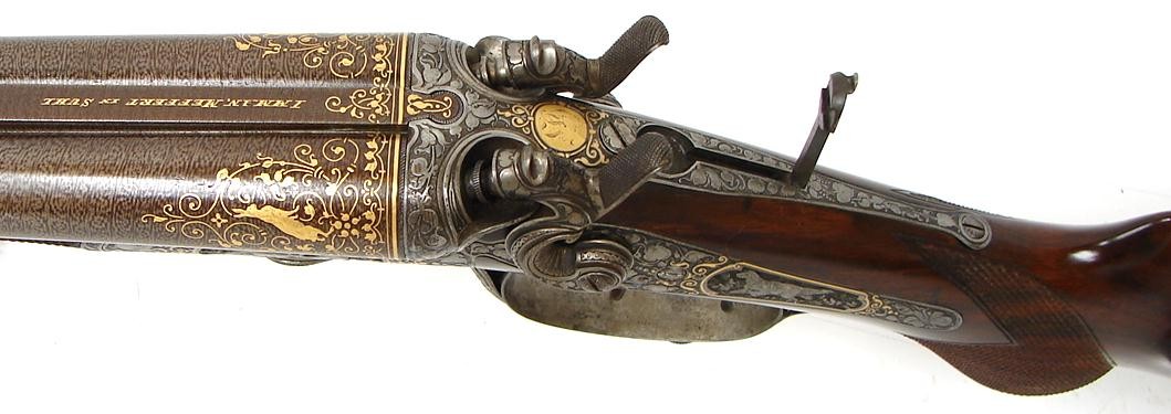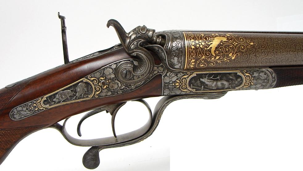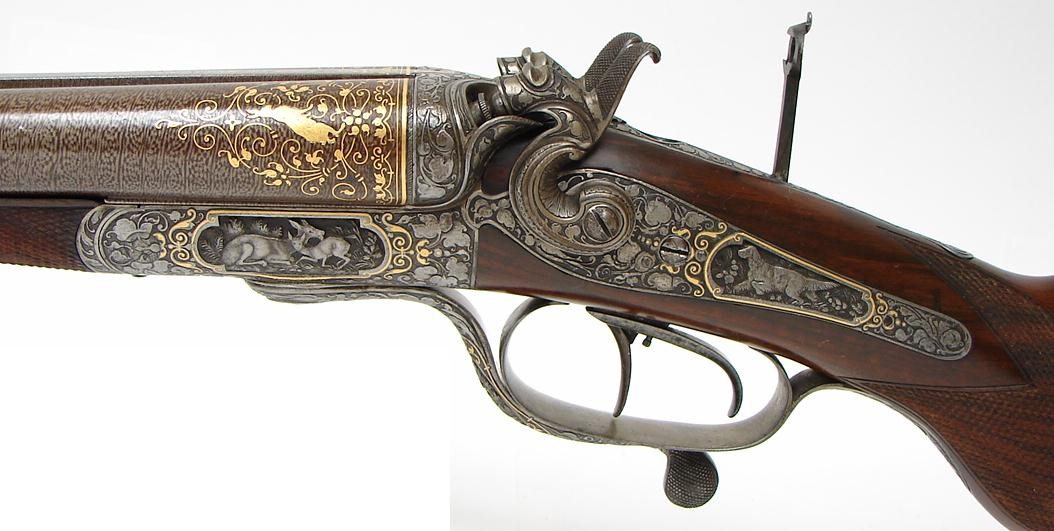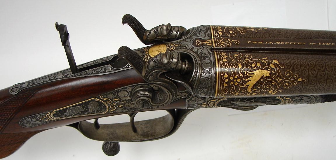 Imman Meffert in Suhl Side by Side 12 gauge shotgun. Beautifully relief chiseled panel game scenes of a running stag, a pair of wild boar and a doe and fawn. The receiver is broad leaf and tendril engraved. The locks, lever, tang and barrels are gold inlaid with a fox on the right barrel and a hare on the left barrel. The Damascus barrel have all the finish. One of the triggers is an adjustable set trigger for slug. Tang has a tip up peep for firing slugs. Buttplate is engraved with the figure of St. Hubert, Patron Saint of hunters. Bores are very good with the right barrel having some minor pits in front of the forcing cone. Gun was expertly restocked. Overall condition is excellent and the gun is a pleasure to behold!