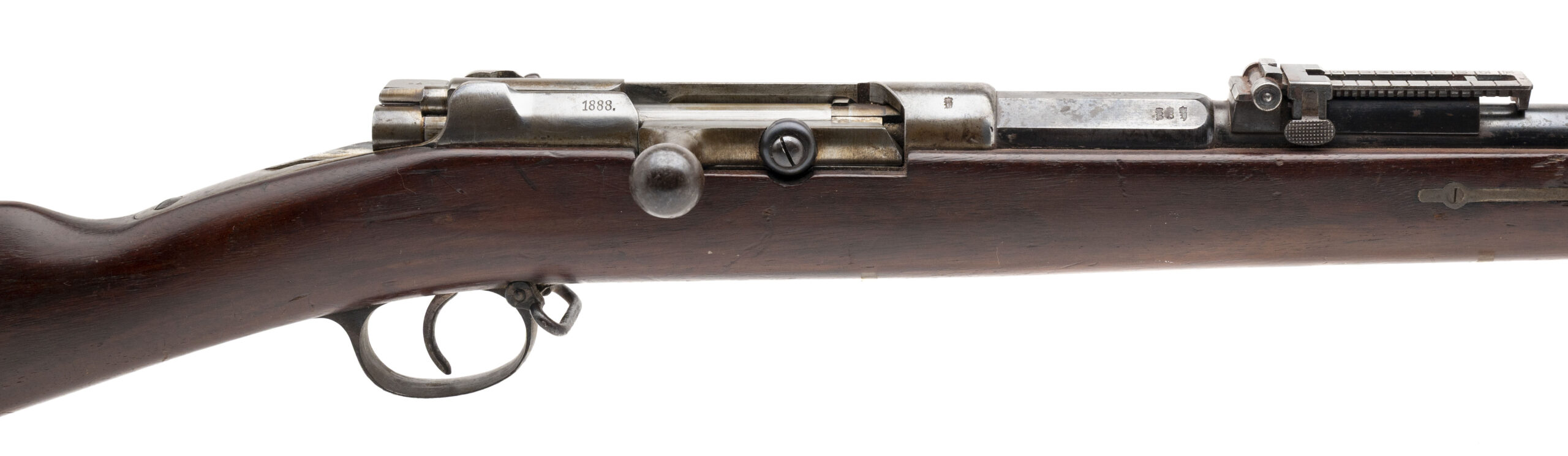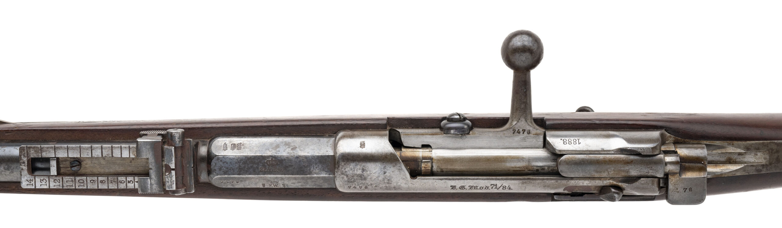 Serial No. 7478, manufactured in 1888 by Spandau Arsenal, 11mm, 31½” round barrel. Barrel finish is thinning to a smooth grey patina with scattered light oxidation visible. Receiver has turned to a light grey patina, and factory markings remain sharp and legible. Serial numbers are matching throughout.Stock displays light handling marks consistent with age and service. Action is smooth and functions correctly. A well-preserved example of the Mauser Model 1871/84, the last black-powder repeating rifle issued to the Imperial German Army, marking the transition toward the smokeless powder era.