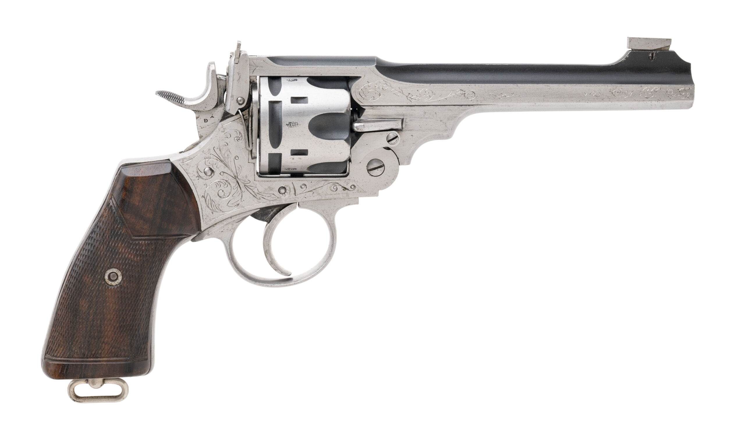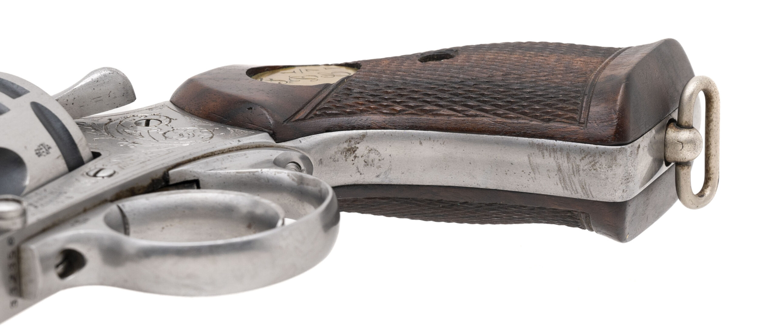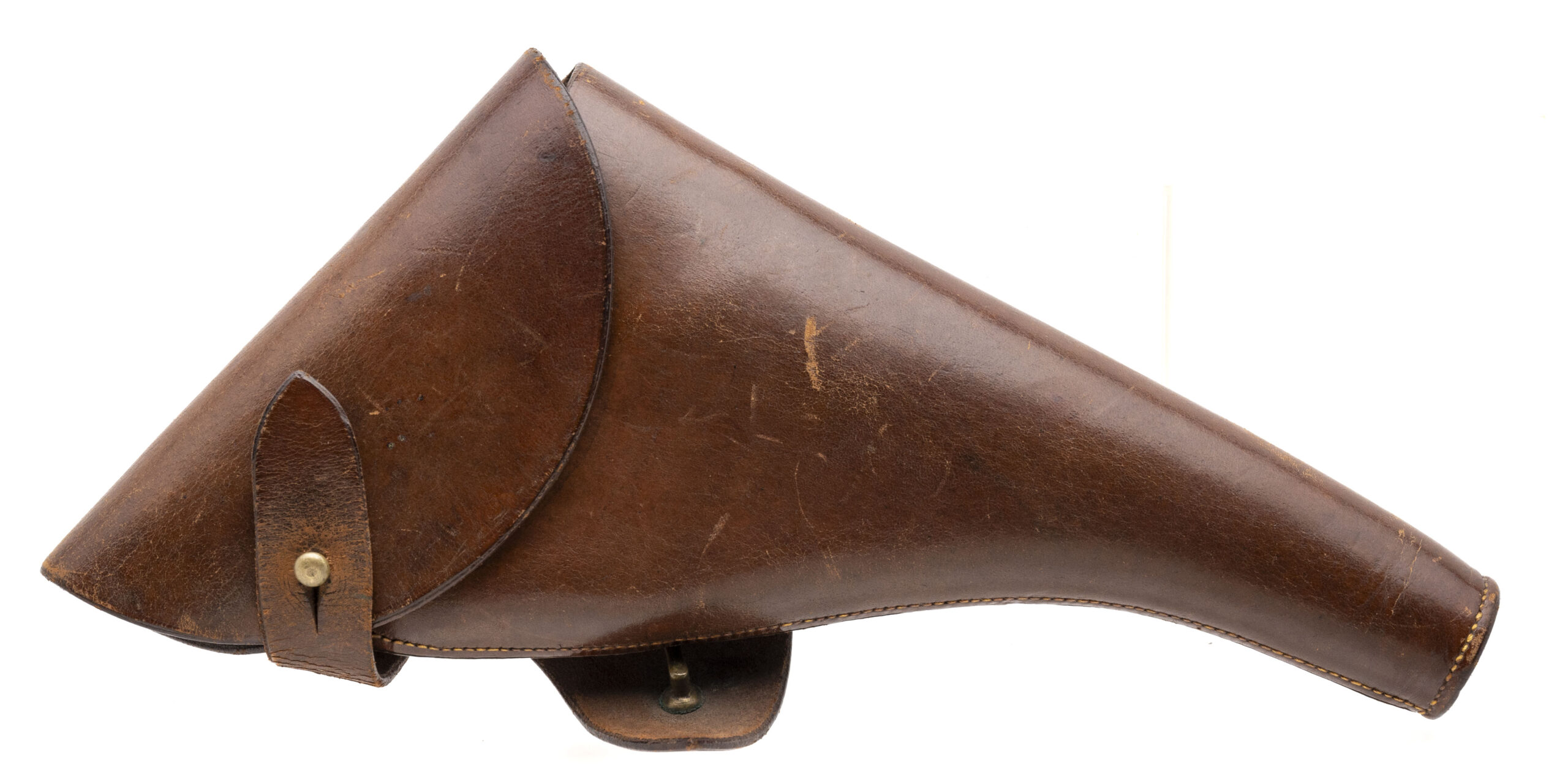 Serial number 332356. Made in 1918. 455 caliber with a 6“ barrel. This gun is in excellent condition as modified. The finish has been removed and the the gun has been engraved. The grips are period custom. They are nicely checkered as well. The left hand side has a brass escutcheon plate inscribed “F/B1/ C77“ The bck strap of the gun is inscribed “L.W.K. STEPHENS. R. G. A.“ We can fine reference to the inscribed name being a 2nd Lieutenant in the Royal Garrison Artillery and receiving both the Victory Medal and British War Medal. This gun comes with the original holster. Very neat Webley Mark VI!