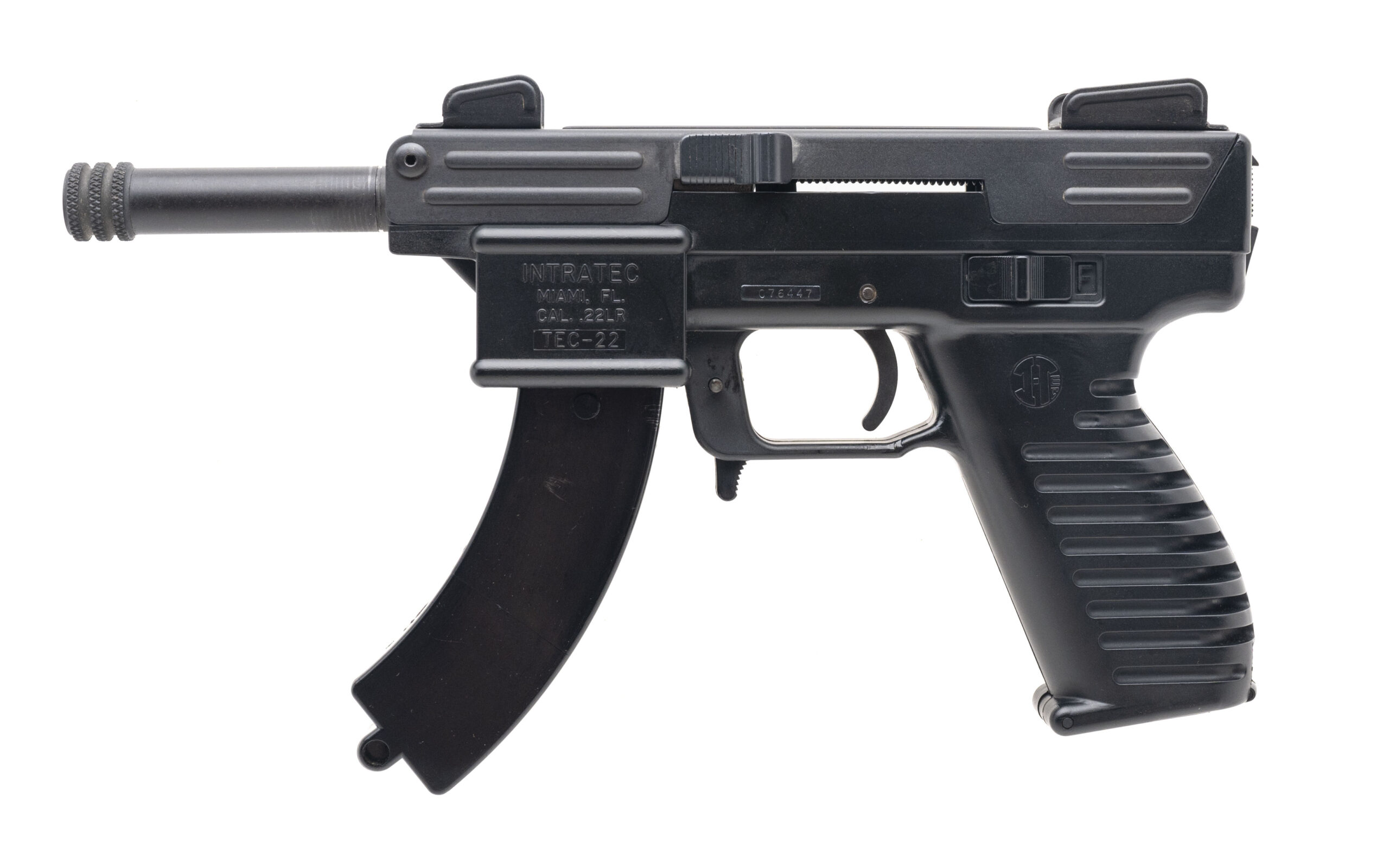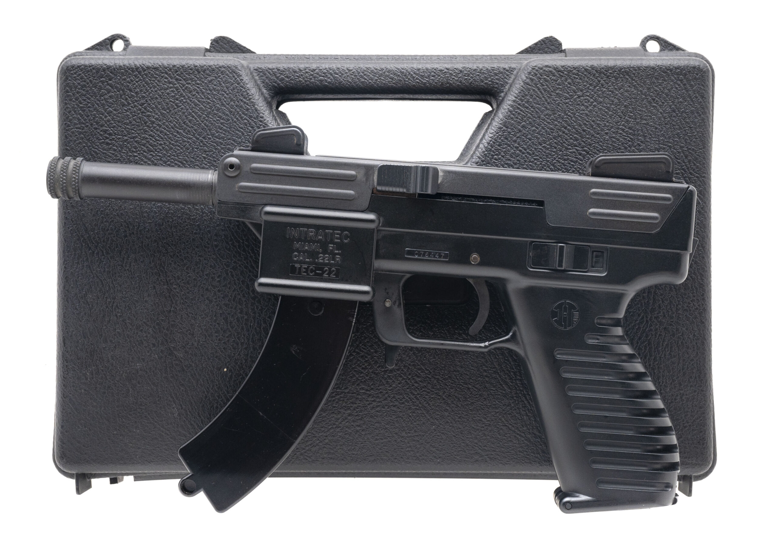 SN: 076447. Made circa early 1990s, .22 LR with a 4" threaded barrel. Bore is bright with strong rifling. Classic Tec-9 inspired rimfire pistol. Overall condition is very good. Comes with original case.