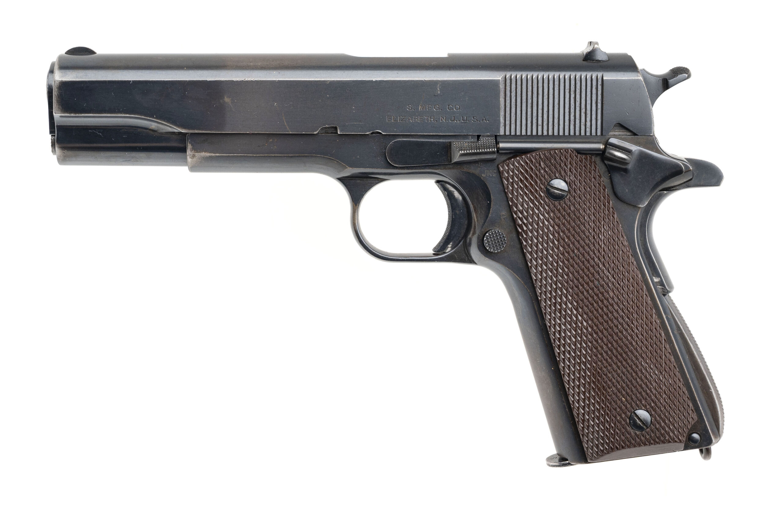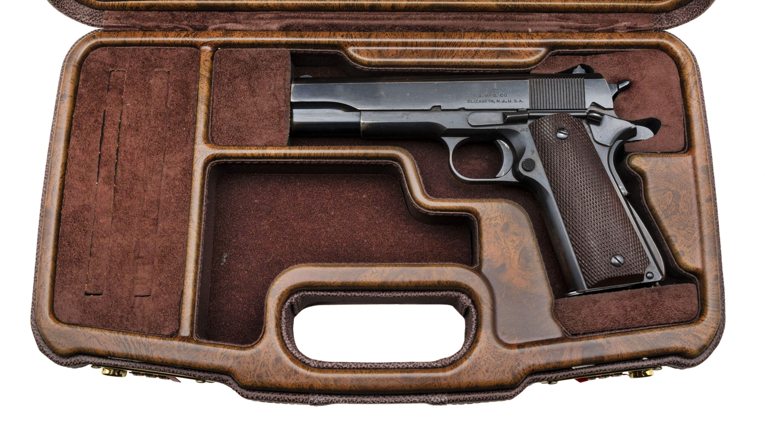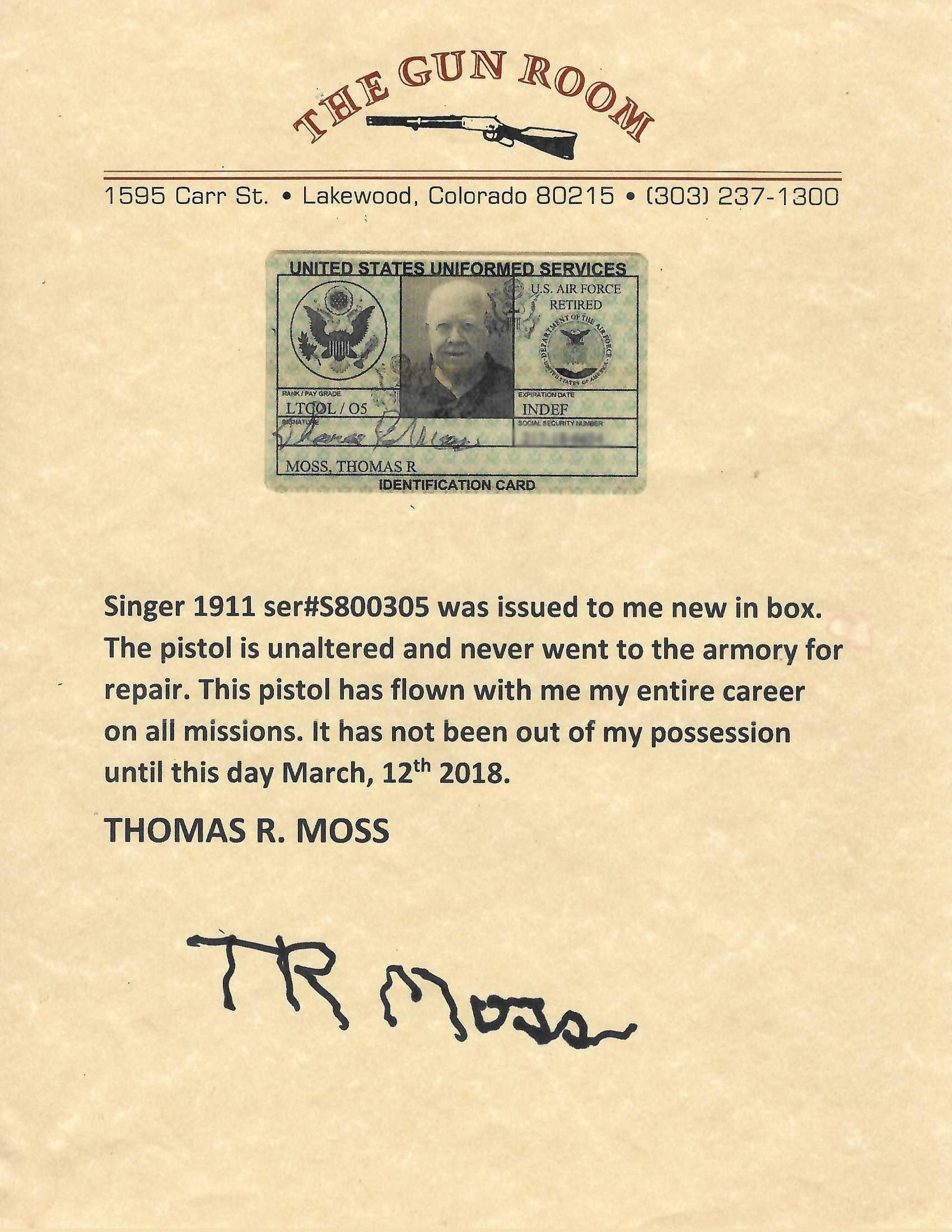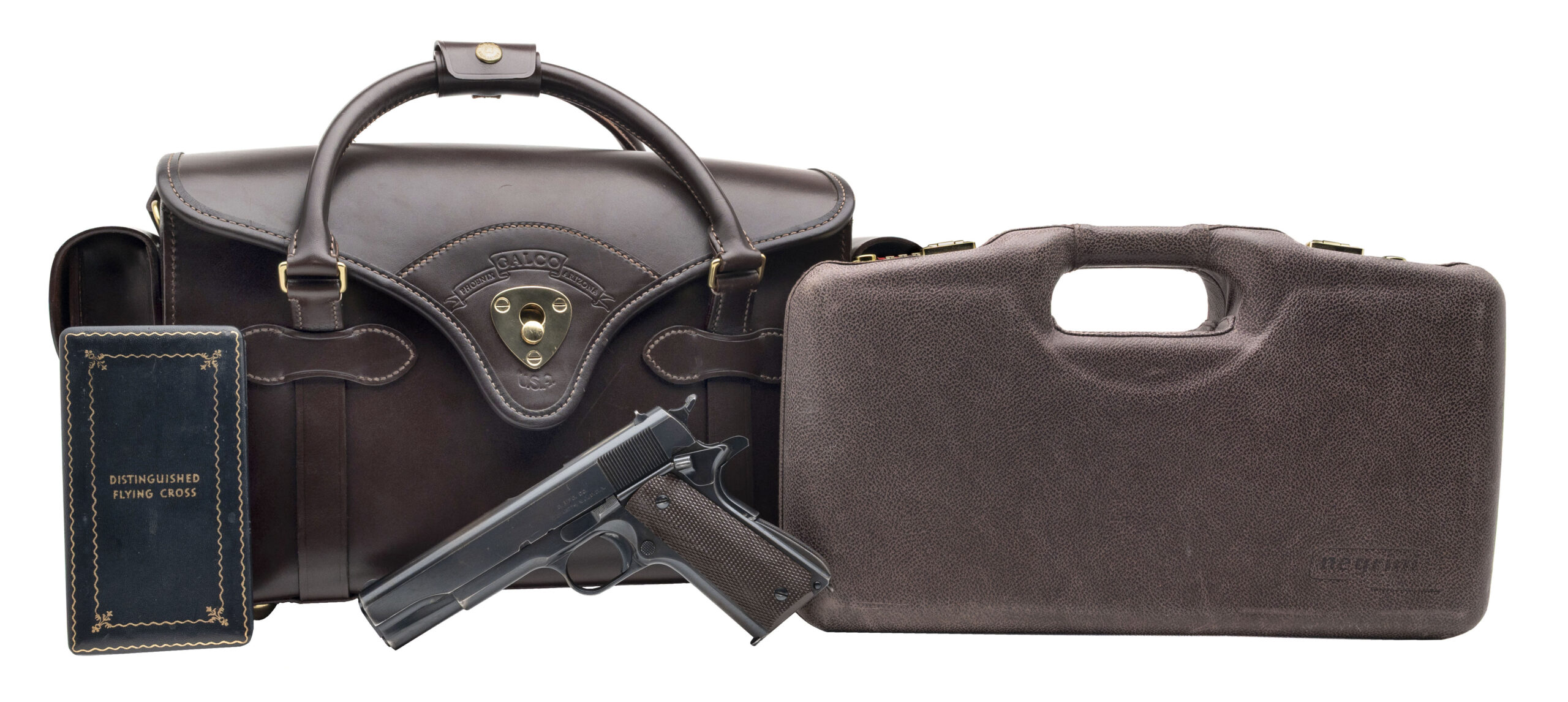 Serial Number S800305. Made in 1940 with a 5-inch barrel that has a bright bore with strong visible rifling. Condition overall is excellent with 90% of the original factory bluing across the metallic parts. This is one of the 500 guns produced under Singer Sewing Machine's "educational contract" to manufacture the M1911A1 before the USA entered World War II, many of which were issued to the U.S. Army Air Corps. This particular Singer was carried by 1st Lieutenant Thomas Randolph Moss, a B-24 pilot in the 765th Bombardment Squadron, 461st Bombardment Group (H) of the U.S. 15th Air Force. Between April 2 & July 8, 1944, Moss flew 35 combat missions over Axis targets in Romania, Yugoslavia, Hungary, Austria, northern Italy, southern France & southern Germany. He carried this Singer during each of those missions, which included tough targets like Budapest, Bucharest, Ploesti, Vienna & Munich. Moss flew the same aircraft for every one of these 35 missions: B-24H #41-28725: a Liberator that was given the nickname "Invictus" - the name by which this pistol is now known. After flying his final combat mission, he rotated back to the USA & took this pistol with him. Moss was awarded the Distinguished Flying Cross for the combat missions he flew during World War II & he remained in the Army after the conflict. When the U.S. Air Force was established in 1947, he continued to serve in it & flew missions as a transport pilot during the Berlin Airlift. He retired from the USAF in 1964 after 24 years in uniform & kept his Singer M1911A1 until March 12, 2018 when he sold it to a gun store in Colorado. Moss passed away at the age of 99 on June 20, 2020. While his pistol is exceptional in terms of its condition & its rarity, more importantly it is an historical artifact that reminds us to remember the men of the 15th Air Force & the contribution they made to victory during World War II. Comes with one 7-round magazine made by the Scovill Manufacturing Company, a Galco leather sport utility bag, a Negrini pistol case, authenticity documentation from Moss himself & the original cased Distinguished Flying Cross he earned while flying combat missions with the 15th Air Force.