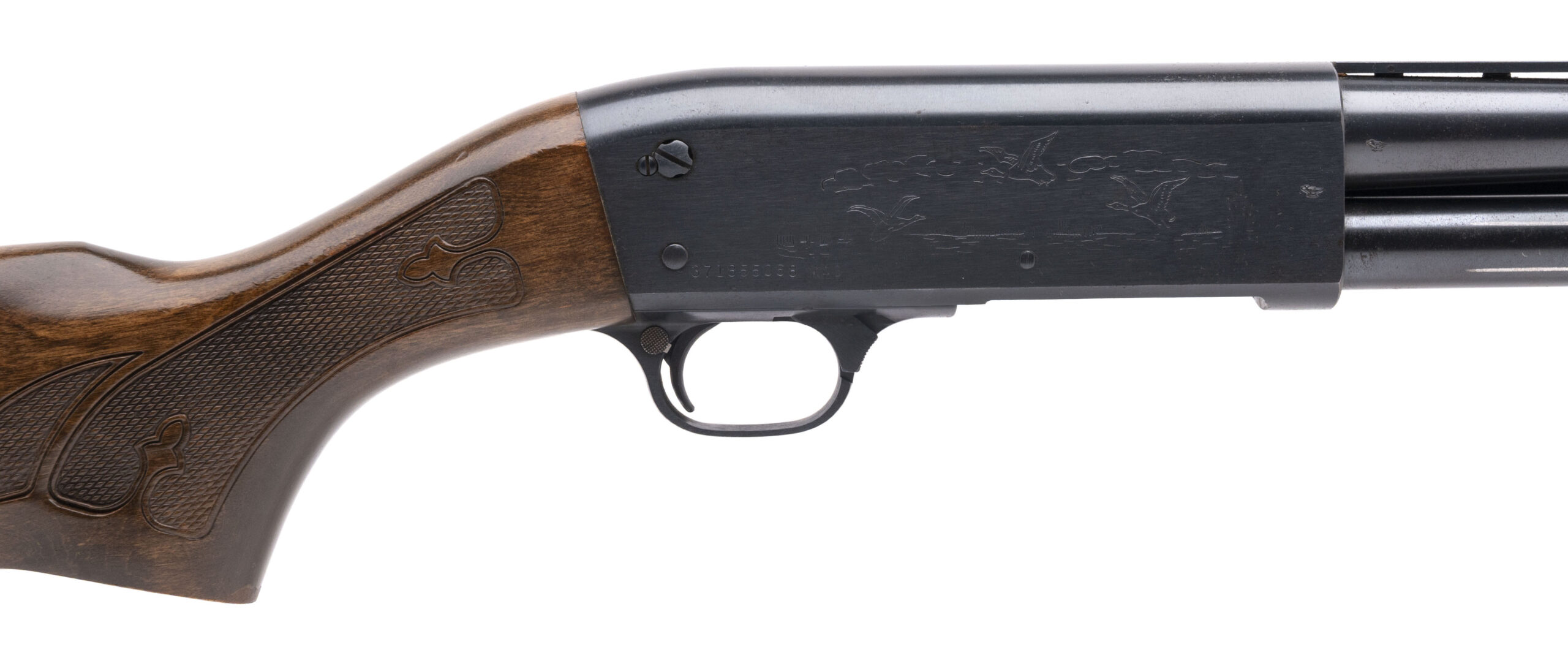 SN: 371855068 made circa 1984. 20 gauge ambidextrous pump action shotgun with a 26" vent rib barrel with 3" chamber and screw in choke. Corn cob style forearm painted brown, checkered wood stock with a 14" LOP to the "Supreme" recoil pad. Some handling marks and wear with some heavier patina noted towards the front of the barrel. Overall in good working condition with an excellent bore.
