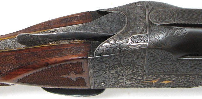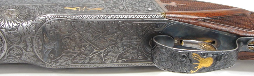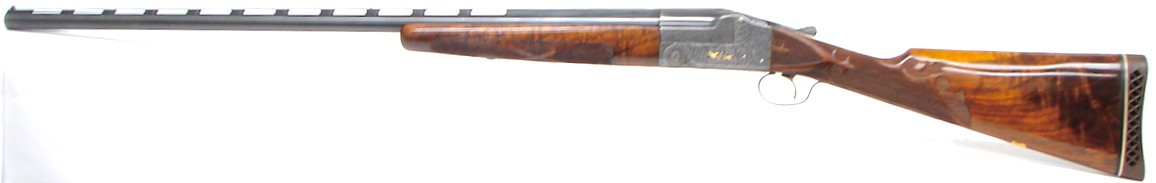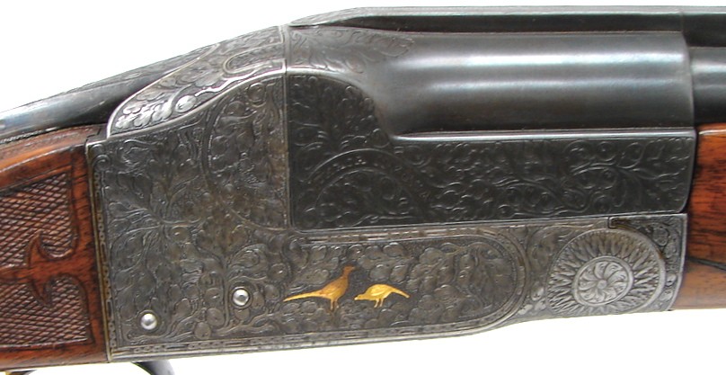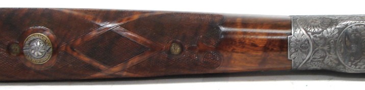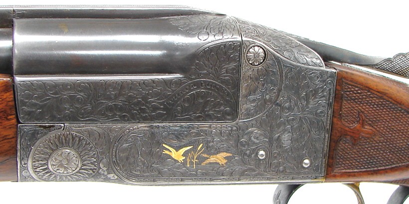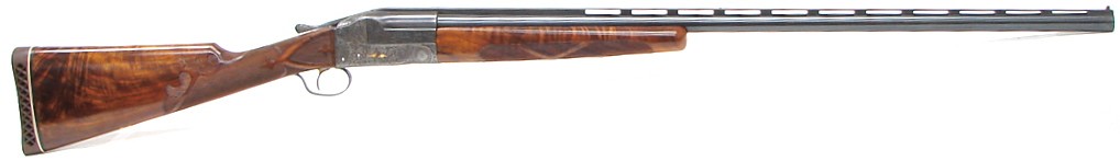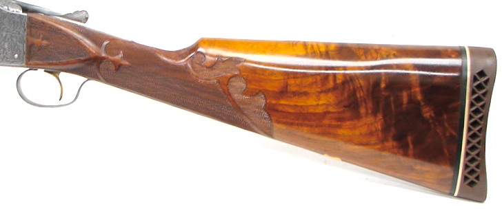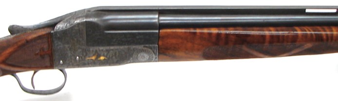 Ithaca Single Barrel Trap 12 gauge shotgun. Very rare grade 7E Ithaca trap gun. Manufactured in 1919. There were very few grade 7s ever made. 32" barrel and 14 1/8" L.O.P. over non original pad. Full coverage engraving on frame with 5 gold inlays. Stock has been varnished and truly deserves to be refinished by a real pro. Bore is about excellent and overall about very good plus. Real parity for an Ithaca Collector.