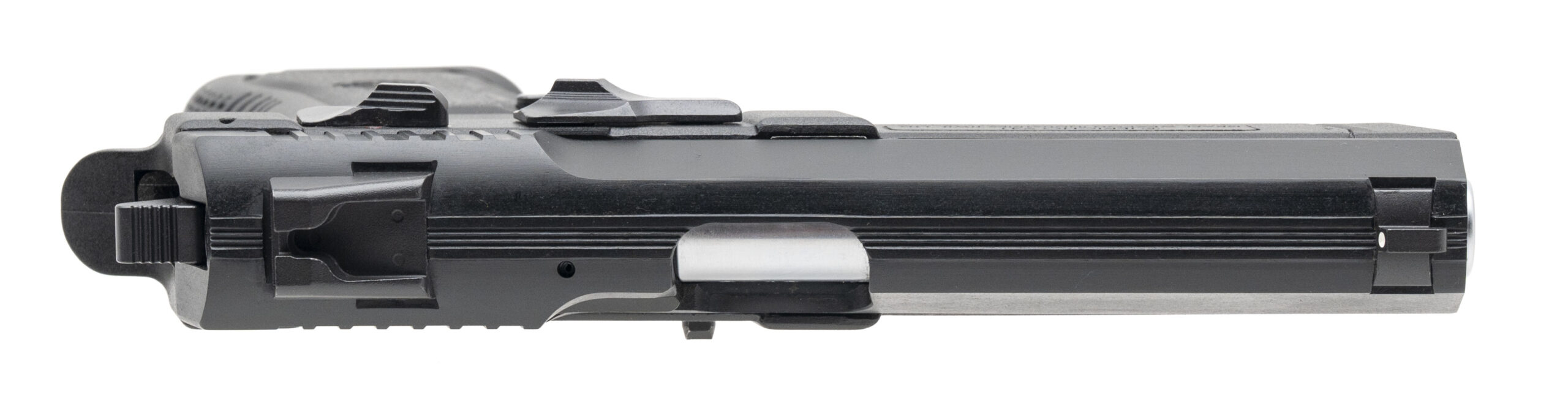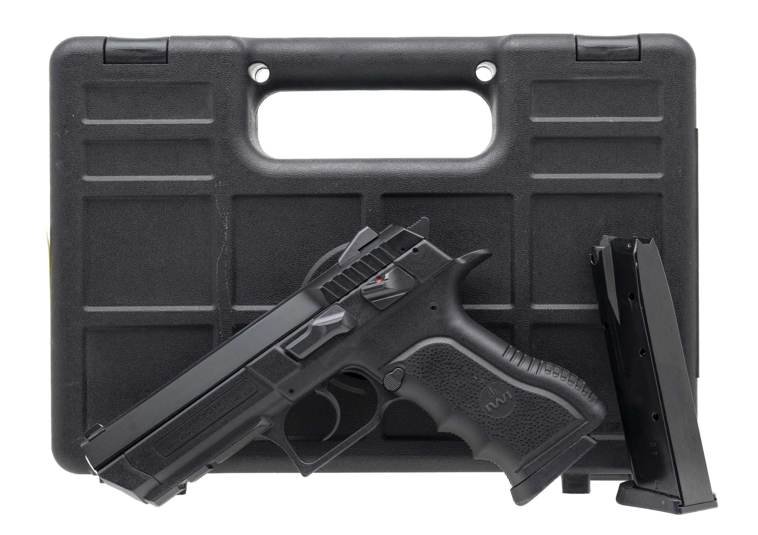 SN: J0005890. Modern production, 9mm with a 4.4" barrel. Bore is excellent. Polymer framed double-action pistol with 3-dot sights, accessory rail, manual thumb safety, and matte black finish. Finish shows minor handling marks. Includes an additional magazine, and original case. Overall condition is near excellent.