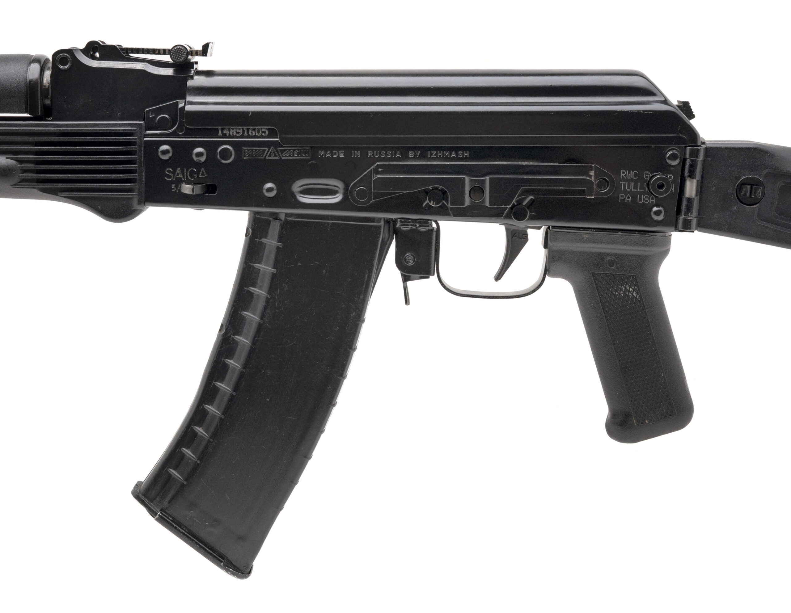 SN: 14891605. Modern production, 5.45x39mm with a 16" barrel w/muzzle brake. Russian made AK rifle with polymer side-folding stock & forend, ALG trigger, bayonet lug, cleaning rod, and black gloss finish. Finish and stock show handling wear throughout. Overall condition is very good.