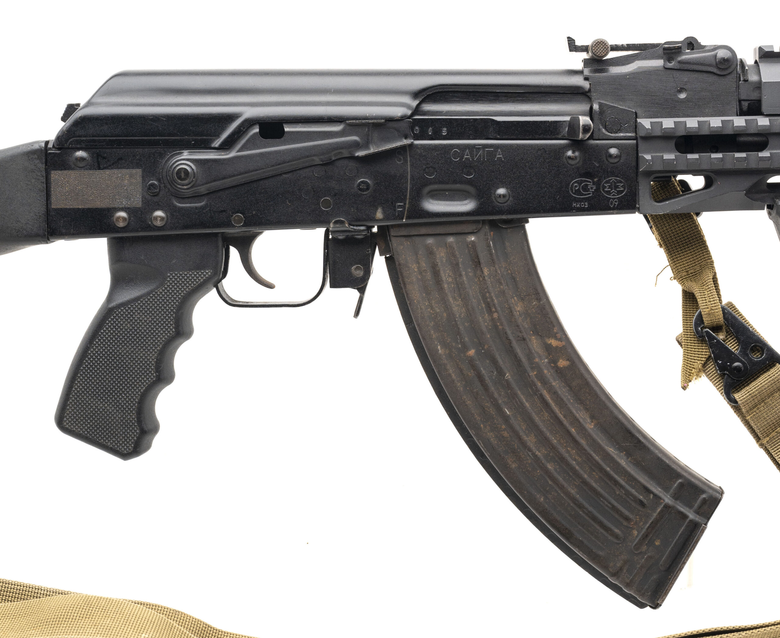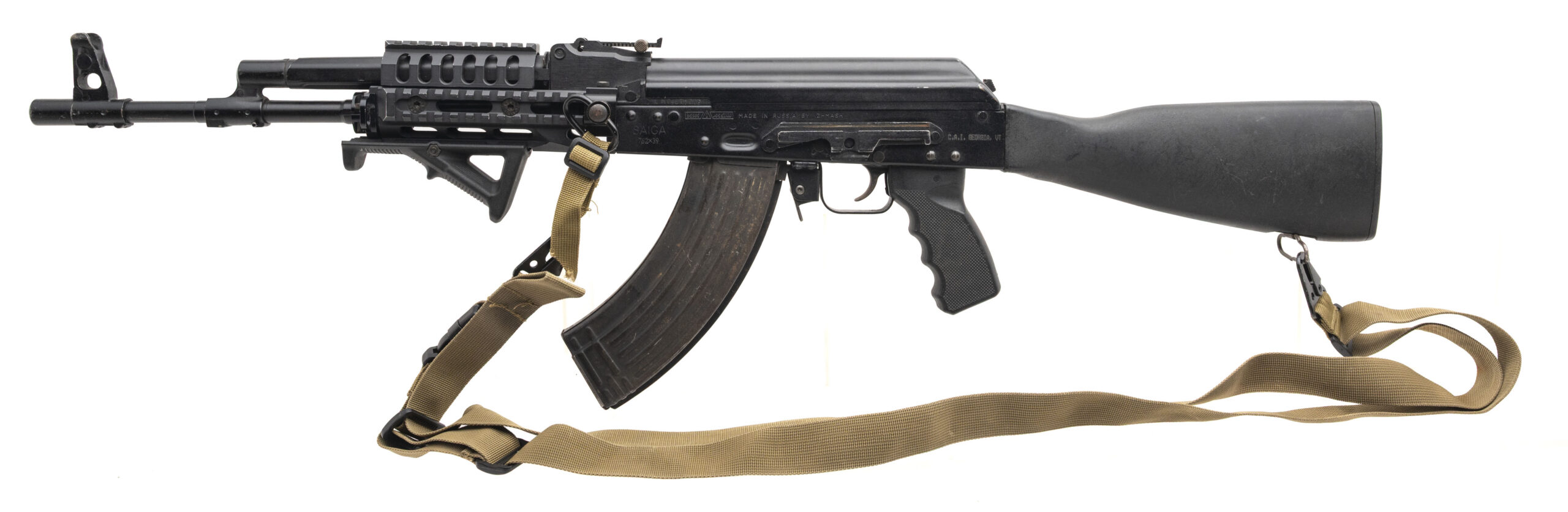 SN: H09607015. Modern production, 7.62x39mm with a 16" barrel. Bore is very good. Russian made AK rifle with a quad rail, angled grip, and an fde two-point sling. Century Arms import that was converted to a standard AK configuration with the addition of the two piece pistol grip & buttstock. Very good condition overall.