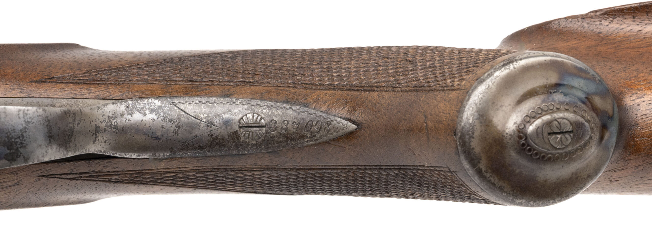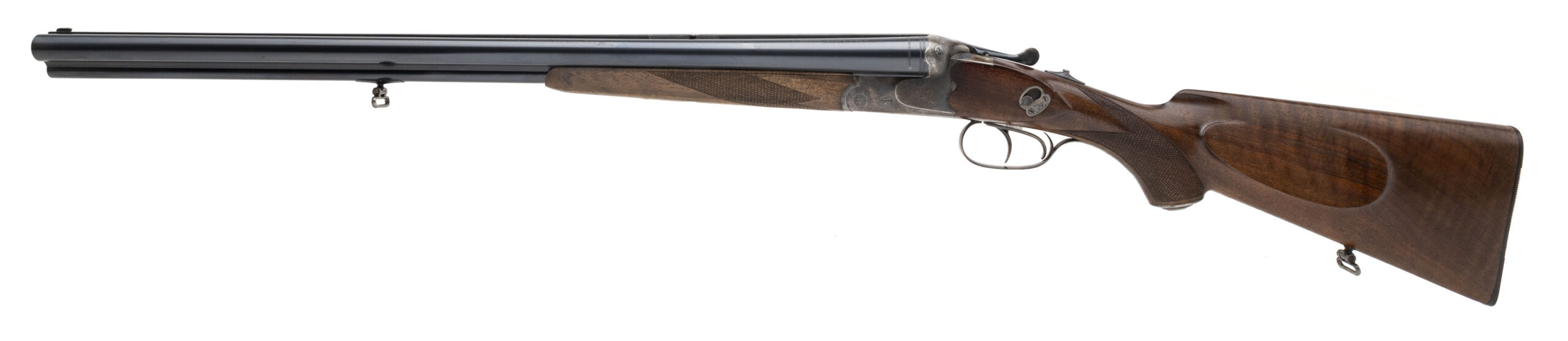 Serial number 337098. Made circa 1941 – 1942. 12 Gauge shotgun barrels an 9.3 x 74R rifle barrel that are 25.5” barrel. This gun is in excellent condition with 99%+ of the original blue. The frame has 80% of the original case colors. The wood is excellent. The right hand side of the stock has the eagle over the swastika. The barrel has the eagle over the swastika as well. These guns were in the cock pits of the Luftwaffe planes in case of a crash. These guns were to be used for survival and therefore the reason of a drilling with both rifle and shotgun.