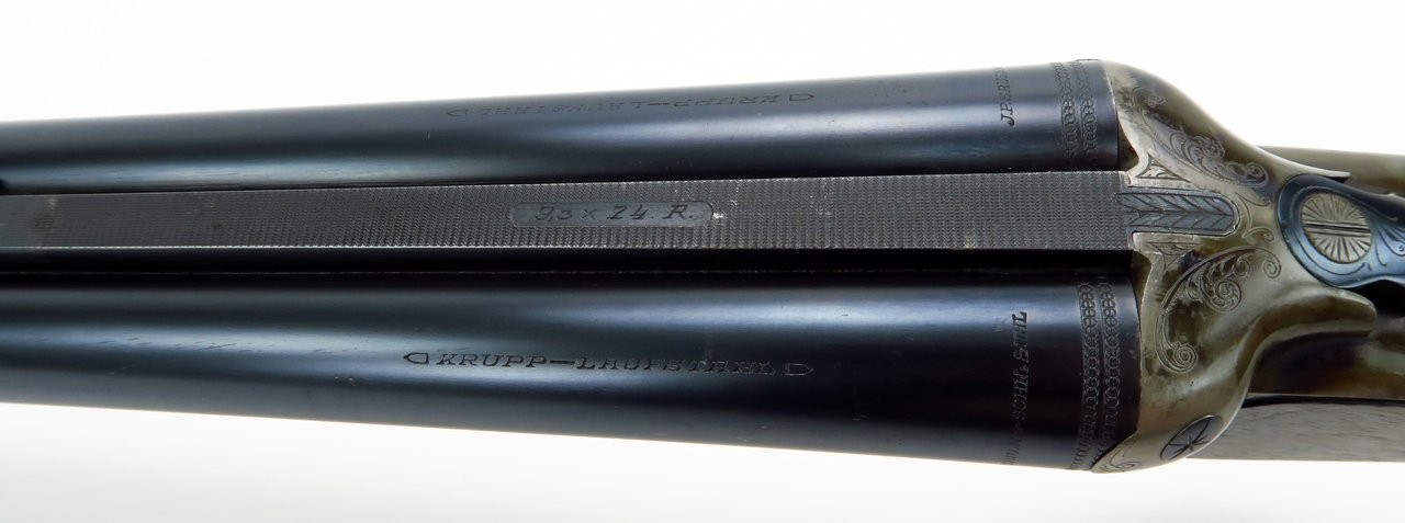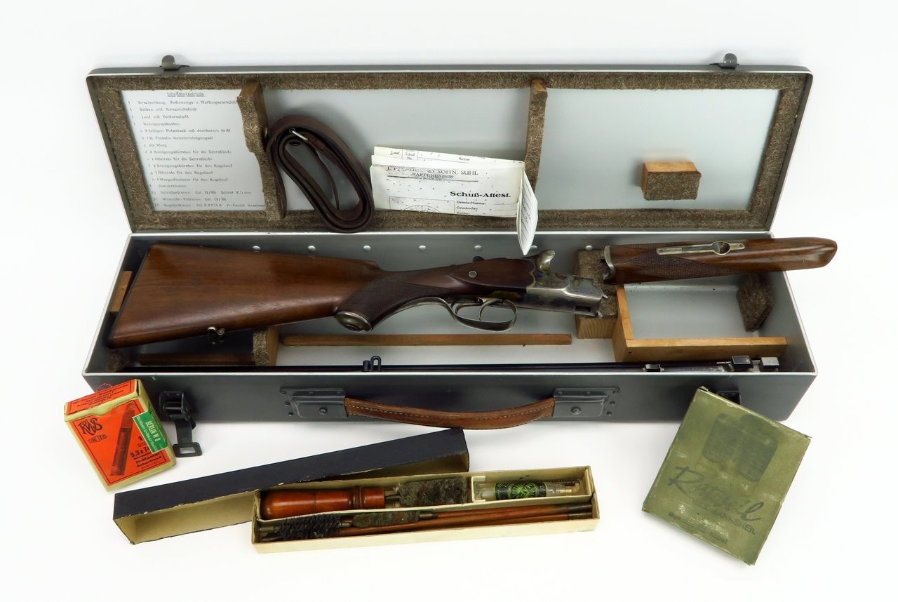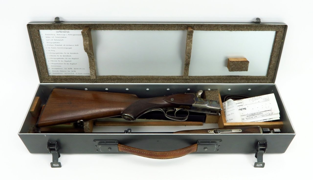J.P. Sauer M30 Luftwaffe Survival Drilling 12 Gauge / 9.3x74Rmm caliber shotgun. Excellent condition with excellent blue on the barrels and bright case colors. Both barrel and stock have Eagle and Swastika. Gun comes with 2 boxes of ammo, cleaning kit, sling, and a copy of the J.P. Sauer factory paperwork. Case is refinished. These guns were issued to Luftwaffe pilots so if they crashed, they would have means to feed and defend themselves. A very fine Luftwaffe drilling set!