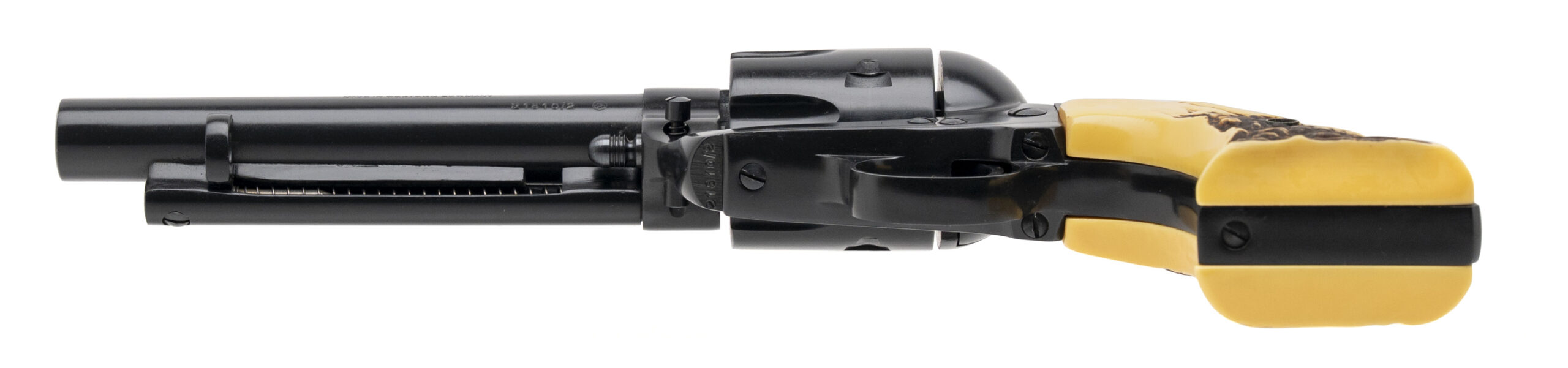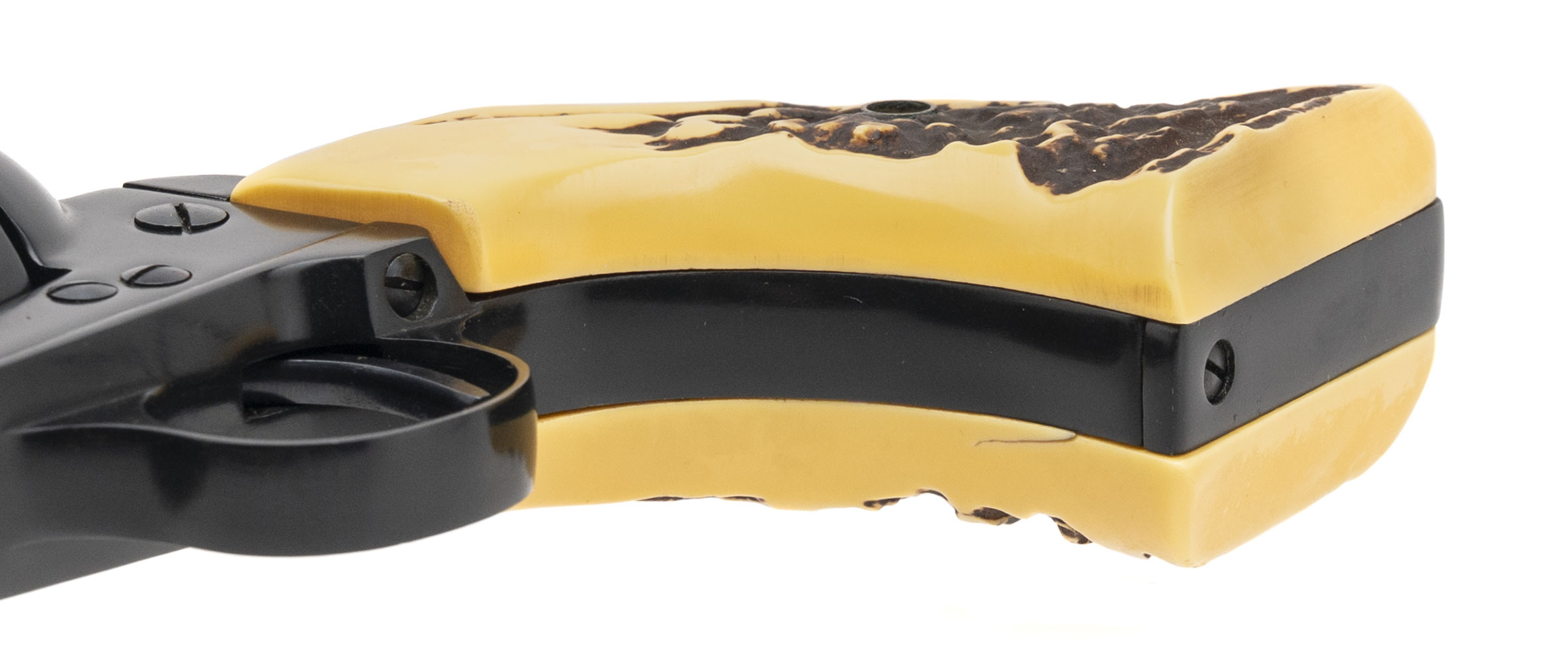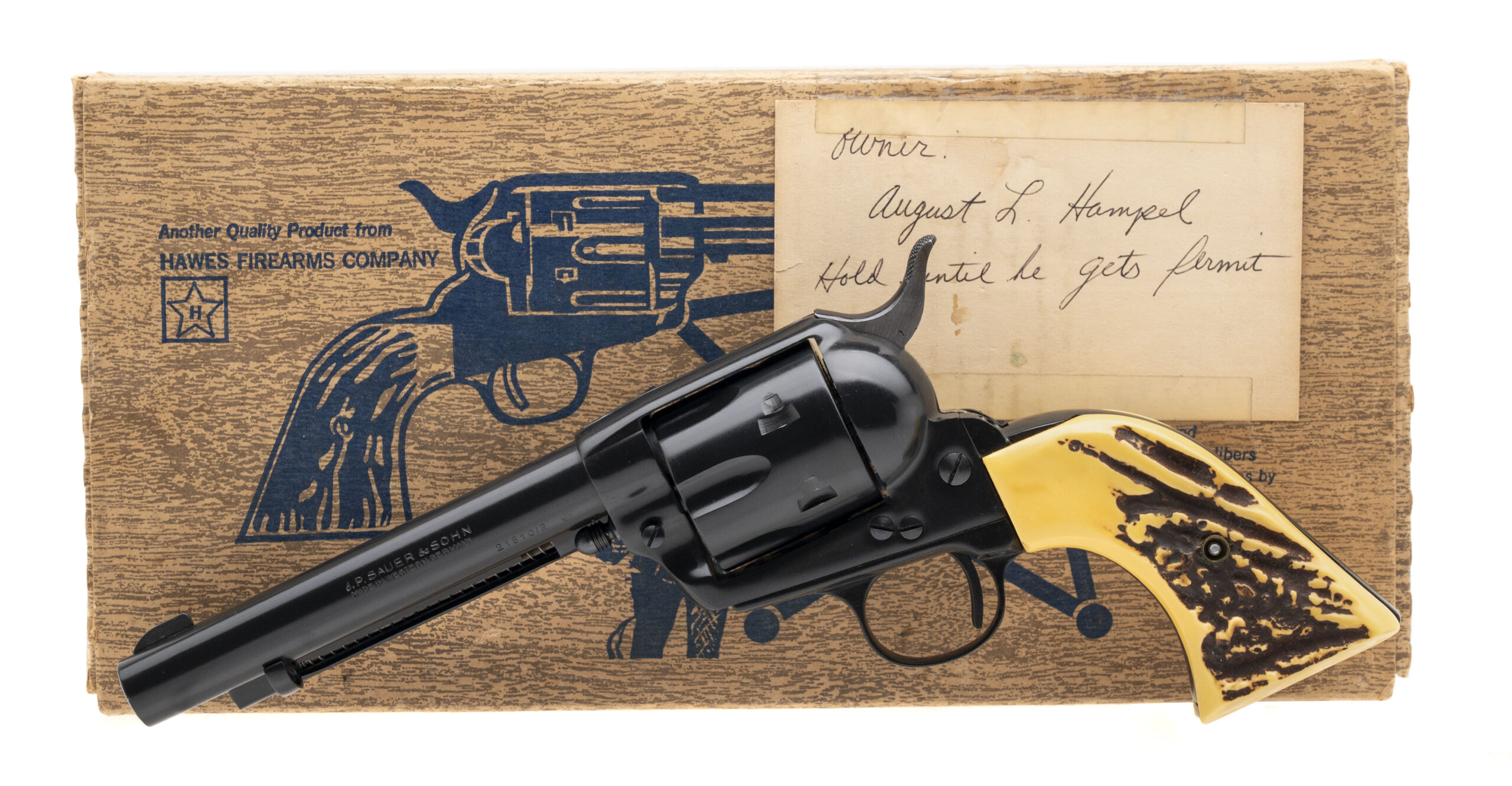 SN: 21810/2 made in Germany circa 1970’s. 22 caliber 6 shot single action revolver with a 5.5” barrel, blued finish and faux stag grips in near excellent condition for the age. Comes with original box.
