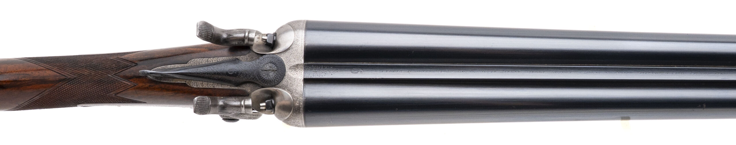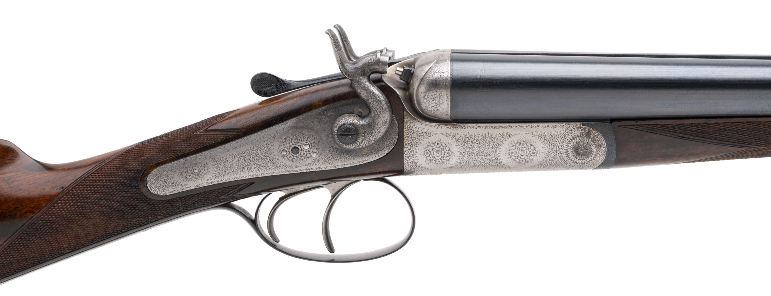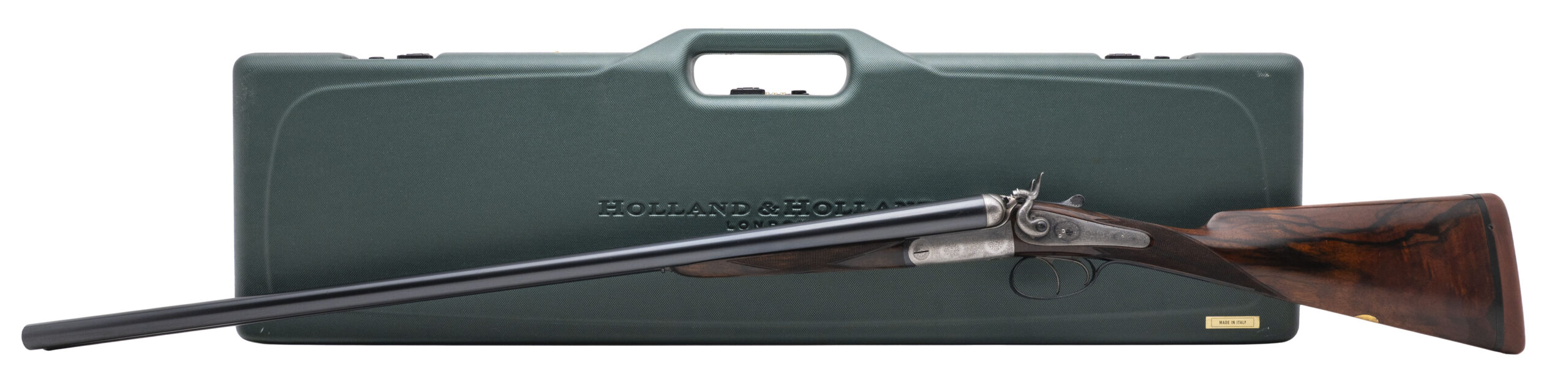 SN: 16598 built in London in 1902 for the Earl of Portsmouth, 12 bore side by side with 30” Whitworth steel barrels, 2 ½” chambers and fixed chokes measuring .011/.025 (IC/IM). Island lock round action hammer gun with double triggers and ejectors which is a rare and unique feature on these guns not often seen. 14 ½” LOP to a red Pachmayr Old English pad with a drop of 1 ½” to 2 1/8”, cast off with a total weight of 6lbs 8.5oz. Bores are excellent and barrels have been re-blacked at some point as expected. Action and lock plates are finely engraved in traditional rose and scroll with some original case color visible near the hammers. Straight stock and splinter forearm with a gold oval in the stock. Overall in very good condition with light wear and some handling marks on the furniture. Comes with H&H Negrini case.