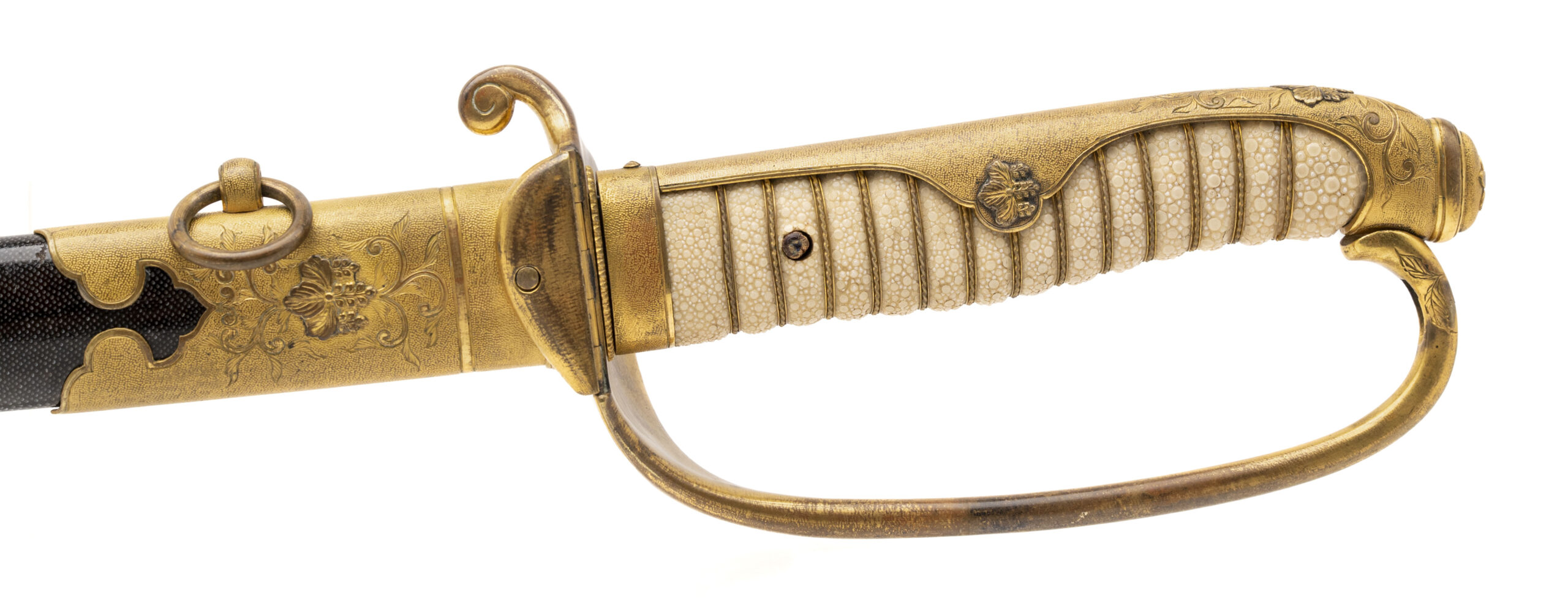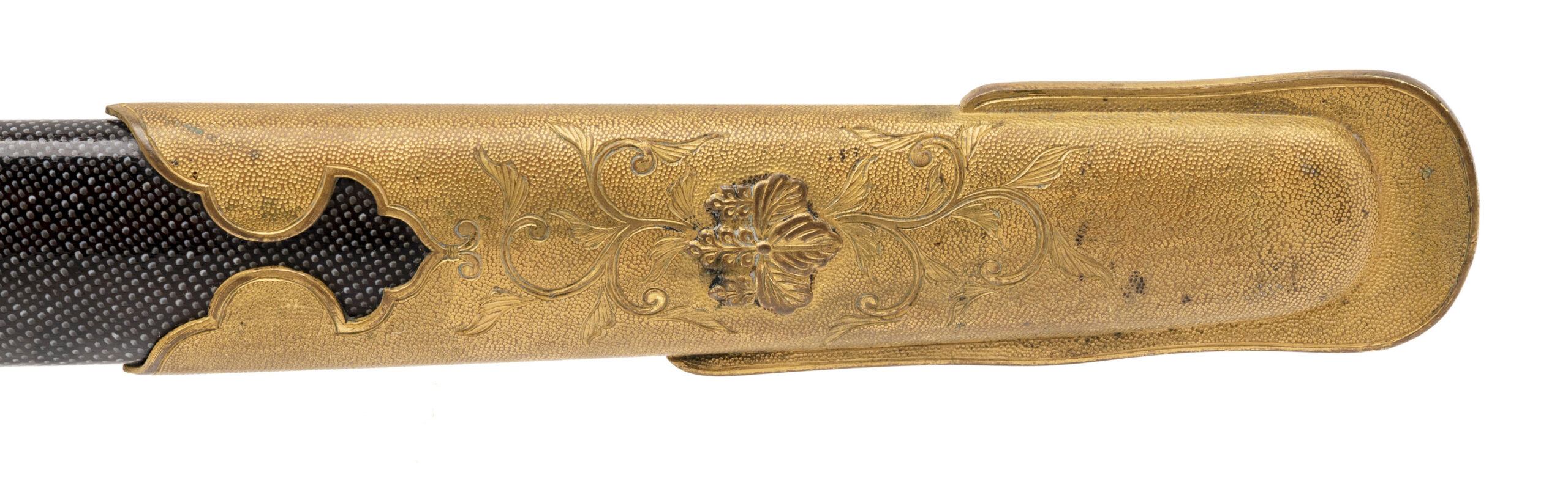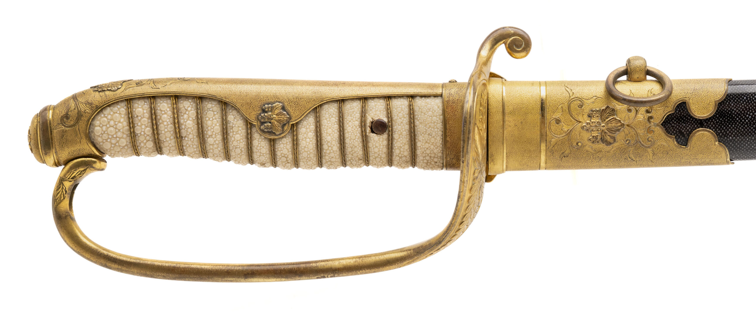 24 7/8” blade. This is an older blade that has been remounted into Russo Japanese War mounts. It has a Kin zogan Mei which is the gold inlaid signature signed Suke Sada. Based on this and the gilded kiri motif on the saya, we believe this could have been an imperial presentation blade. The blade needs to be repolished. Otherwise the outside of the sword is in very fine condition