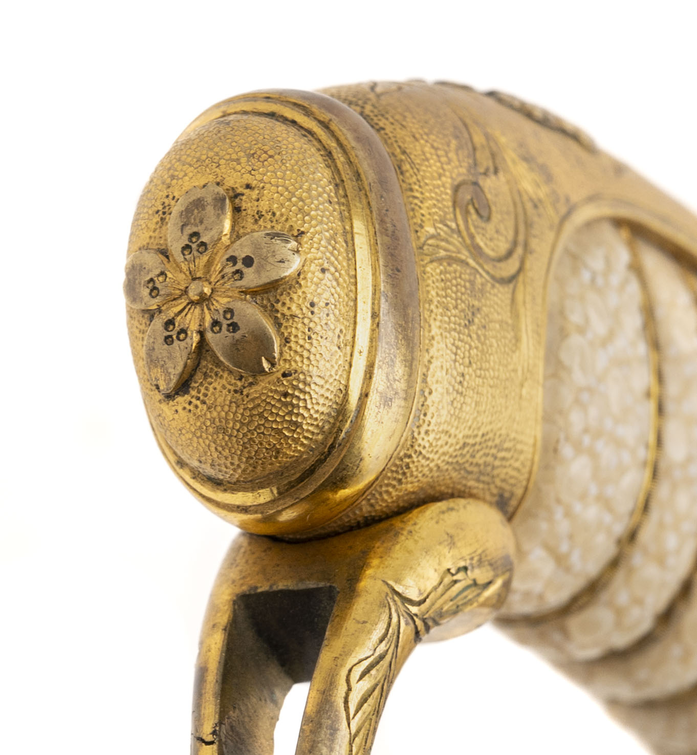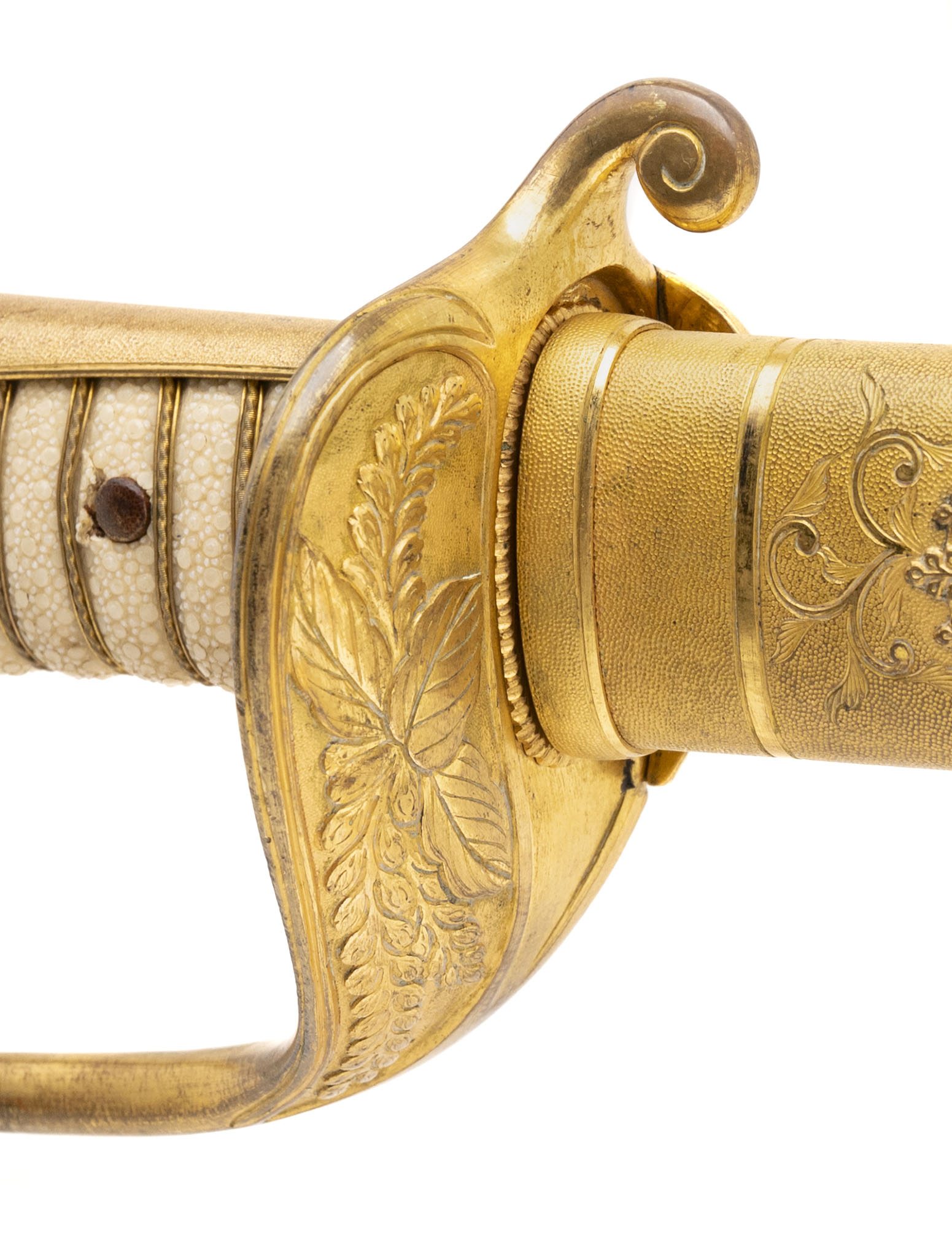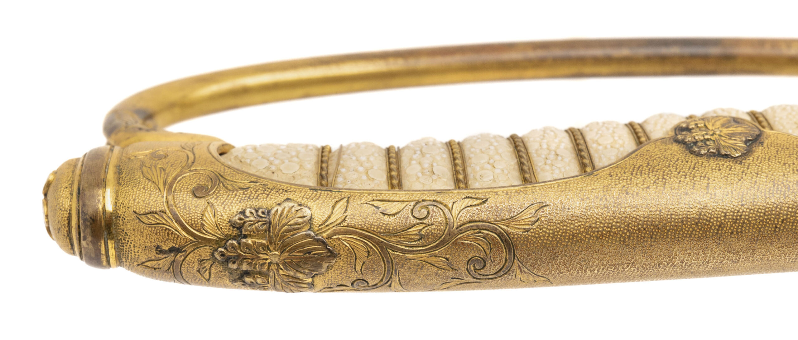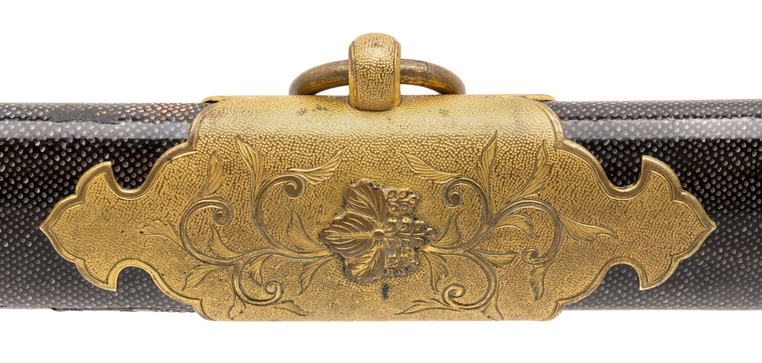 24 7/8” blade. This is an older blade that has been remounted into Russo Japanese War mounts. It has a Kin zogan Mei which is the gold inlaid signature signed Suke Sada. Based on this and the gilded kiri motif on the saya, we believe this could have been an imperial presentation blade. The blade needs to be repolished. Otherwise the outside of the sword is in very fine condition