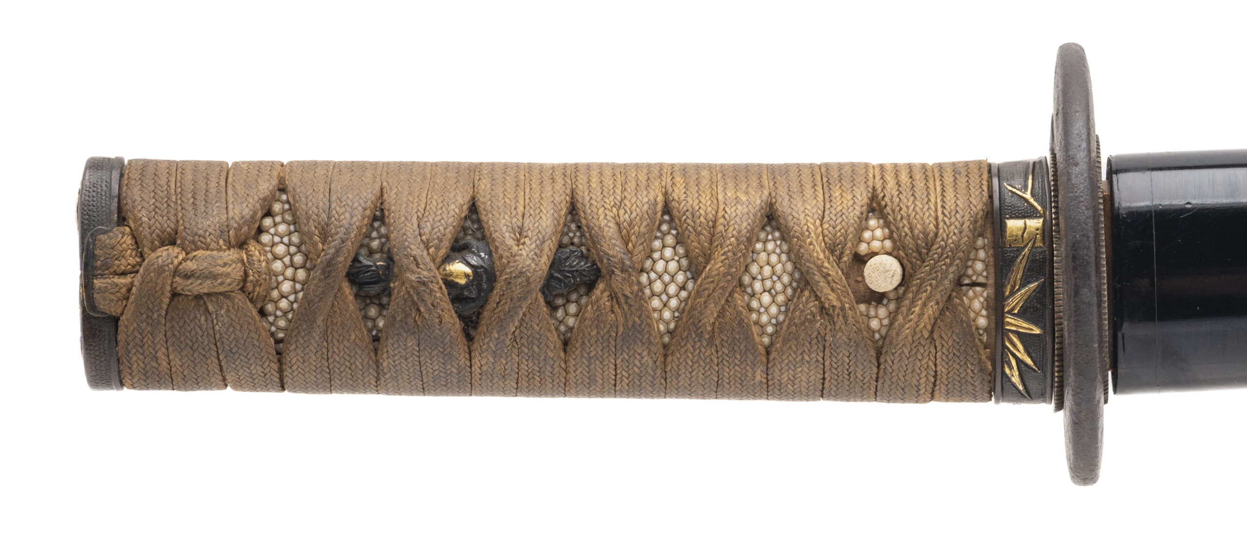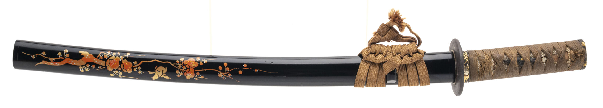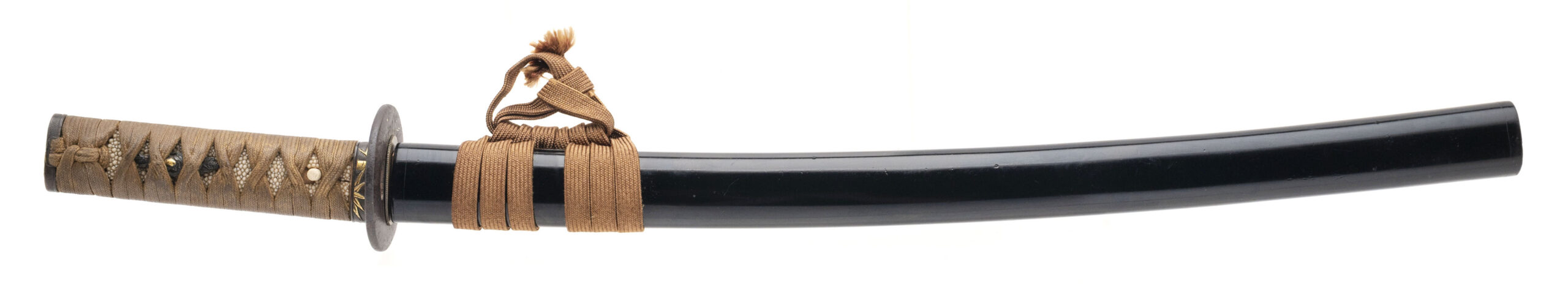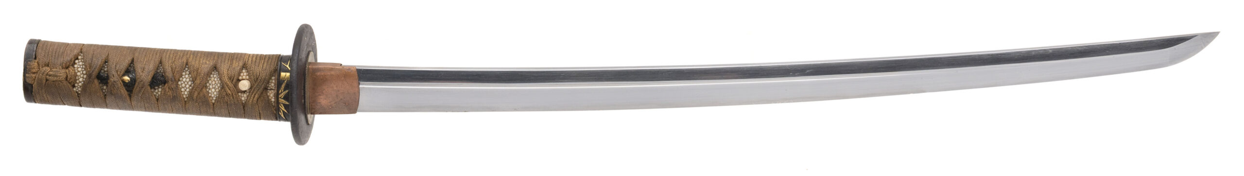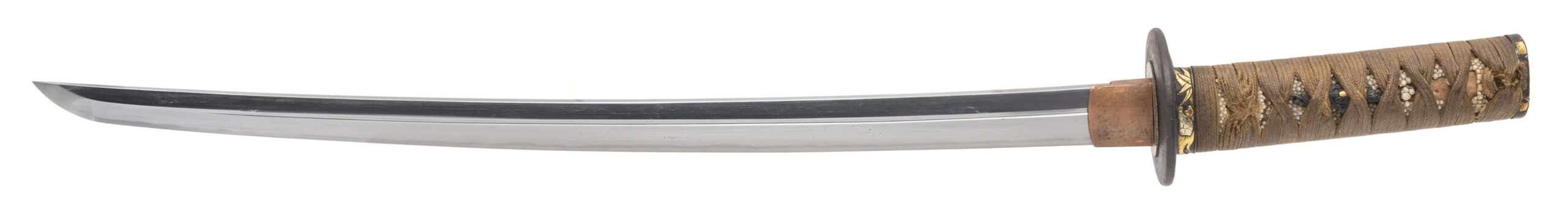 Nagasa: 18.625 inches (47.3 cm) Japan, circa 1450–1550 (blade) / circa 1800–1850 (mountings) A fine and authentic Japanese wakizashi featuring a traditionally forged Koto-period blade dating to the Muromachi era, mounted in high-quality late Edo period civilian koshirae. The blade is of elegant, slender shinogi-zukuri form with shallow natural sori and a well-proportioned chu-kissaki. It exhibits a classic tight suguha hamon, calm and refined, characteristic of early Japanese sword traditions such as Yamashiro or early Mino workmanship. The jihada appears fine and well forged, and the blade is notably light and lively in hand, displaying the graceful balance typical of quality Koto swords. The nakago is unsigned (mumei) and shows deep natural patination with three mekugi-ana, indicating repeated remounting over centuries of service—an attribute commonly encountered on genuine Koto blades that remained in use through multiple periods. The sword is mounted in attractive and matching late Edo period civilian koshirae. The fuchi and kashira are shakudō with fine nanako ground and high-relief gold takazōgan depicting auspicious motifs including bamboo, birds, and a tortoise (symbols of resilience, harmony, and longevity). Matching shakudō menuki with gold highlights are mounted beneath the original brown silk tsuka-ito over full samegawa panels. The iron tsuba is of classic round form, decorated with subtle gold inlay landscape and figure motifs, and the saya is finished in black lacquer with elegant gilt floral decoration. This is an excellent example of an early Japanese blade preserved and appreciated through later generations, combining the historical significance of the Koto period with the refined aesthetics of Edo-era mountings. A highly collectible sword suitable for the advanced nihontō collector or as a centerpiece example of early Japanese craftsmanship.