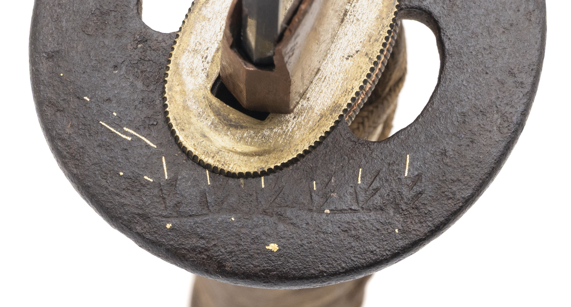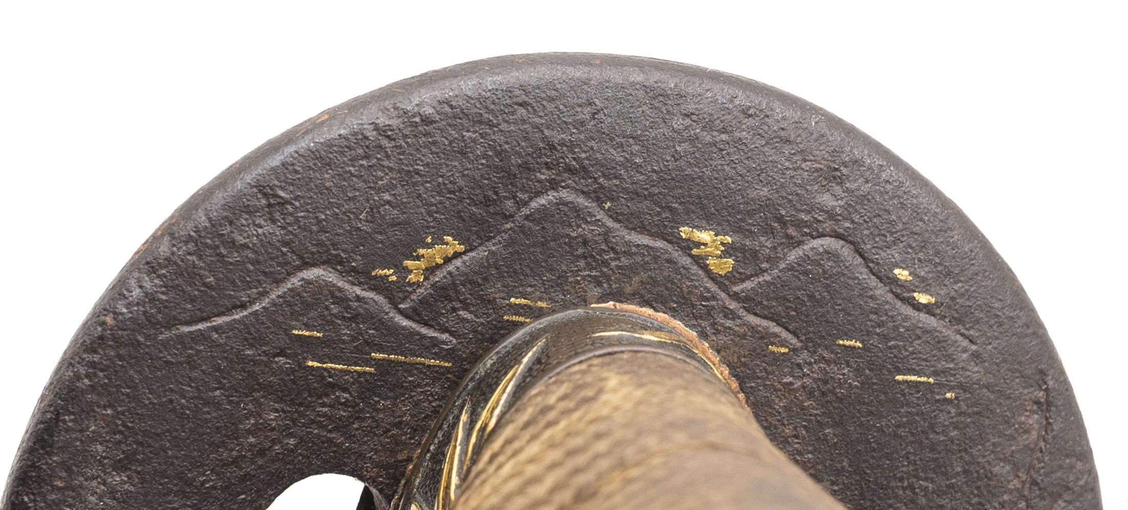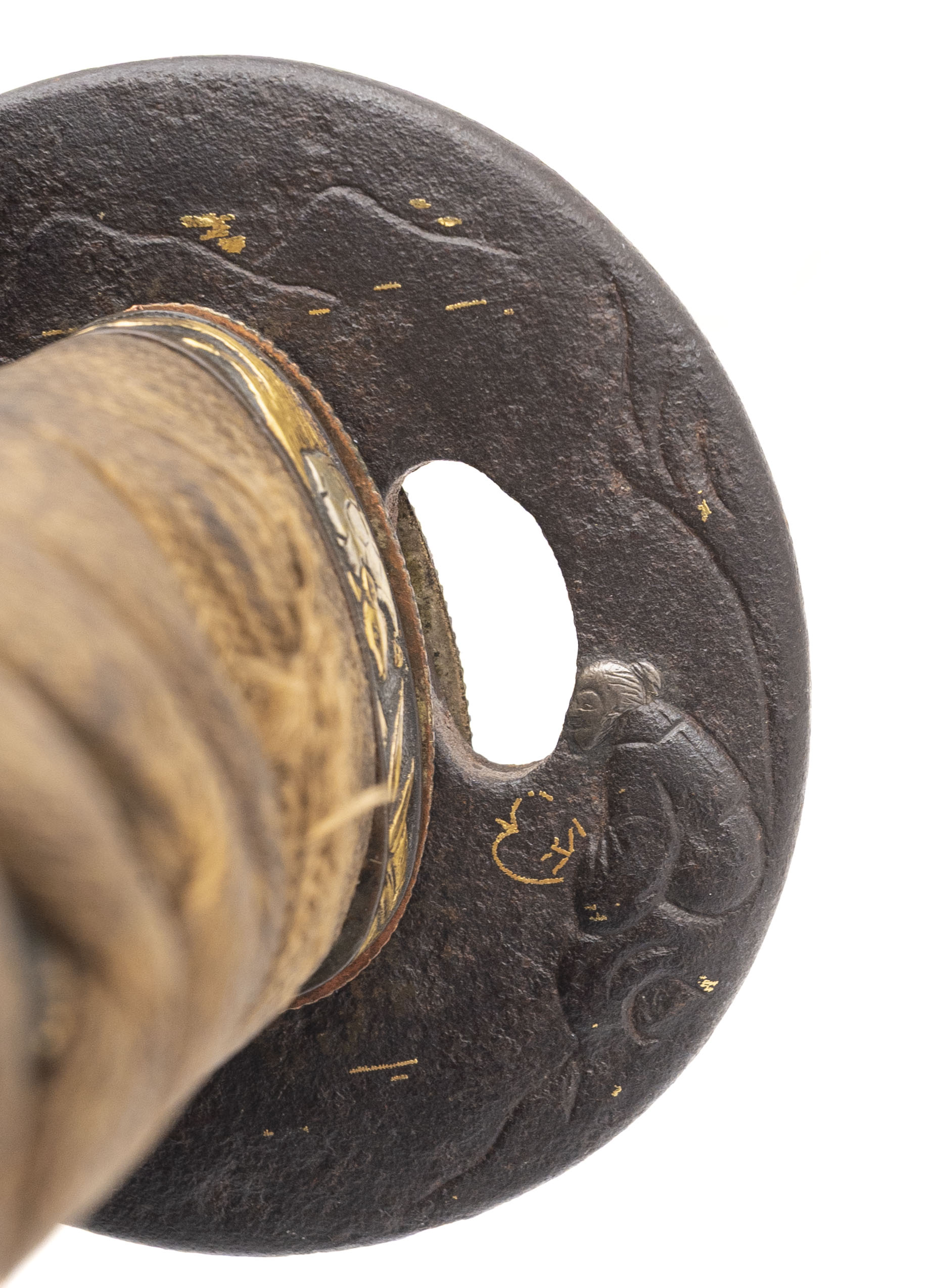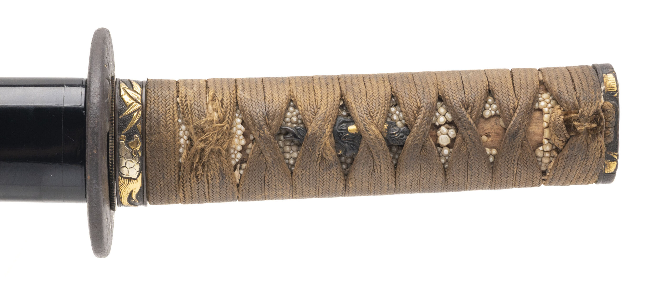 Nagasa: 18.625 inches (47.3 cm) Japan, circa 1450–1550 (blade) / circa 1800–1850 (mountings) A fine and authentic Japanese wakizashi featuring a traditionally forged Koto-period blade dating to the Muromachi era, mounted in high-quality late Edo period civilian koshirae. The blade is of elegant, slender shinogi-zukuri form with shallow natural sori and a well-proportioned chu-kissaki. It exhibits a classic tight suguha hamon, calm and refined, characteristic of early Japanese sword traditions such as Yamashiro or early Mino workmanship. The jihada appears fine and well forged, and the blade is notably light and lively in hand, displaying the graceful balance typical of quality Koto swords. The nakago is unsigned (mumei) and shows deep natural patination with three mekugi-ana, indicating repeated remounting over centuries of service—an attribute commonly encountered on genuine Koto blades that remained in use through multiple periods. The sword is mounted in attractive and matching late Edo period civilian koshirae. The fuchi and kashira are shakudō with fine nanako ground and high-relief gold takazōgan depicting auspicious motifs including bamboo, birds, and a tortoise (symbols of resilience, harmony, and longevity). Matching shakudō menuki with gold highlights are mounted beneath the original brown silk tsuka-ito over full samegawa panels. The iron tsuba is of classic round form, decorated with subtle gold inlay landscape and figure motifs, and the saya is finished in black lacquer with elegant gilt floral decoration. This is an excellent example of an early Japanese blade preserved and appreciated through later generations, combining the historical significance of the Koto period with the refined aesthetics of Edo-era mountings. A highly collectible sword suitable for the advanced nihontō collector or as a centerpiece example of early Japanese craftsmanship.