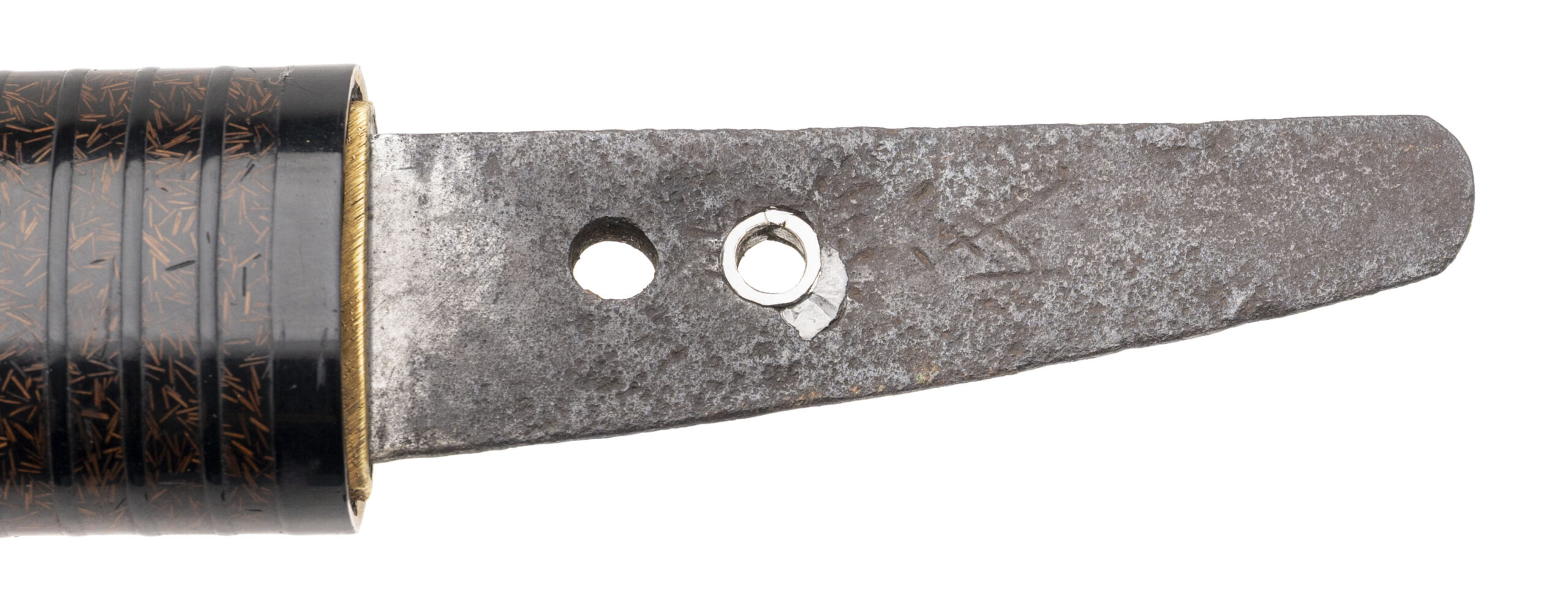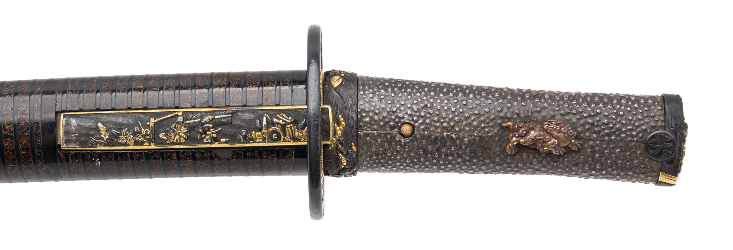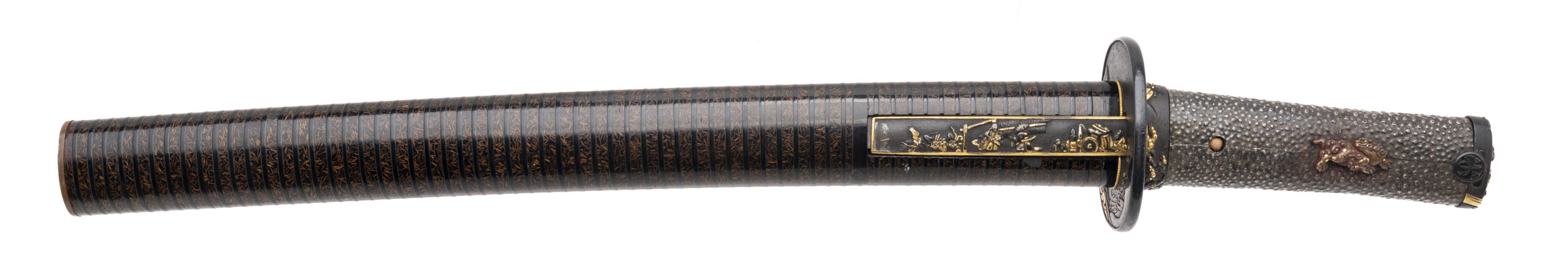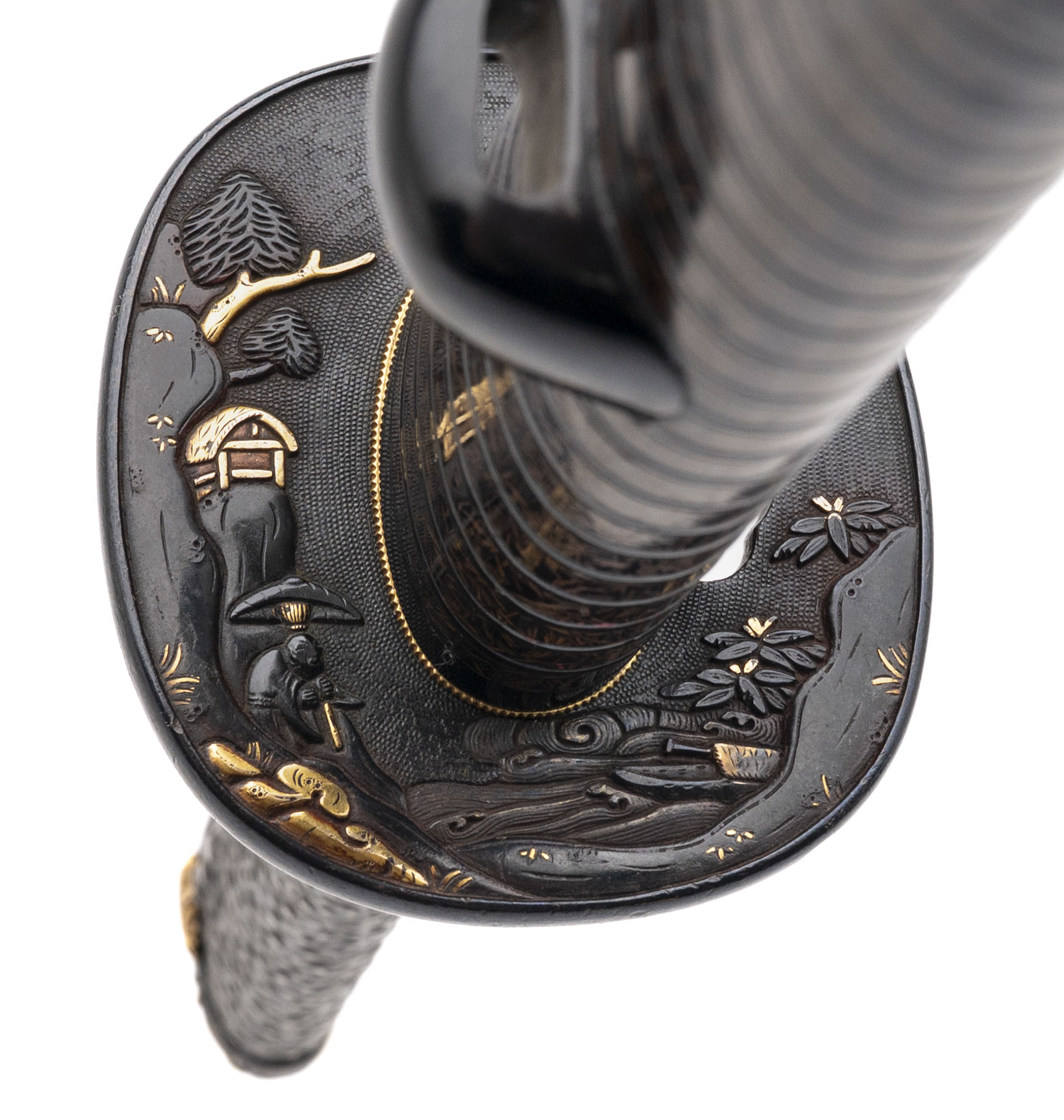This is a fine Japanese tanto signed “Kanekuni” (兼国) of the Mino tradition, dating to the Koto period (late Muromachi, 16th century). The blade measures 12.125 inches (30.8 cm) and is mounted in elaborate Edo-period samurai-themed koshirae. Blade The tanto is forged in hira-zukuri form with a wide body and elegant proportions. The hamon is an active gunome-midare with strong activity and a sweeping kaeri extending well back onto the mune. The hada is visible in the ji, showing a flowing itame typical of Mino workmanship. The tang is ubu, signed Kanekuni (兼国), with two mekugi-ana — the lower mekugi-ana reinforced with a metal collar insert, a feature seen on older blades re-mounted for continued use. The nakago retains a deep, even patina, with clear chisel work on the mei. Koshirae The mounts are of very high quality, themed around the samurai warrior: • Saya: Ribbed lacquer saya with kozuka slot, retaining excellent finish. • Kozuka: Shakudō with nanako ground, decorated in gilt and copper with a procession of armored samurai; signed on the reverse. • Fuchi-kashira: Iron with gilt inlay. The kashira features a warrior in full armor with bow and yari, while the fuchi depicts complementary martial motifs. • Menuki: Finely detailed gilt shishi (lion-dogs) on shakudō, mounted under samegawa grip. • Tsuba: Iron with nanako ground and gilt inlay, decorated with battle and landscape elements in high relief. • Kashira (pommel): Decorated with a gilt armored samurai in dramatic pose. • Kojiri (butt of saya): Decorated with gilt motifs including a squirrel and vine. • Other fittings: Matching gilt and shakudō elements, all unified in theme and execution. • Habaki: A well-fitted solid gold habaki adds both value and prestige. Commentary This tanto is a superb example of the artistry of the Mino tradition combined with Edo-period koshirae craftsmanship. The blade, signed Kanekuni, represents Koto period work from the Sengoku era, while the koshirae showcases later Edo decorative metalwork at its finest. The reinforced mekugi-ana reflects its practical use and re-mounting across generations. Together, the signed blade, luxurious mounts, and gold habaki create a tanto of both martial heritage and high artistic appeal.