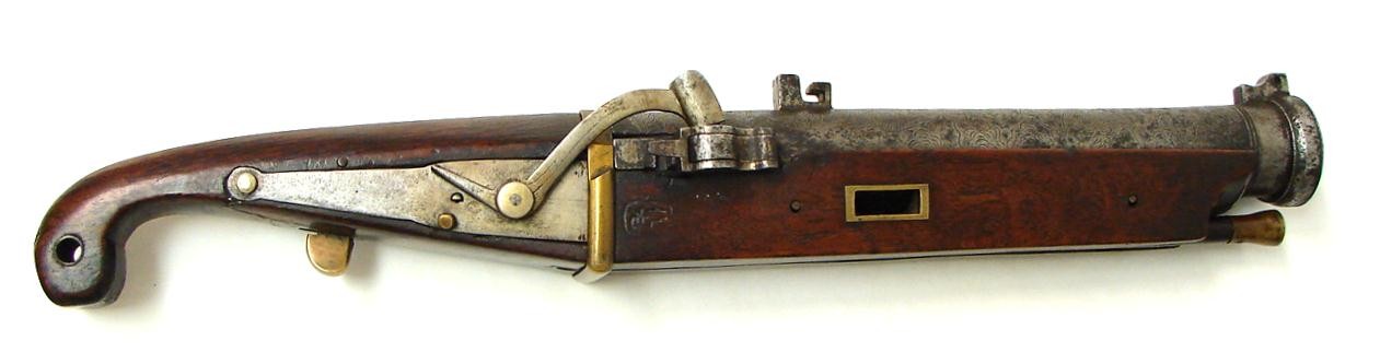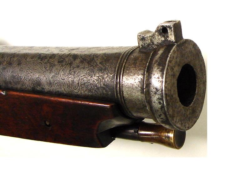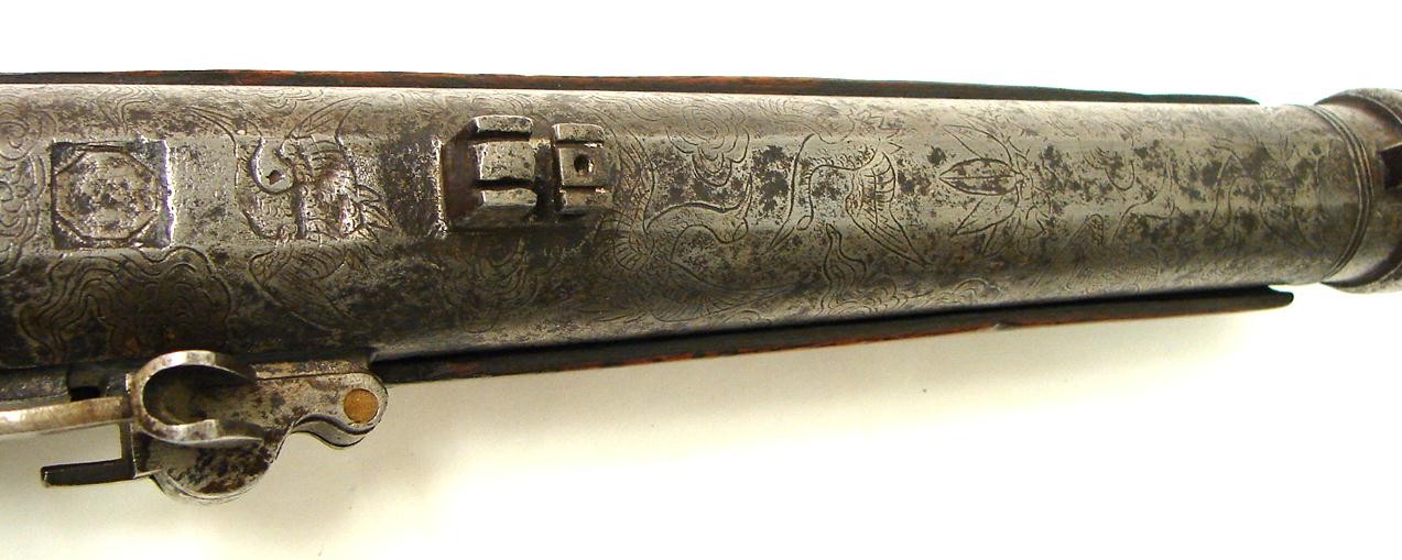 Japanese Matchlock (approximately .80) caliber pistol. Barrel length 10" and overall length 18". Barrel has engraving of Cranes and Insects flying in the clouds. This is a large size pistol that may be more correct to call it a "Hand Canon".