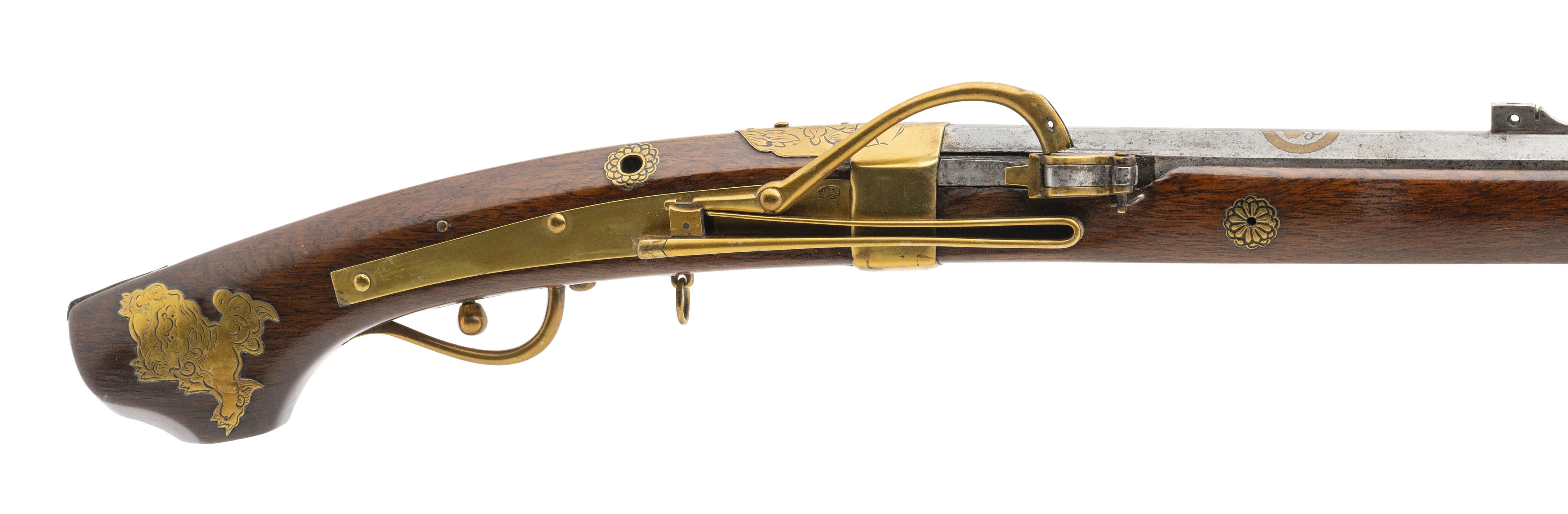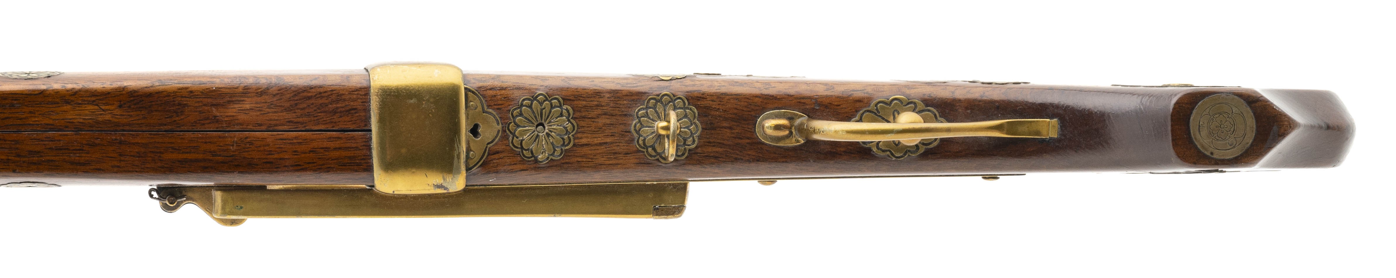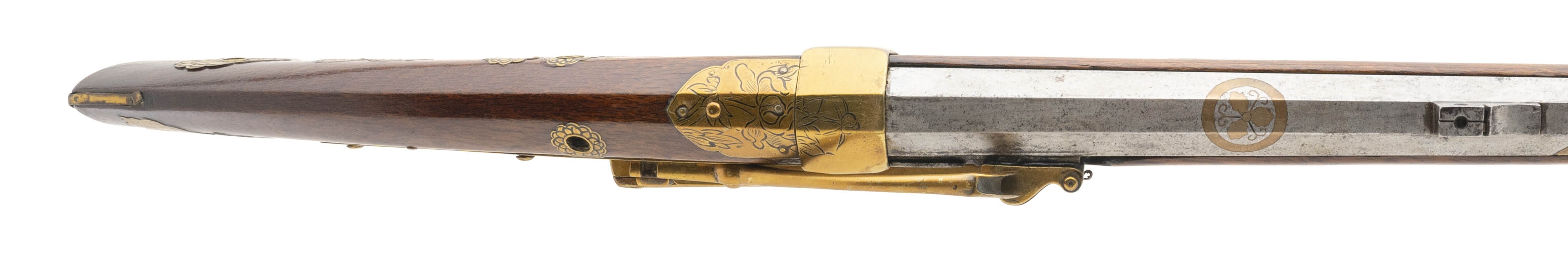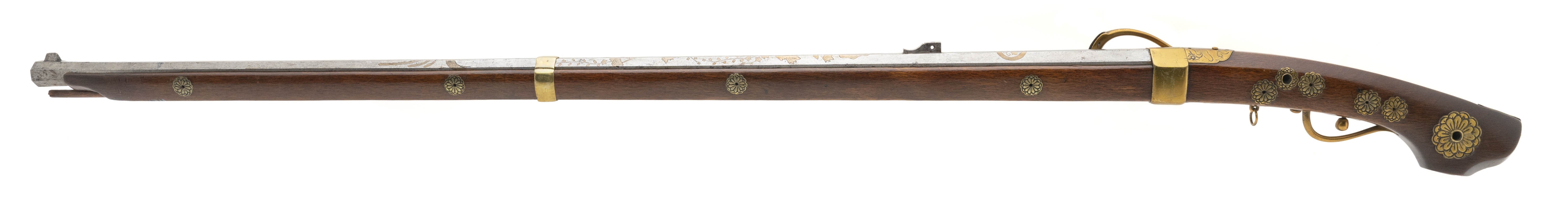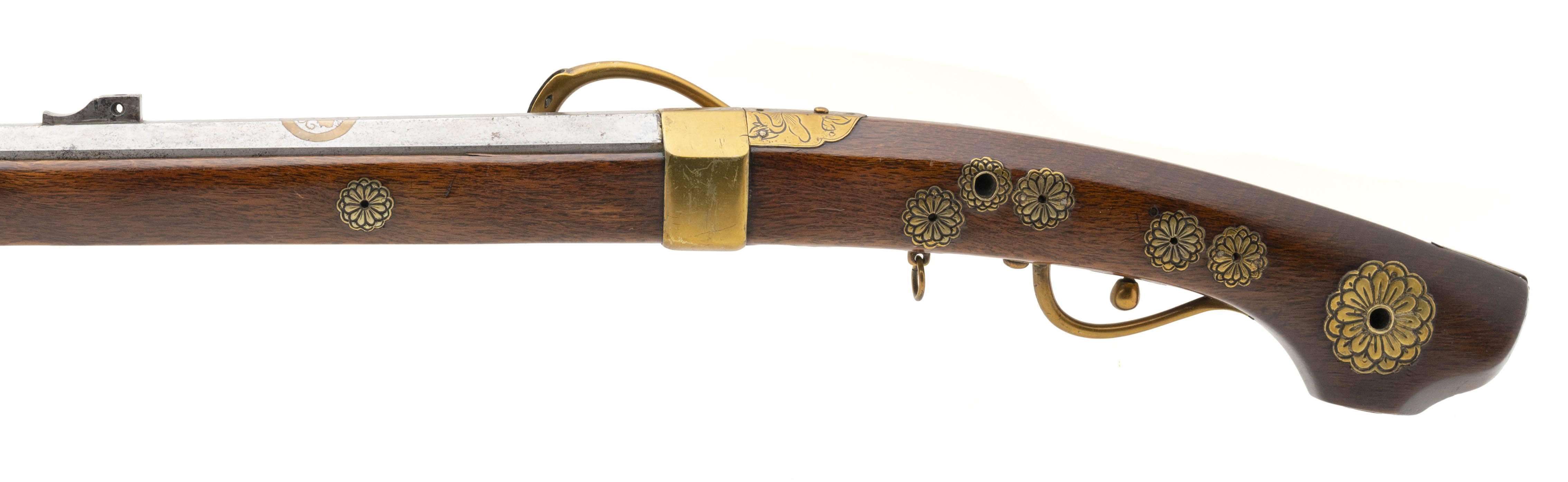 Made circa 1800s. 55 caliber with a 40” barrel. Very fine gun with mixed metal work on the barrel. Stock is very good with brass inlays. This Matchlock is a lot more ornate than you normally fine.