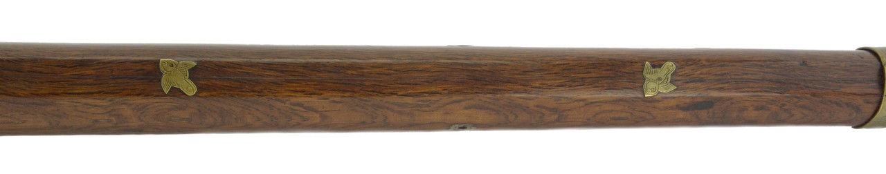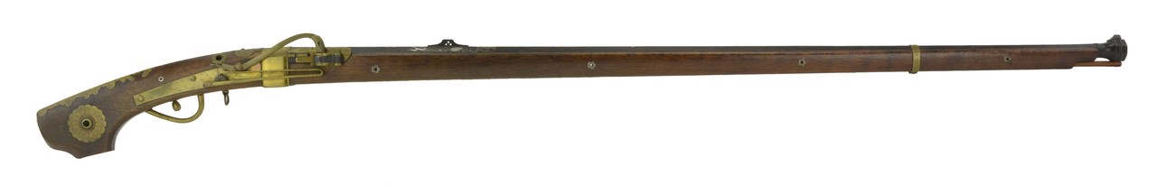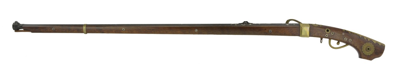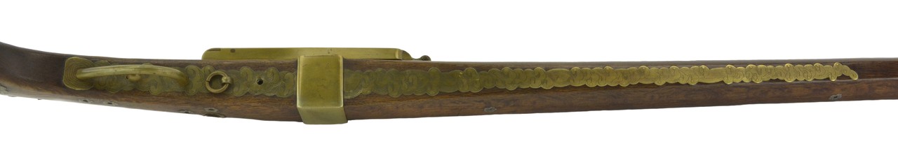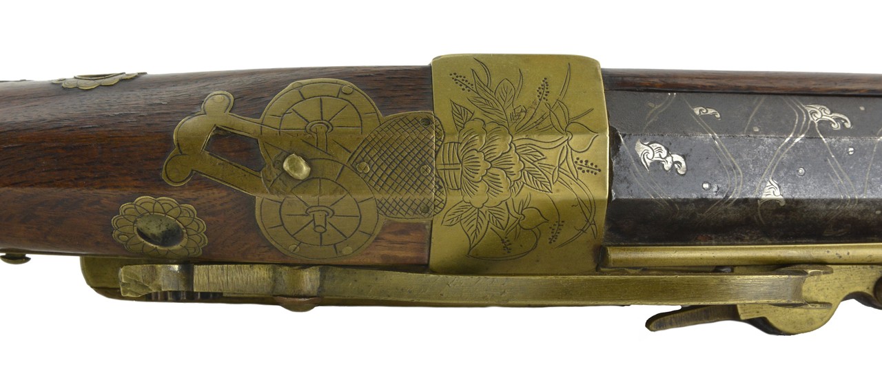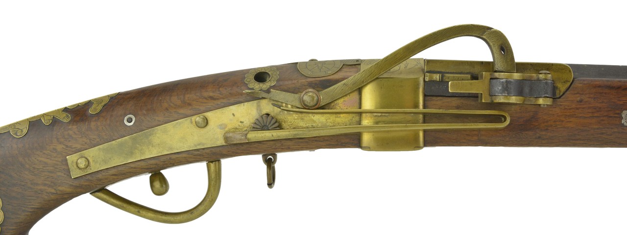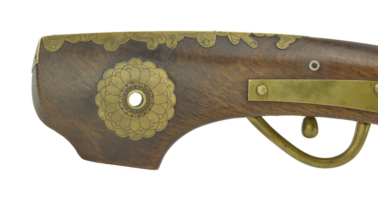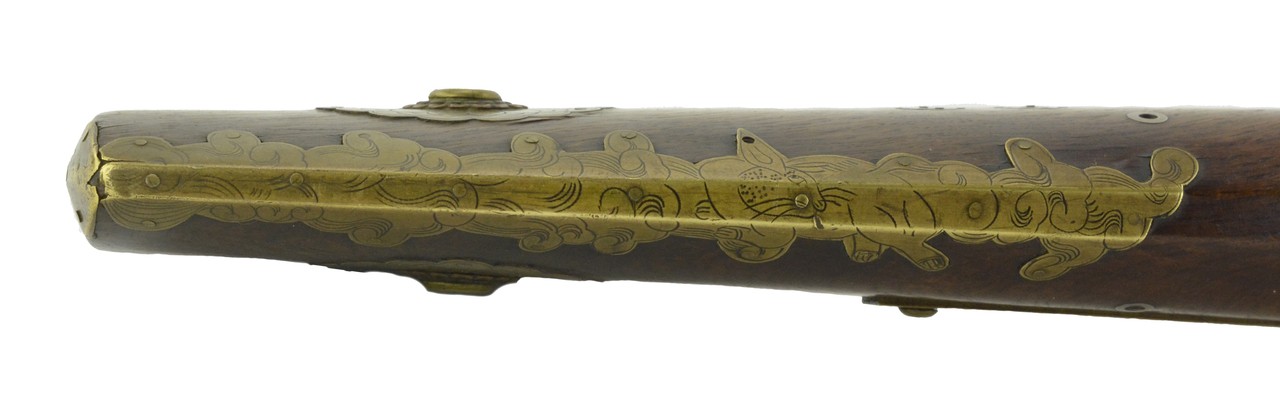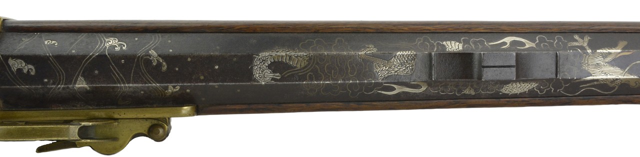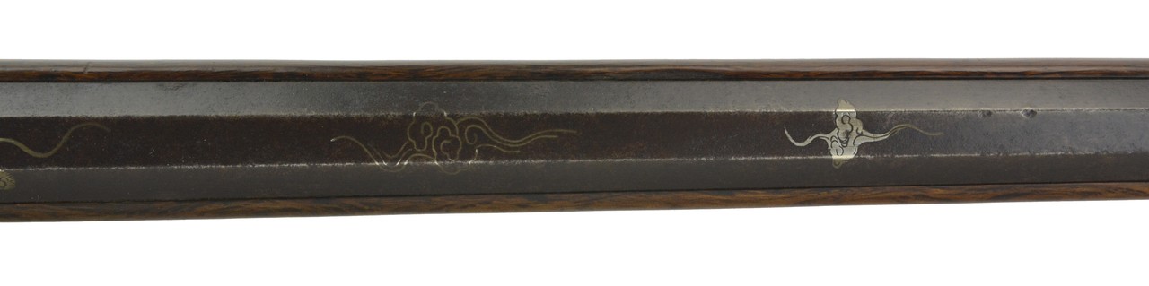 Japanese Tanegashima (matchlock rifle). Excellent condition. Barrel length 41” and 53” overall length. This very fine matchlock is embellished with brass engraved with billowing cloud on the comb and on the underside of the stock from the trigger guard to 19” in front of the trigger guard. Wick holder in the stock has a brass and copper multi floral design. The barrel is seated at the breech in a brass collar with an engraved flower cart. The barrel at the breech is inlaid in silver and brass with undulating waves with silver crests and dots of silver spray moving forward to the rear sight area. There is a silver dragon with a ken sword dipping in and out of the clouds with his head surfacing just in front of the rear sight. Muzzle is an octagonal tulip design as seen on most Japanese Matchlock rifles. The action works perfectly and the condition is super. This is one of the best Japanese Matchlock rifles we have owned both for condition and elegance. Just beautiful! Manufactured circa 1750-1800.