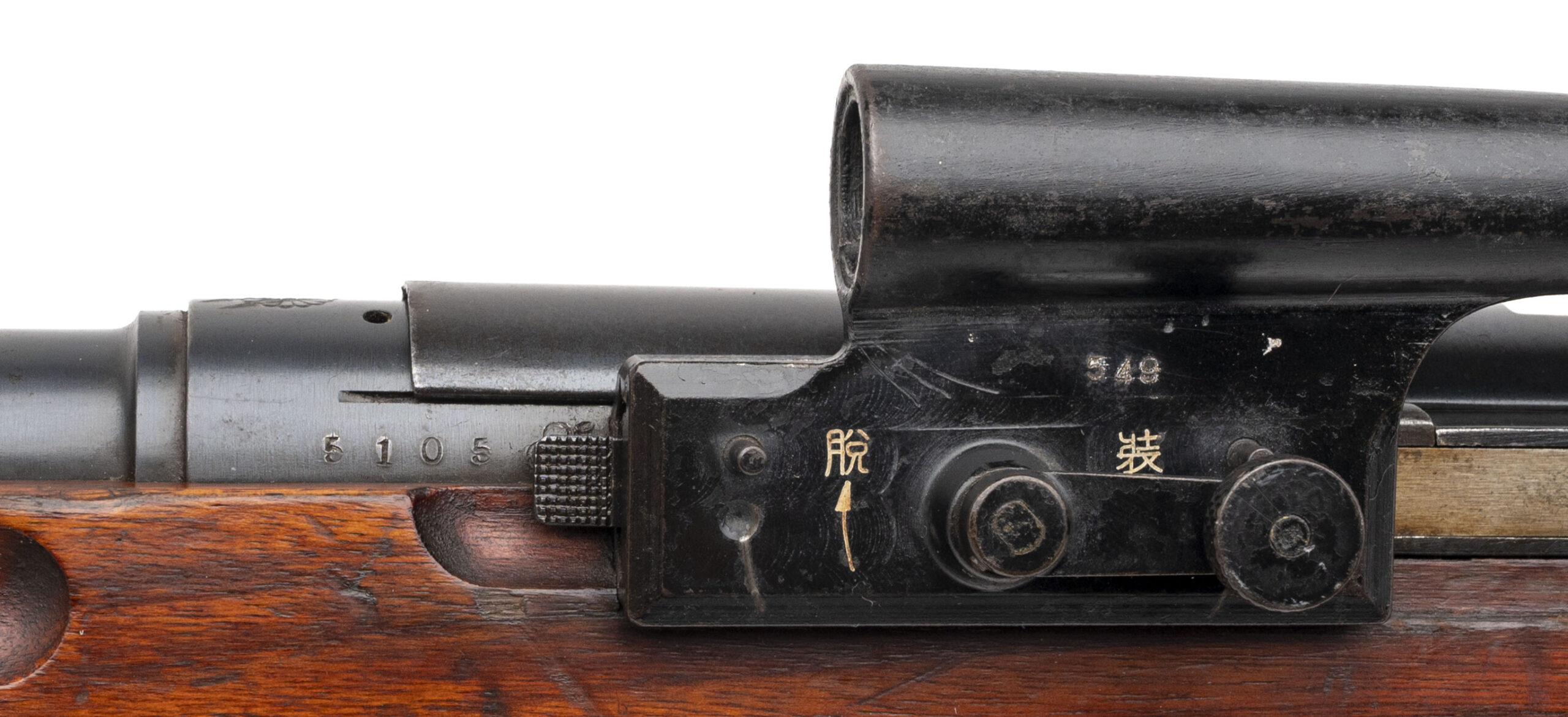 Serial number 5105. Made by Kokura Arsenal in 1938 with a 31.4-inch barrel that has a bright bore with strong visible rifling. This is one of the 8,000 Type 97 sniper rifles made by Kokura between 1937 & 1939. It includes the turned down bolt handle & the 2.5 X 10° telescopic sight. Condition is very good overall with thinning original factory finish across the metallic parts & Japanese Beech hardwood furniture that is completely in tact while also exhibiting light handling wear for a military service rifle. While the exterior of the scope reveals some scratches, the reticle is clear & the rubber eye piece has only a few small cracks in it. No monopod. The Chrysanthemum is struck/defaced. Comes with non-matching dust cover & 29.5-inch cleaning rod.