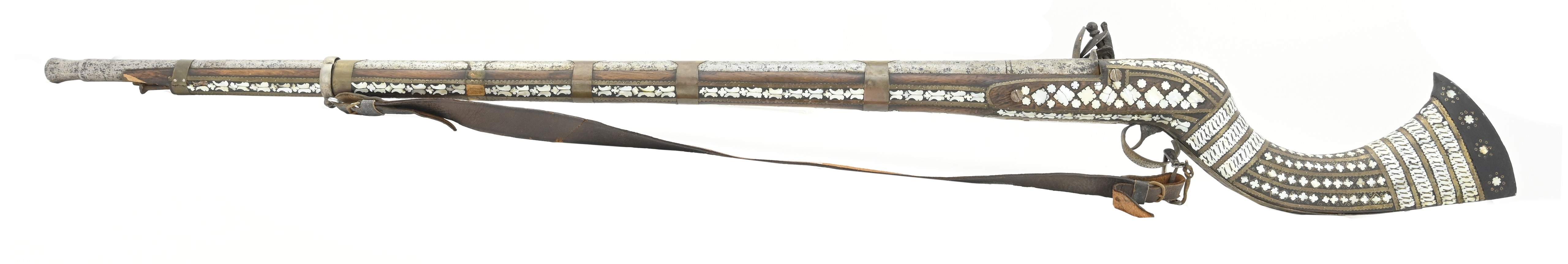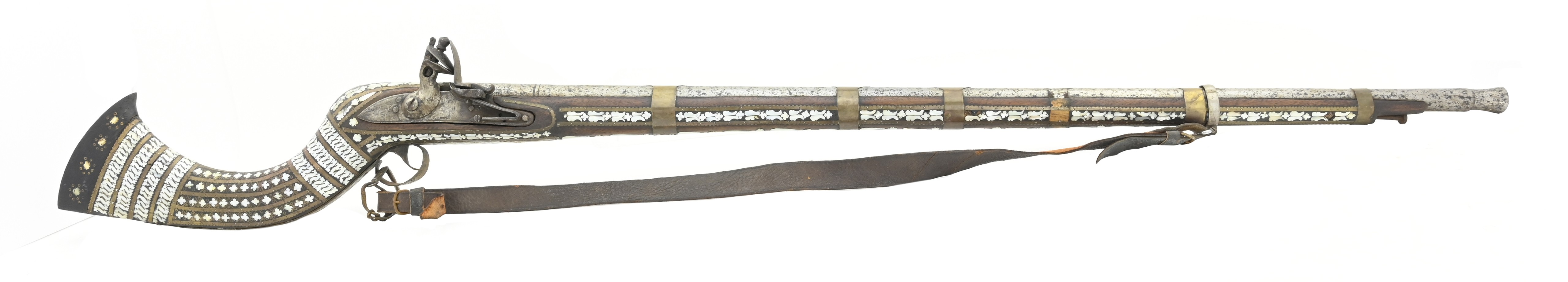 Jezaille “Khyber Pass” rifle. The name of these well-known rifles comes from their use by the Afghan tribesmen that occupied the Khyber Pass and commanded the trade route known as “The Silk Road”. The pass fell in and out of various groups over many years such as: Ottoman Empire, British and others. They are reconized by their form and decoration of Mother of Pearl inlays. They are often found with British Brown Bess lock plates. This gun has an Indian pattern lock plate with prancing lion and dated “1816”. Barrel length 39½” and 54” overall length. Hammer spring and frizzen spring are weak. Gun is otherwise very striking.