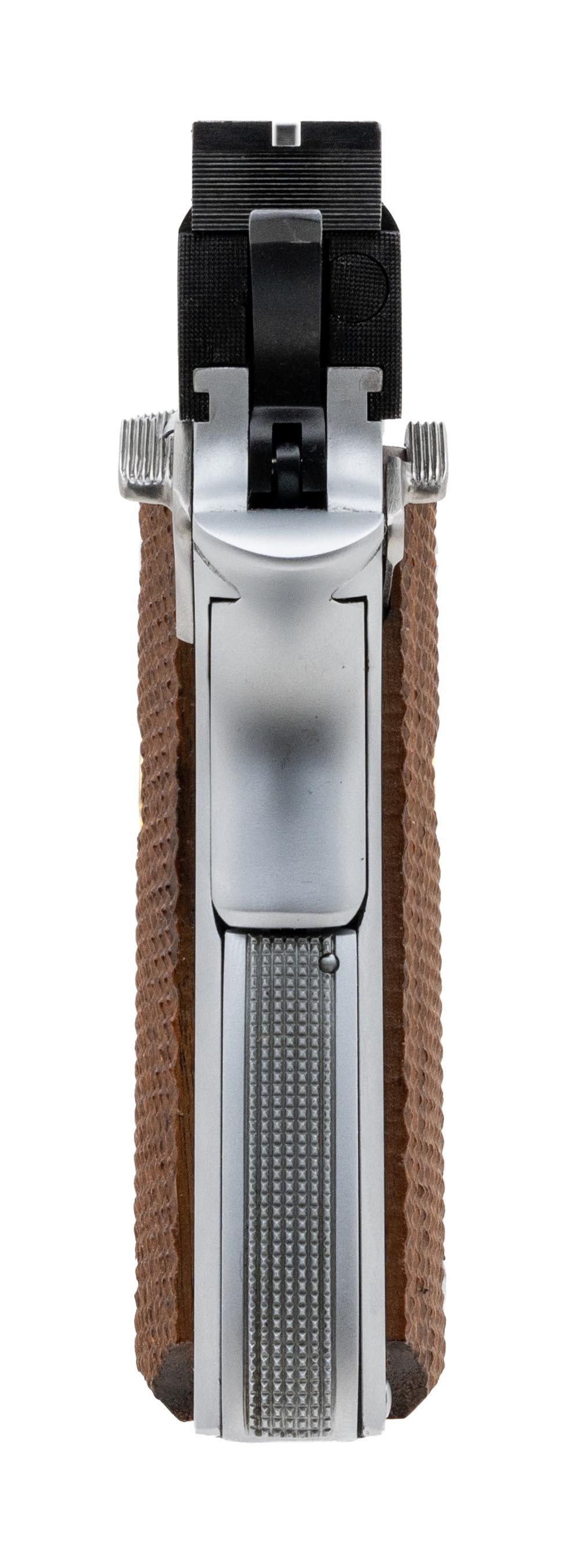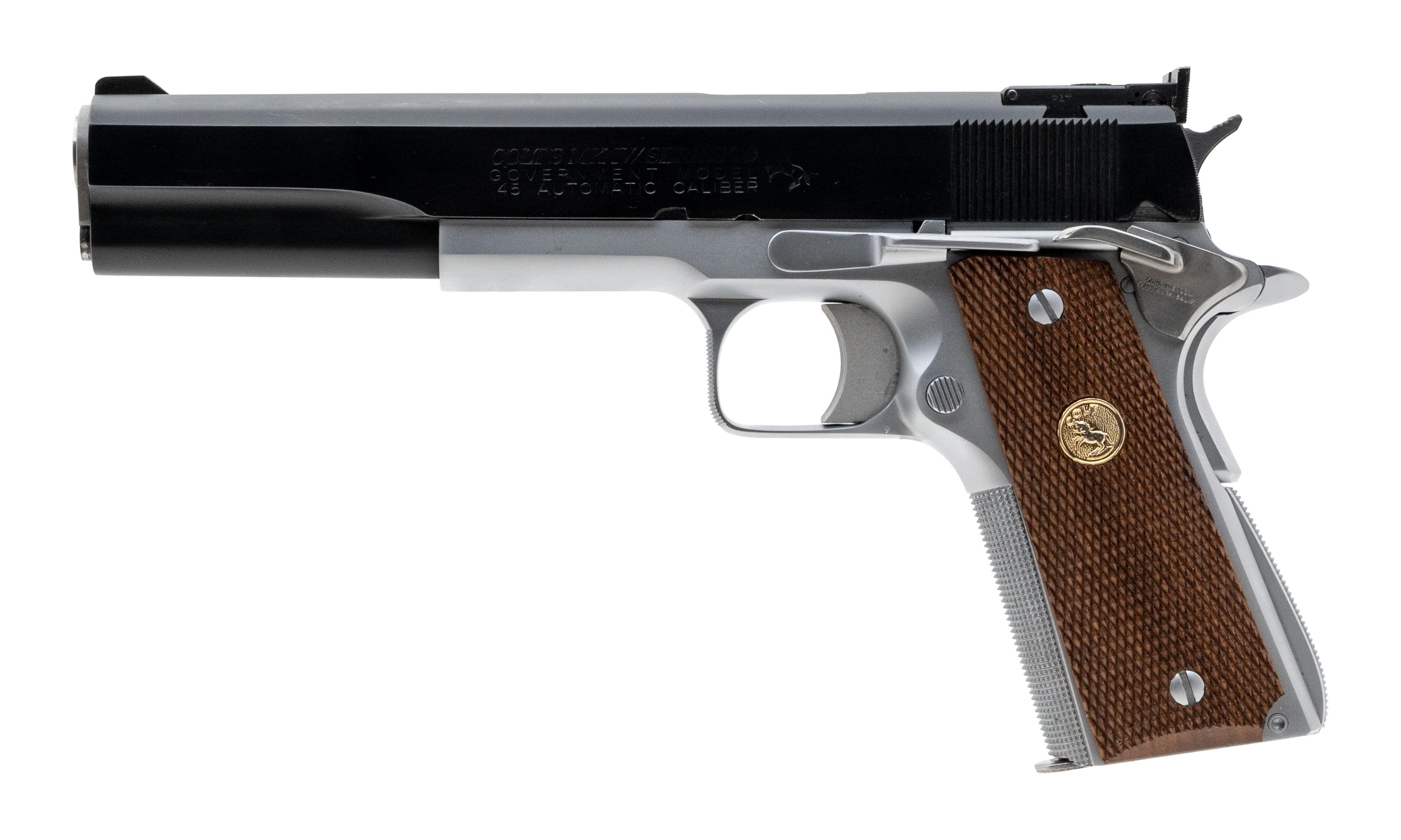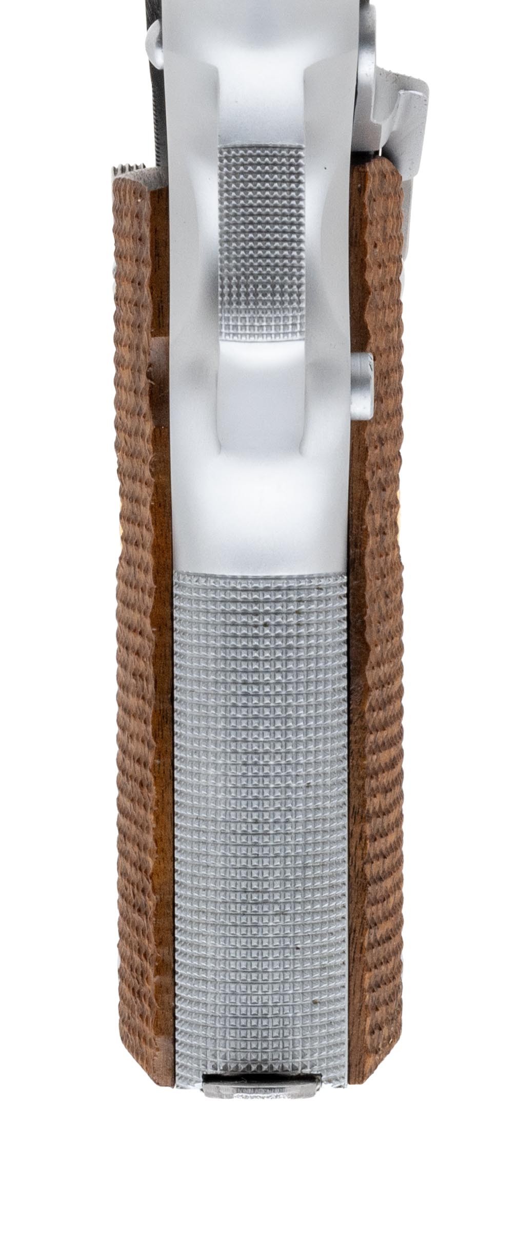 SN: 77351B70. Made in 1981. 45 ACP with a 6" barrel. Outstanding custom longslide 1911 pistol by the late great Master Gunsmith Jim Hoag, signed "J. HOAG" on the underside of the slide. Made on a Colt Series 70 Government, has a Bar-Sto 6" barrel, Bo-Mar sight, Swenson ambi safety, squared and checkered trigger guard and checkered grip frame. The slide is blued and the frame is hard chromed. The gun is in excellent condition, hardly used since built. An excellent example of the late Master's craftmanship.