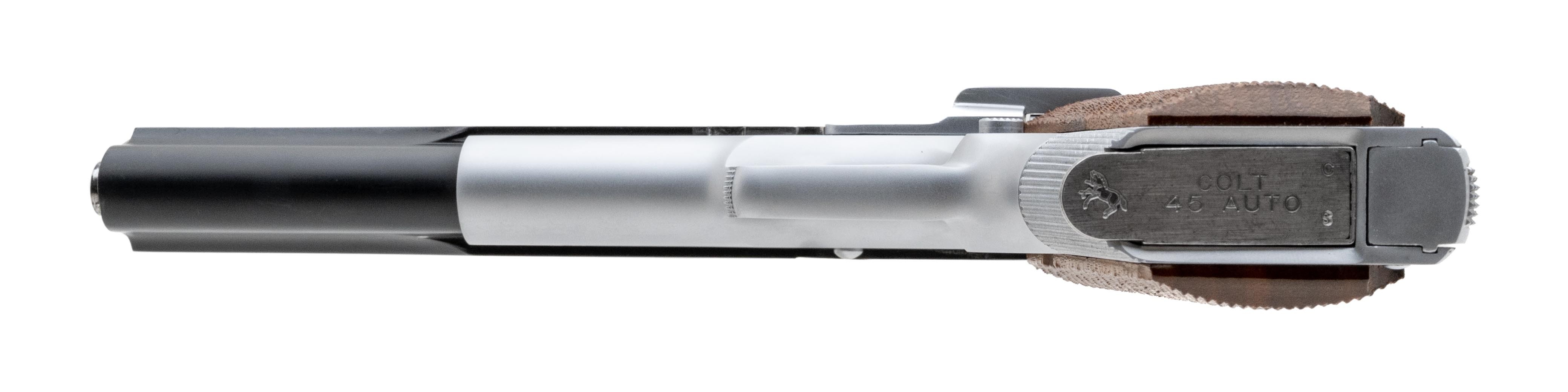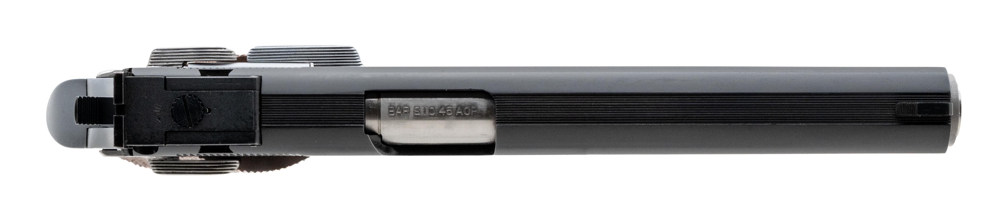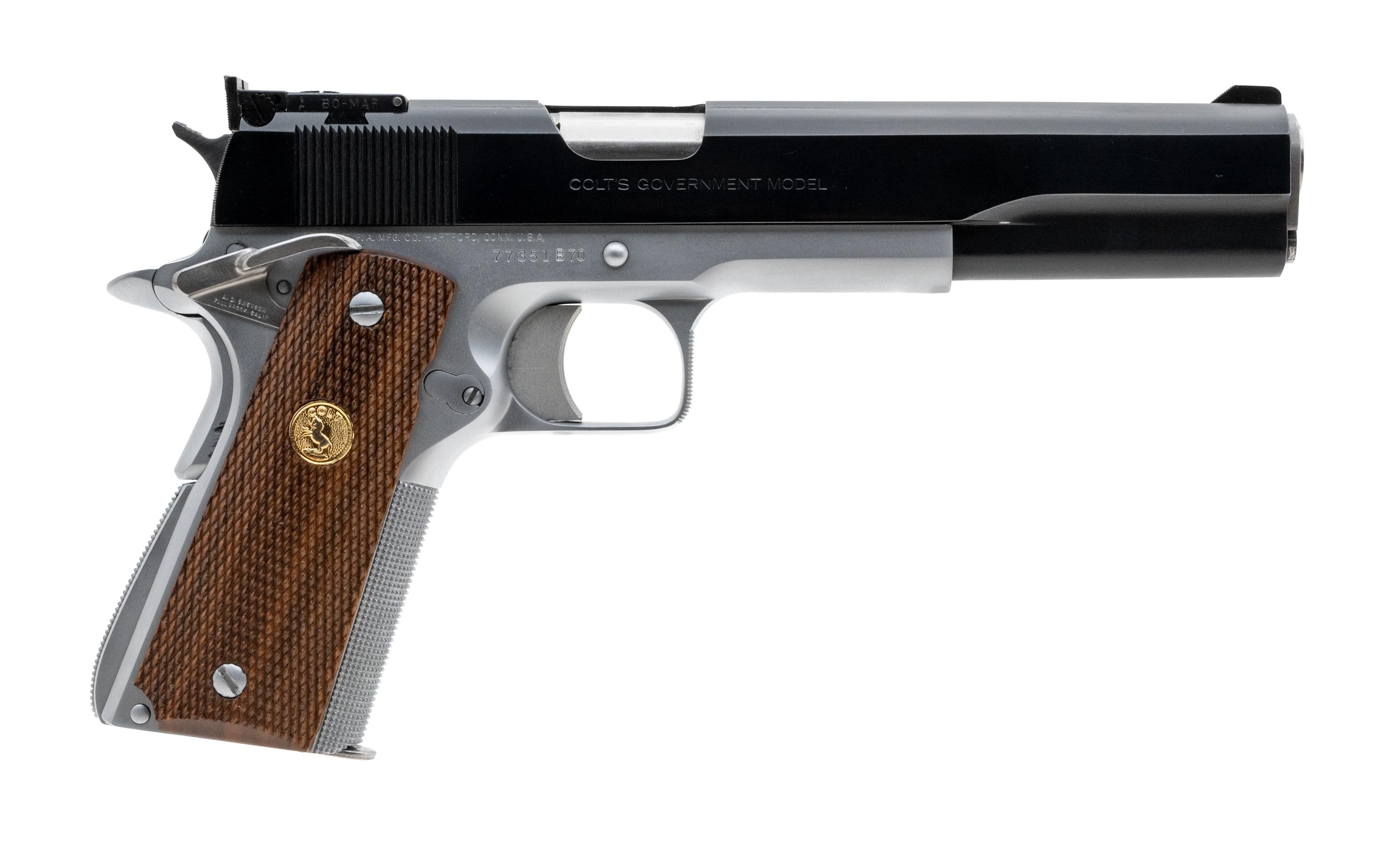 SN: 77351B70. Made in 1981. 45 ACP with a 6" barrel. Outstanding custom longslide 1911 pistol by the late great Master Gunsmith Jim Hoag, signed "J. HOAG" on the underside of the slide. Made on a Colt Series 70 Government, has a Bar-Sto 6" barrel, Bo-Mar sight, Swenson ambi safety, squared and checkered trigger guard and checkered grip frame. The slide is blued and the frame is hard chromed. The gun is in excellent condition, hardly used since built. An excellent example of the late Master's craftmanship.