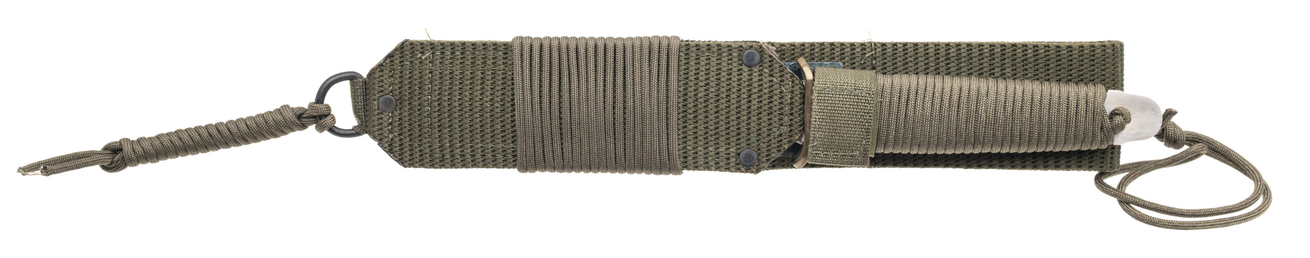 Made by John Ek in Richmond VA circa 1980's. Custom hand made fighting knife with a 6.5" razor sharp blade with half of the top edge sharpened, brass cross guard, full tang wrapped in paracord with a 12.5" OAL. Comes with original box and paracord wrapped nylon sheath. Overall in excellent condition.