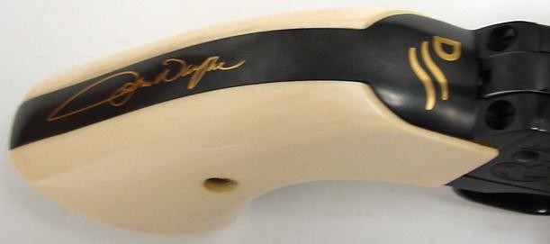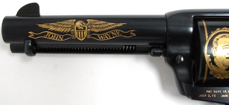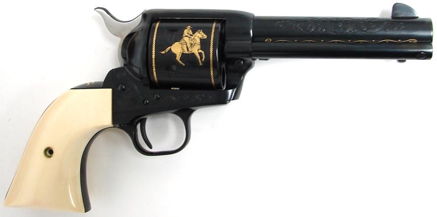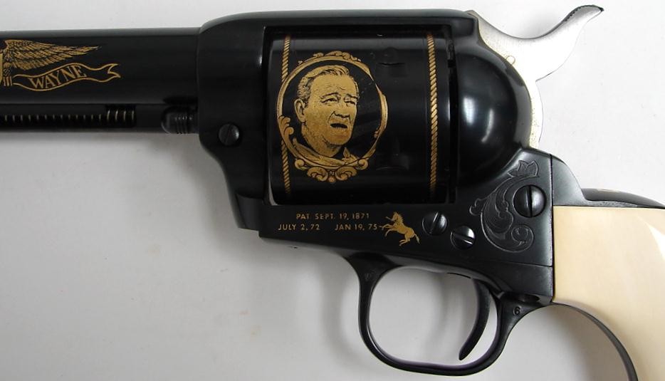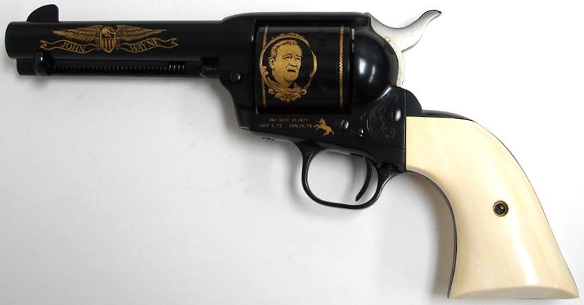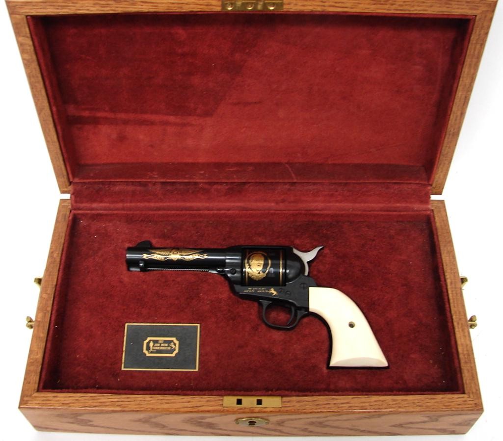 John Wayne .45 LC caliber Colt Single Action commemorative revolver issued in 1982 with gold inlays, ivory grips and presentation case. Scarce model, only 3100 made.