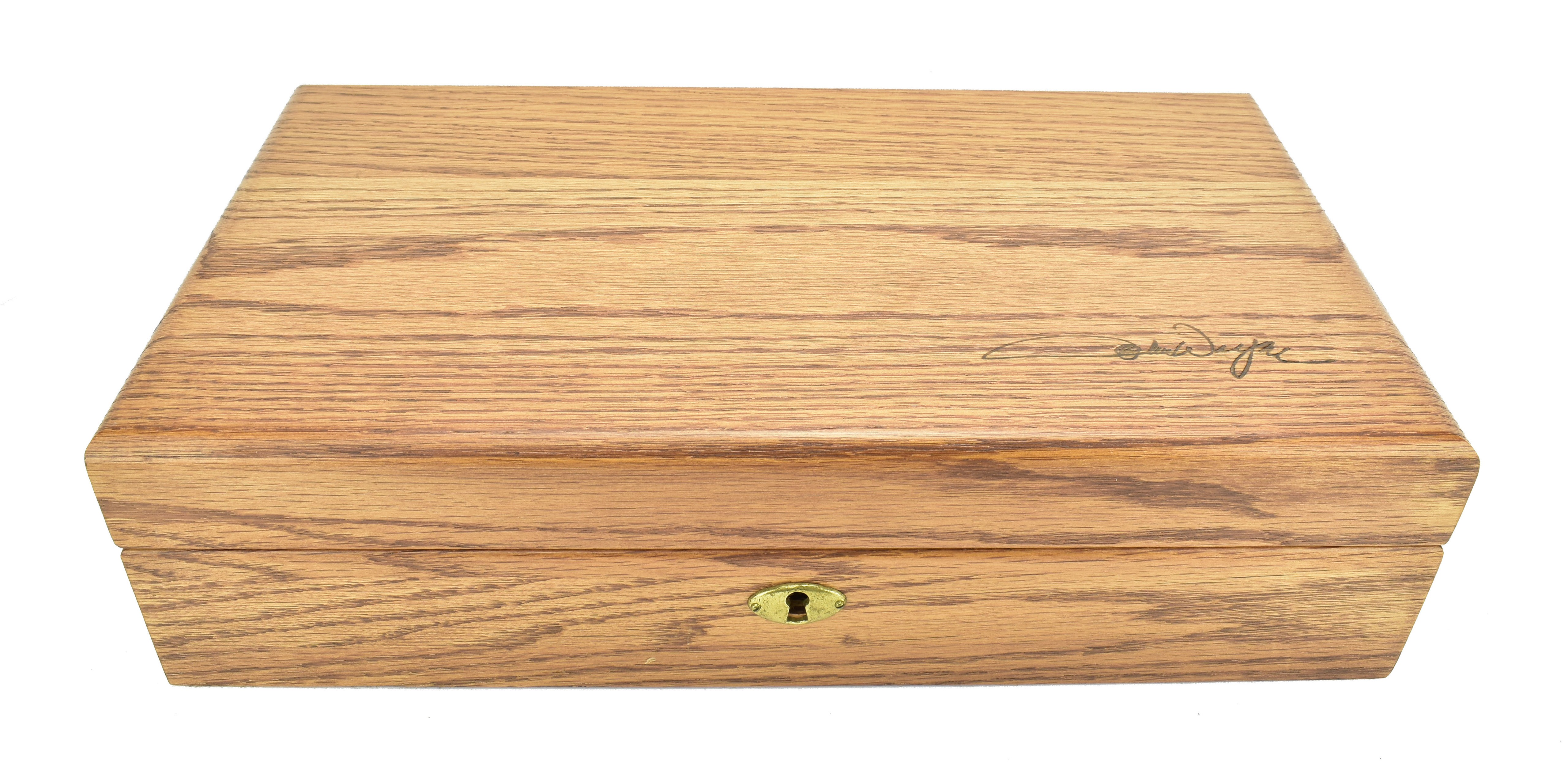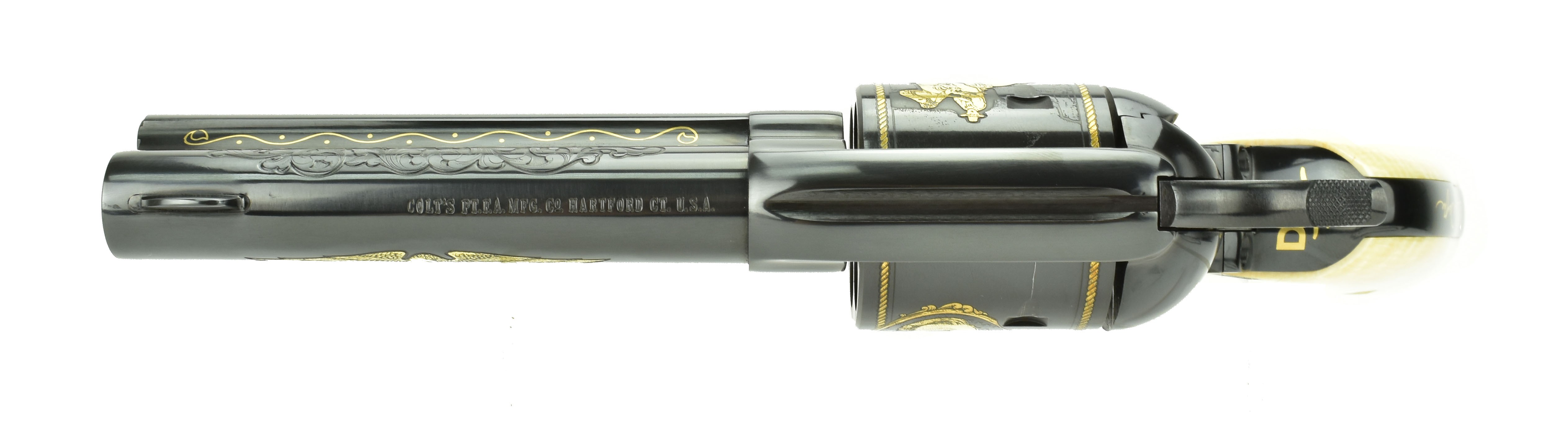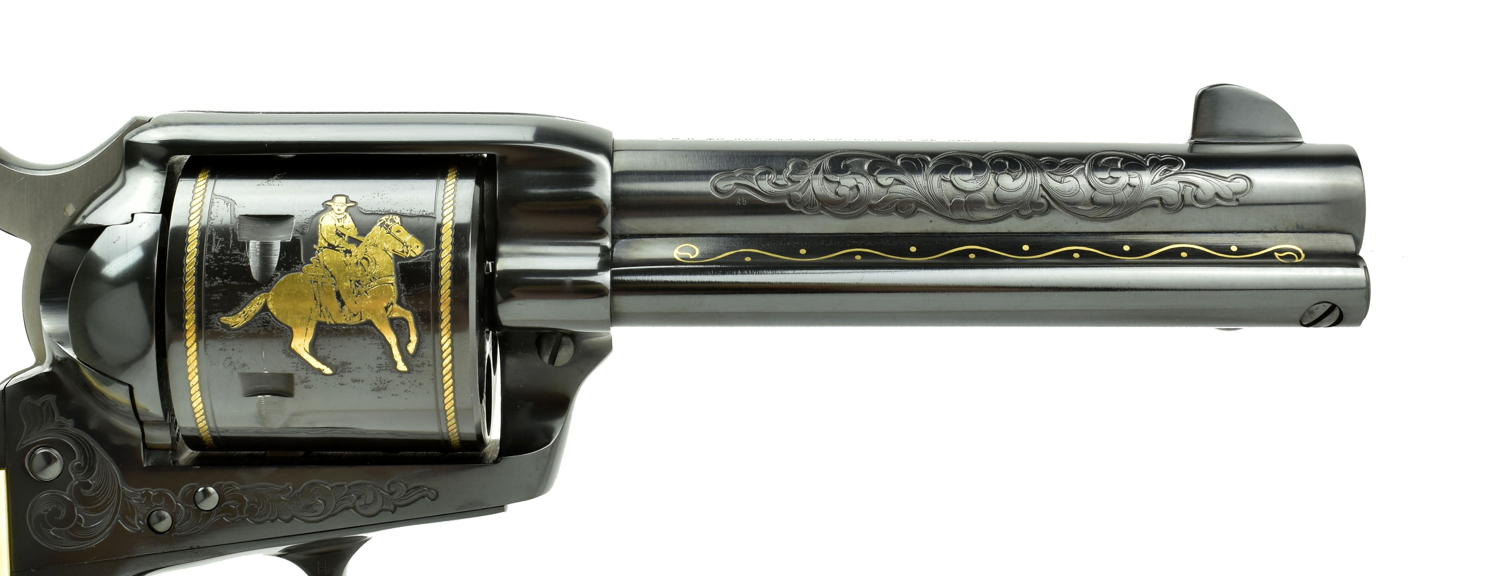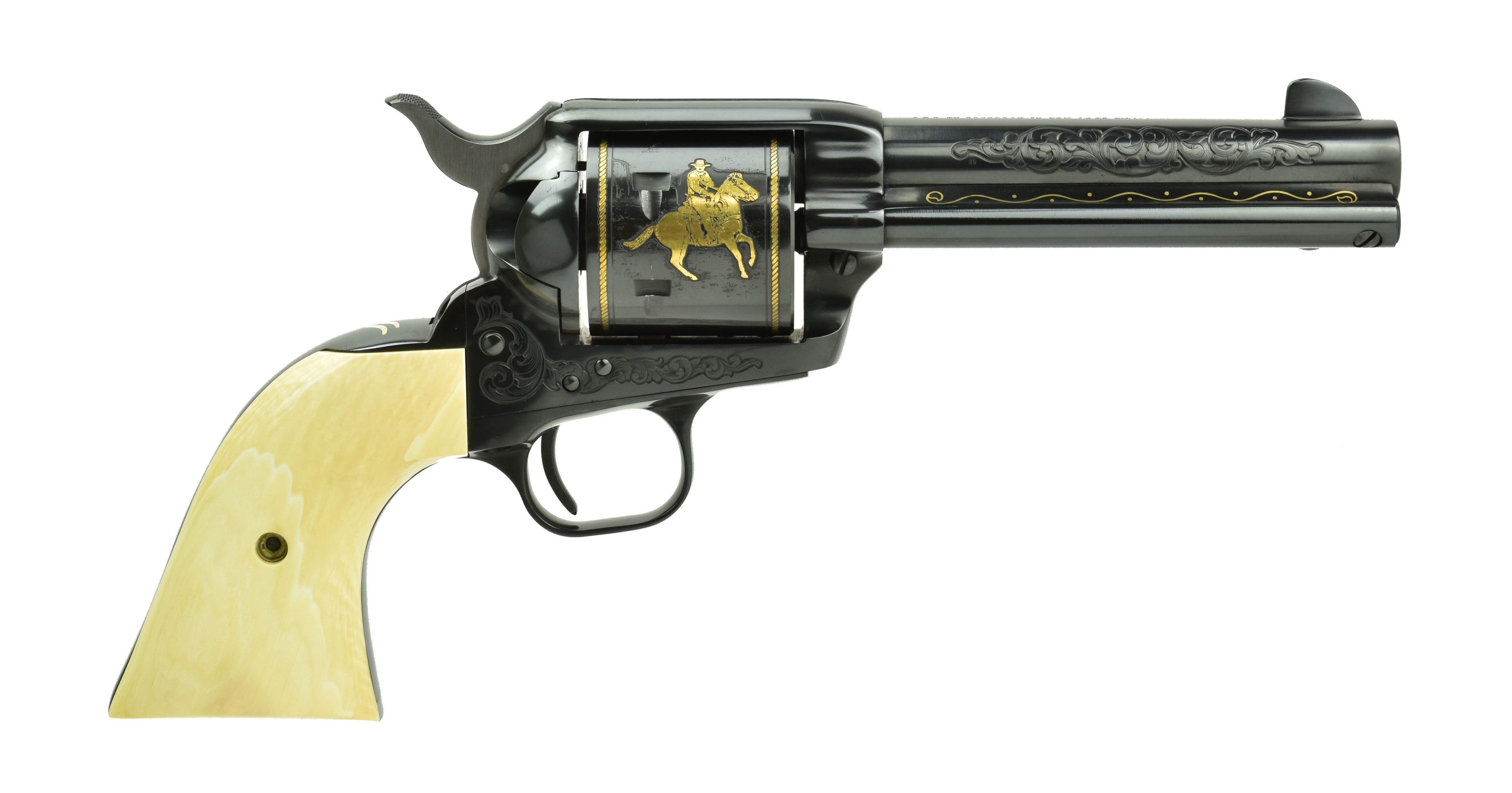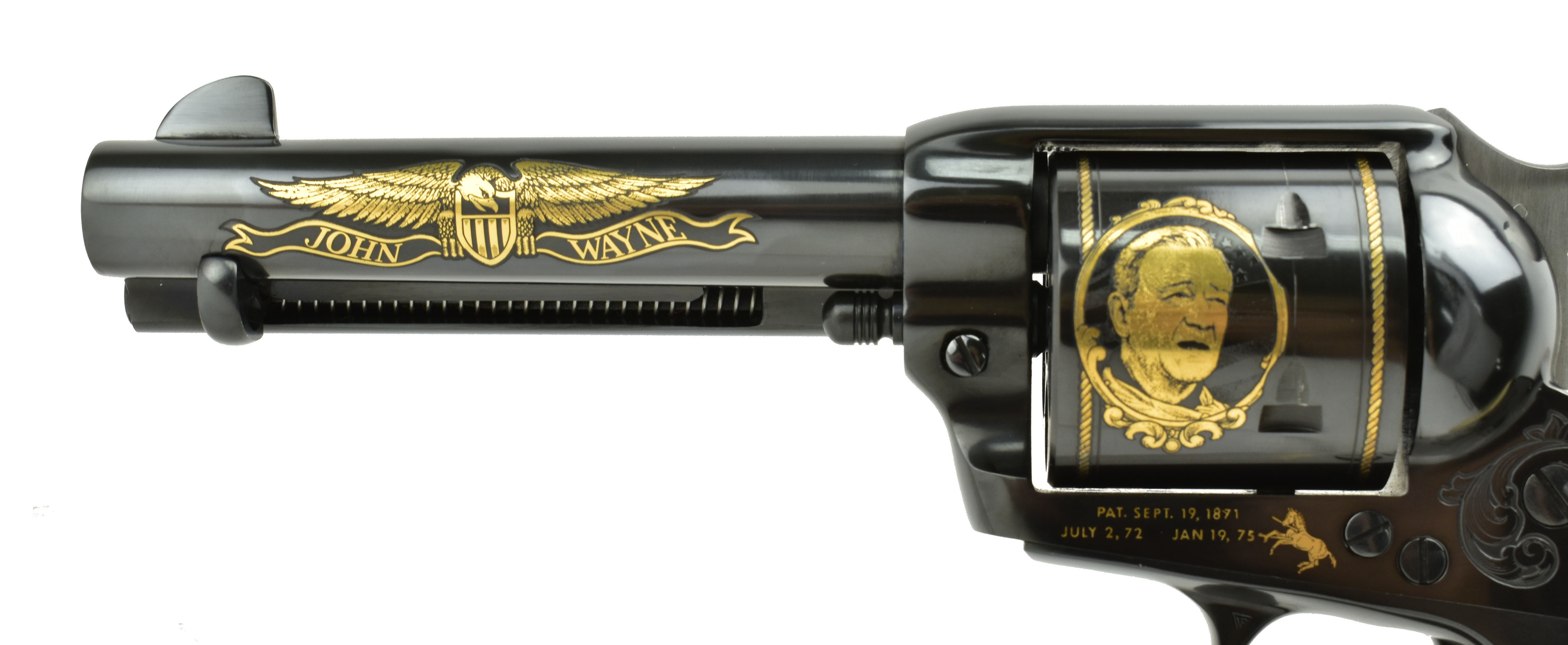 John Wayne Commemorative 1982 Issue. Colt Single Action Army .45 caliber revolver. John Wayne Commemorative 1982 Issue with gold decorations and ivory grips. With wooden case.