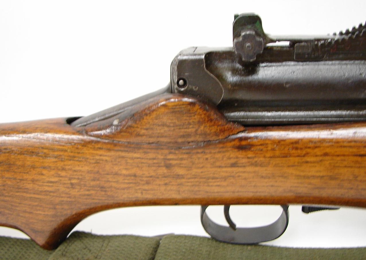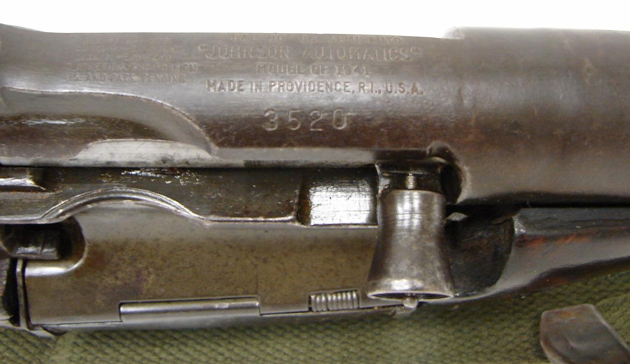 Johnson Arms 1941 .30-06 SPRG caliber semi auto rifle. Very nice gun with very good finish on the barrel. Magazine shows slight thinning of the blue. Stock has been refinished and there is a repaired crack at the right hand side of the receiver. This is one of the guns in .30-06. Bore is excellent and action works perfectly. Very nice gun and hard to find.