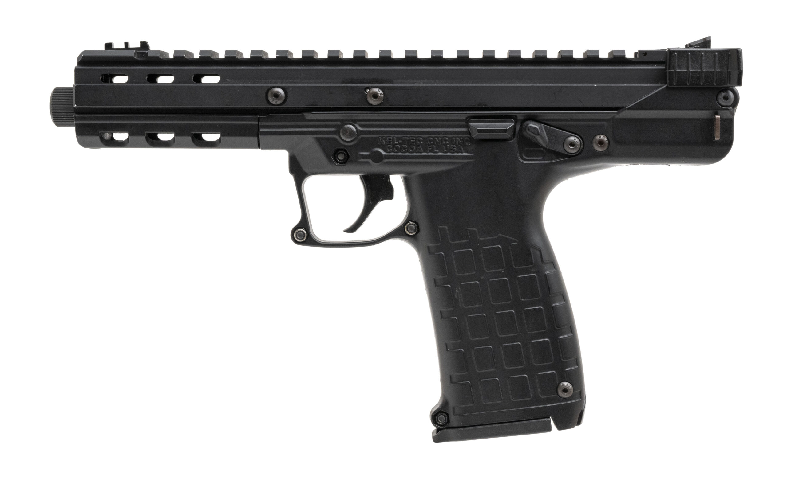 SN: MFX19. Modern production. Polymer frame semi-auto rimfire pistol made by Kel-Tec. 5.5" threaded barrel chambered for .22LR. Good condition overall with some handling marks in the black metal finish. Bore is excellent. Front fiber-optic insert missing. Features barrel shroud with M-lok slot underneath for mounting accessories, plus full-length optics rail.