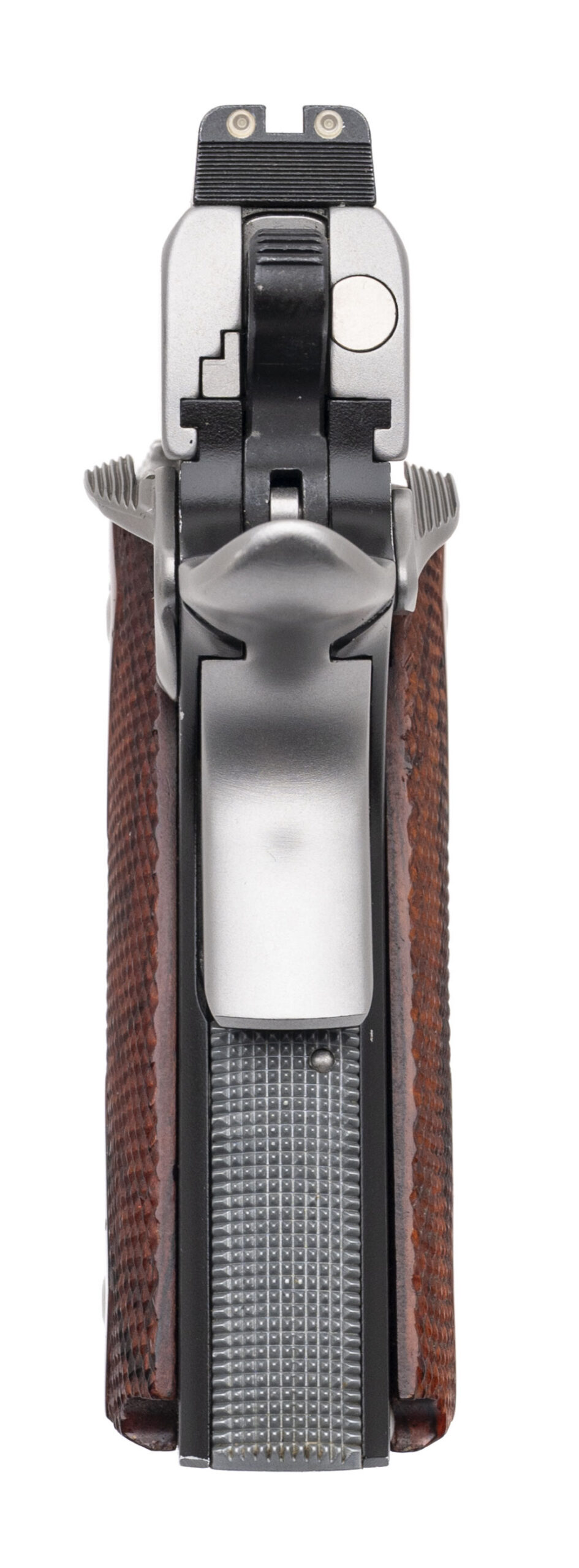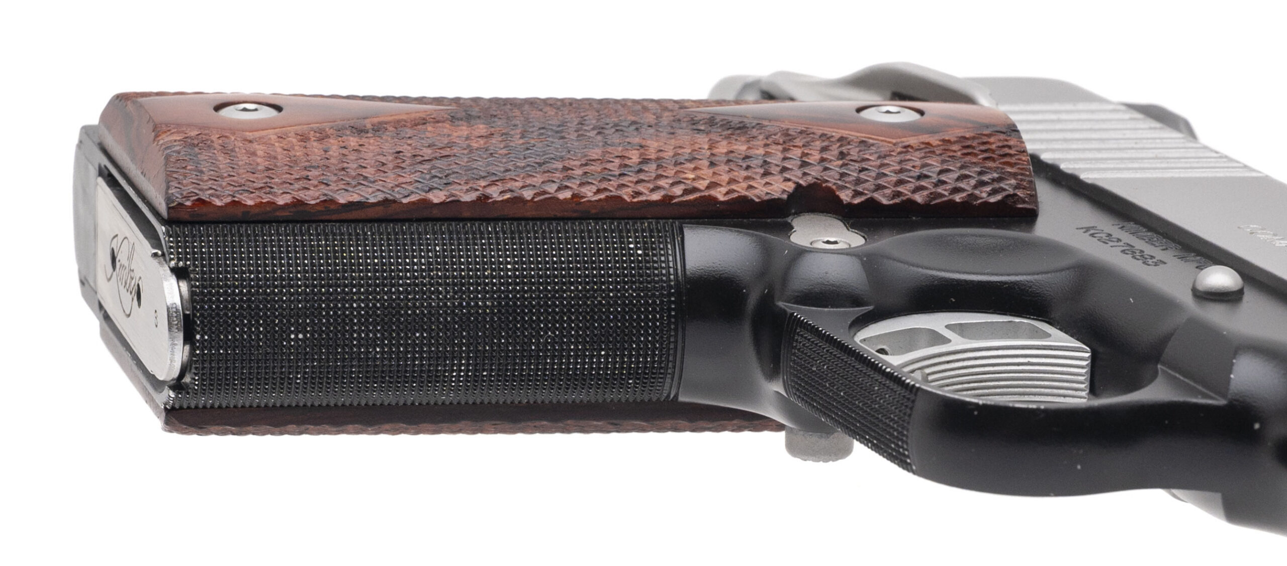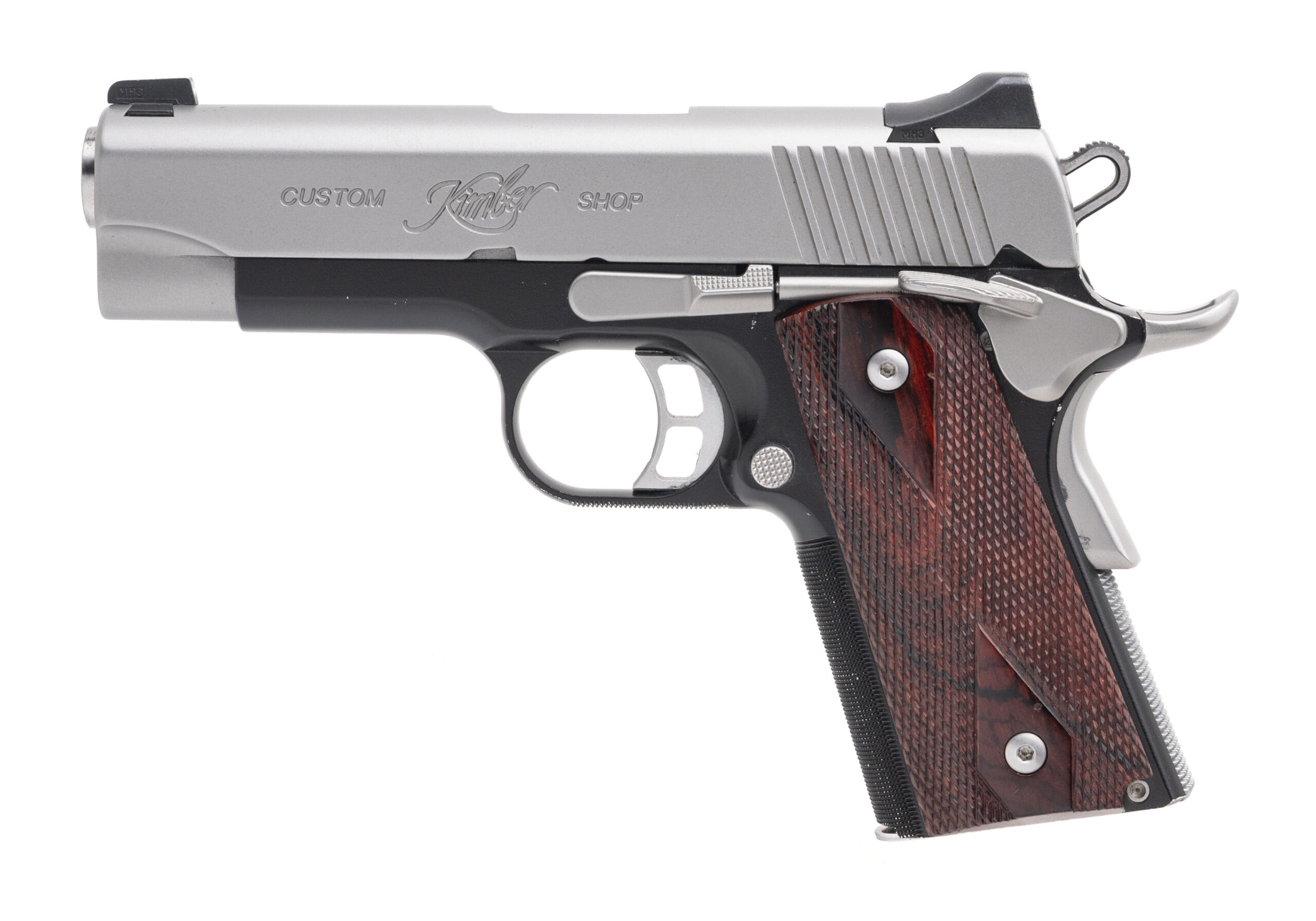 SN: KC27683. Modern production made by Kimbers Custom Shop. Commander size 1911 in 45acp with a 4" barrel, 3 dot night sights, aluminum frame, two tone finish with a stainless slide and checkered rosewood grips. Some light handling marks, overall in very good condition.