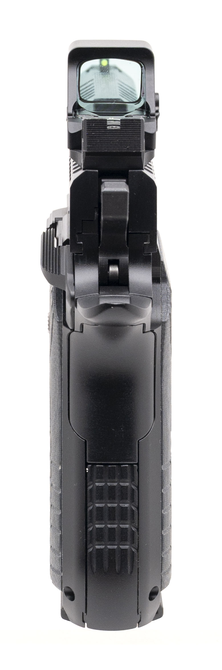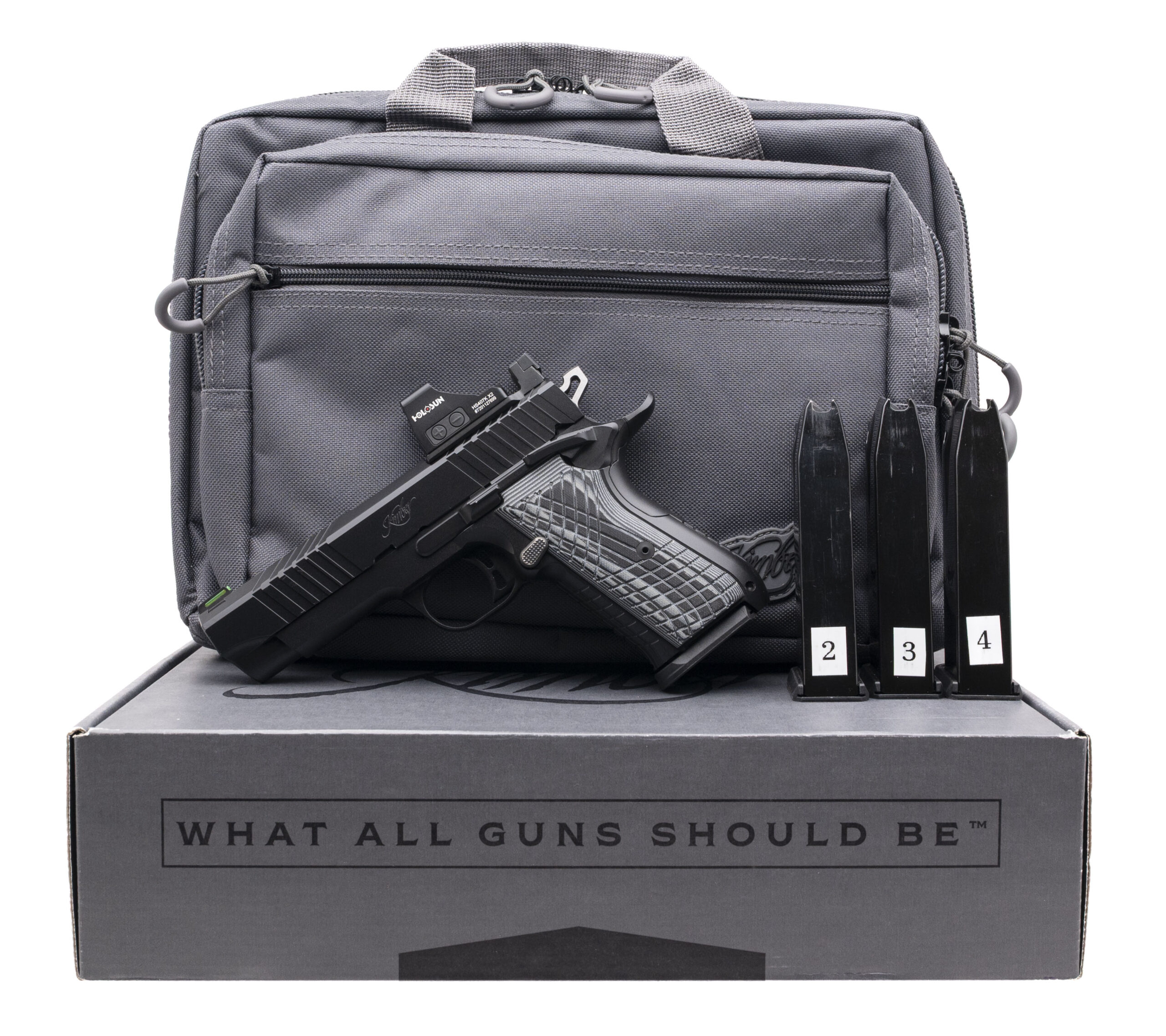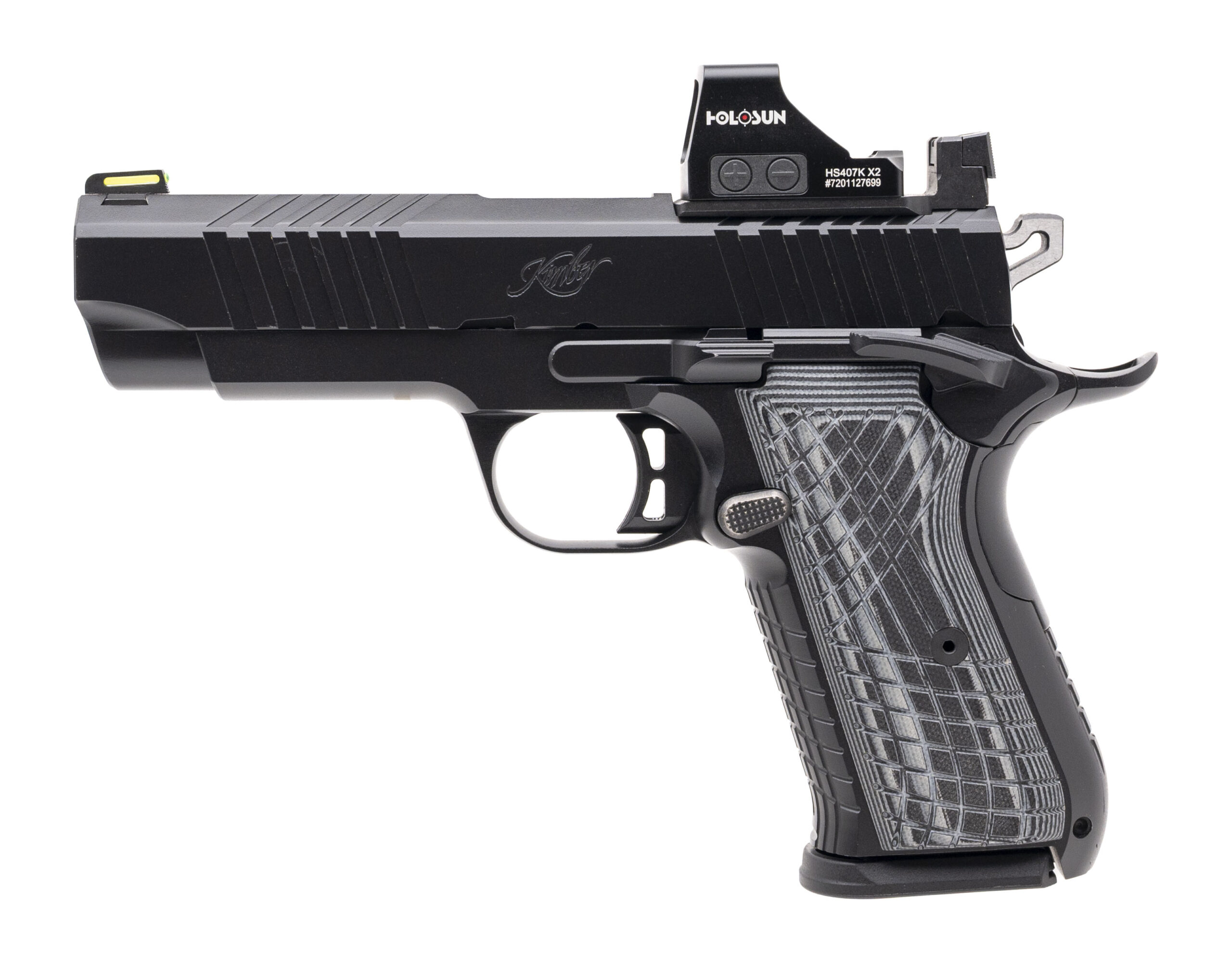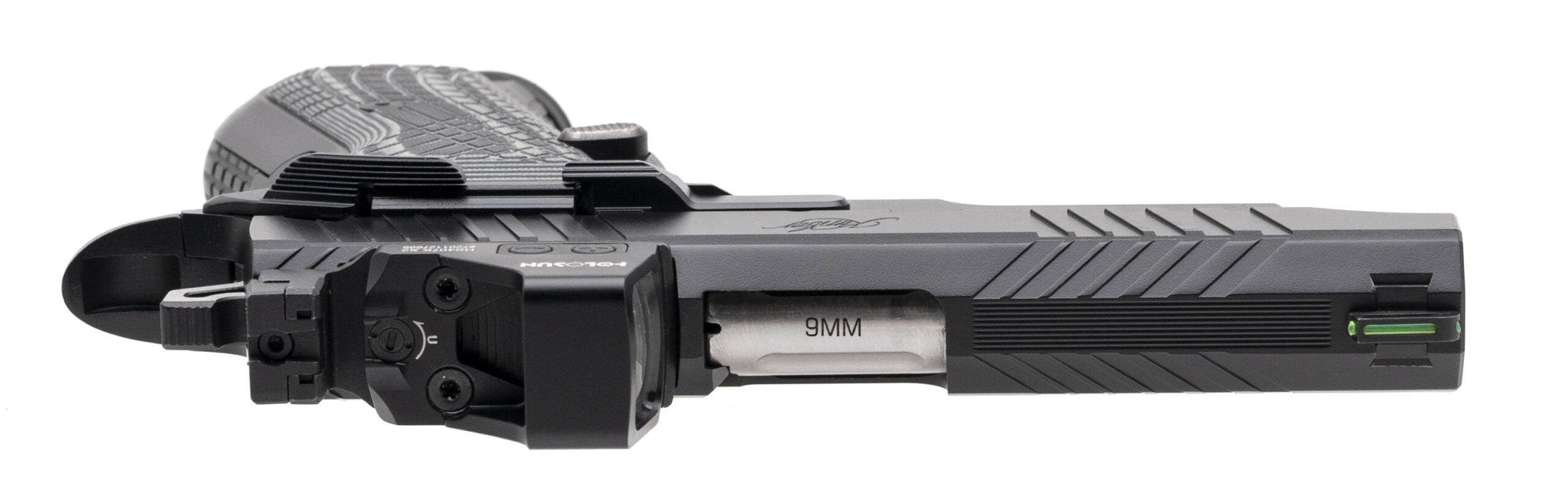 SN: SD001929. Modern production, 9mm with a 4.09" fluted barrel. Bore is excellent. Single-action only alloy frame pistol with a Holosun 407K X2 red dot sight, fiber-optic front sight, co-witnessed rear sight, manual thumb-safety, matte black finish, and G10 grips. Includes 3 additional magazines, original range bag, and original box. Overall condition is excellent.